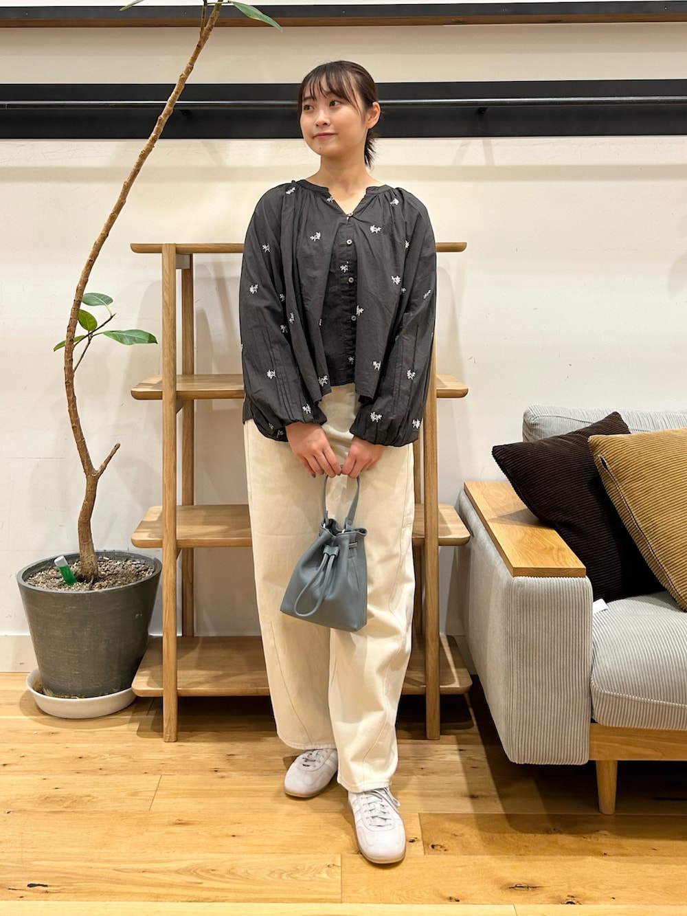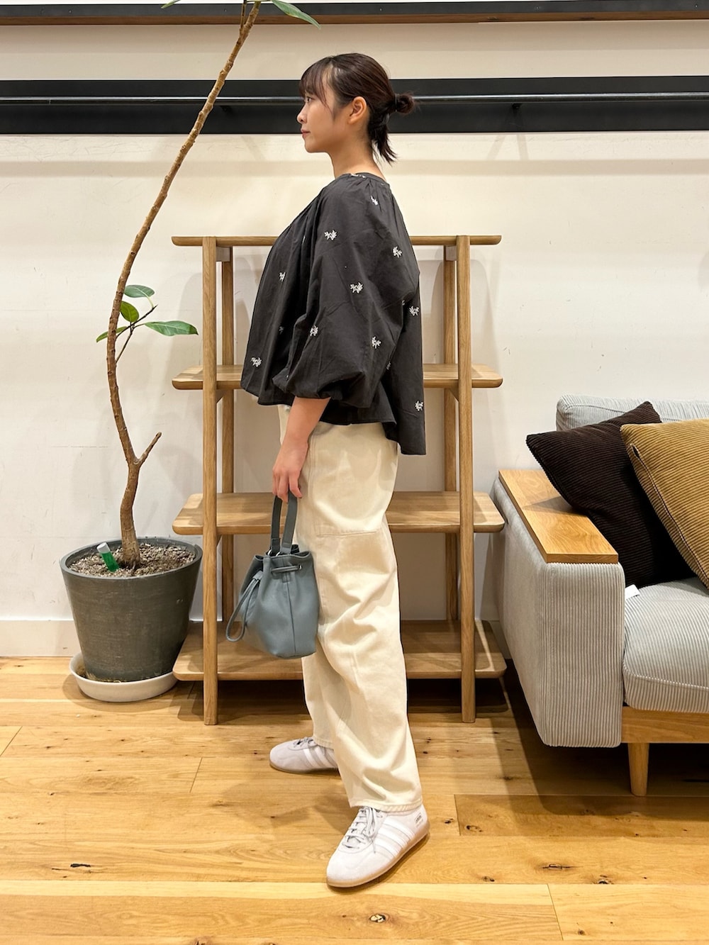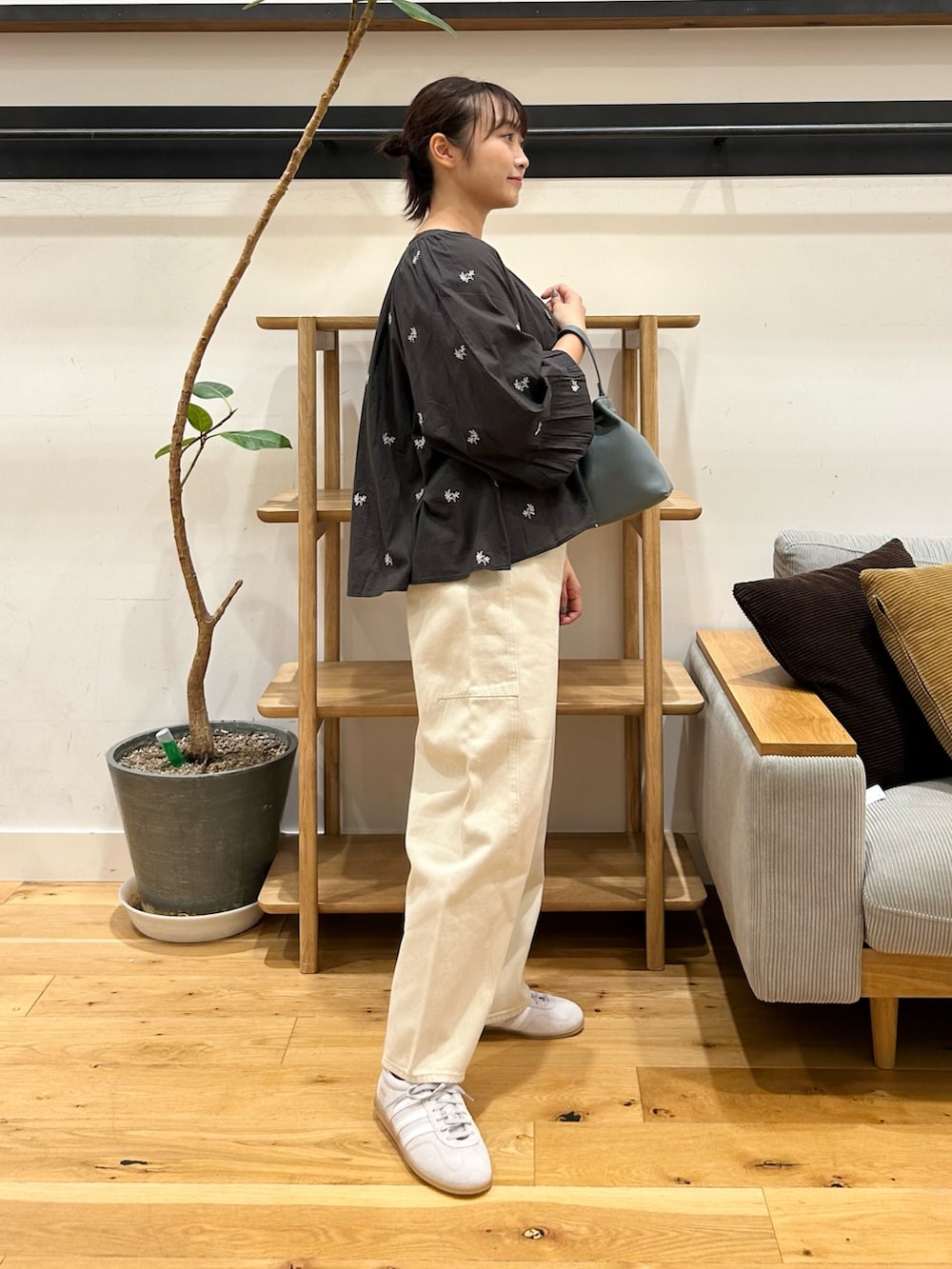 シルバーの刺繍とフレアシルエットがかわいいブラウスは、軽やかな綿生地で、湿気も気温も落ち着いてきた時期にぴったりです。袖口にゴムが通っているので、袖を捲って抜け感プラスしやすいのもポイントです。