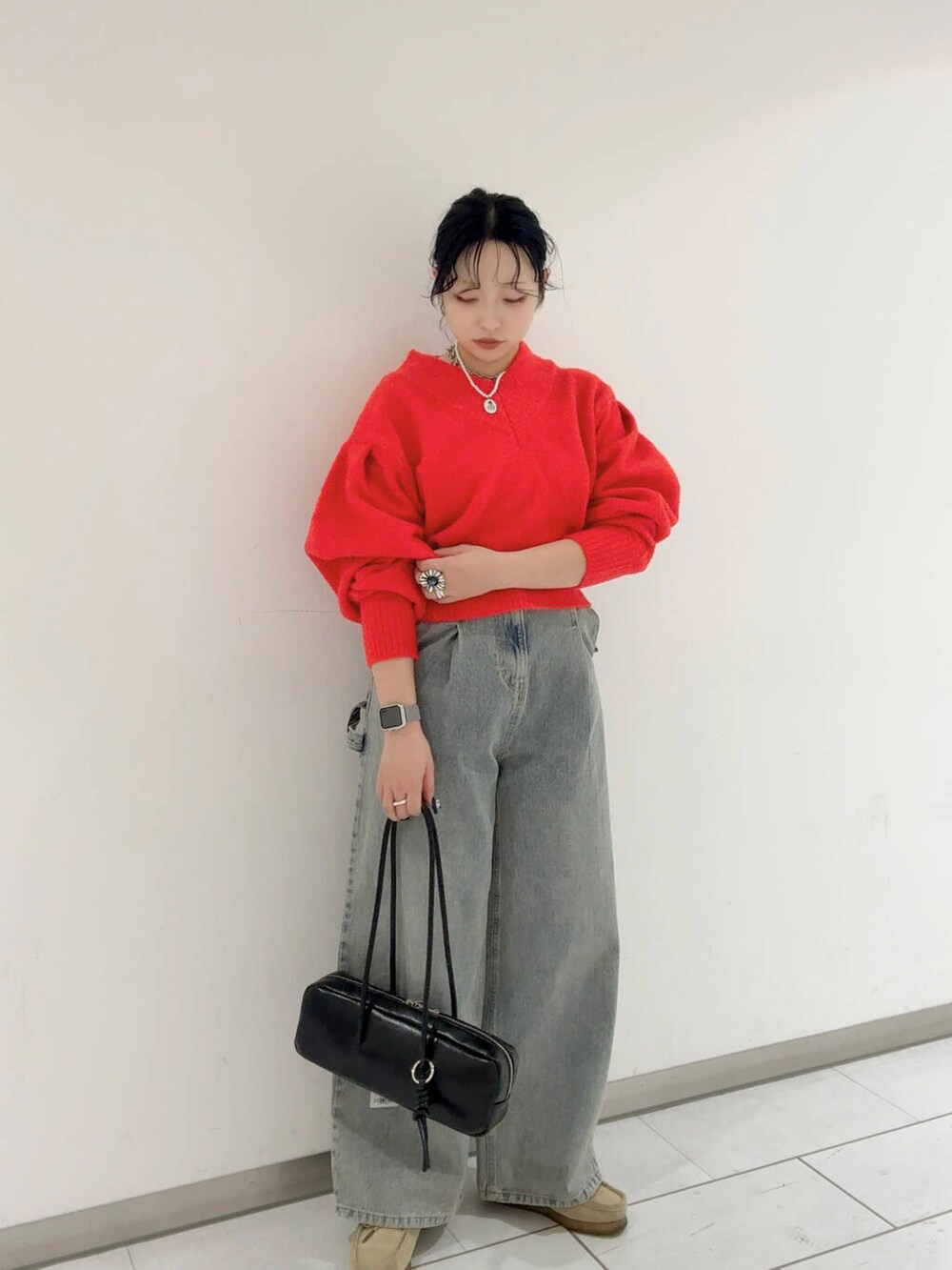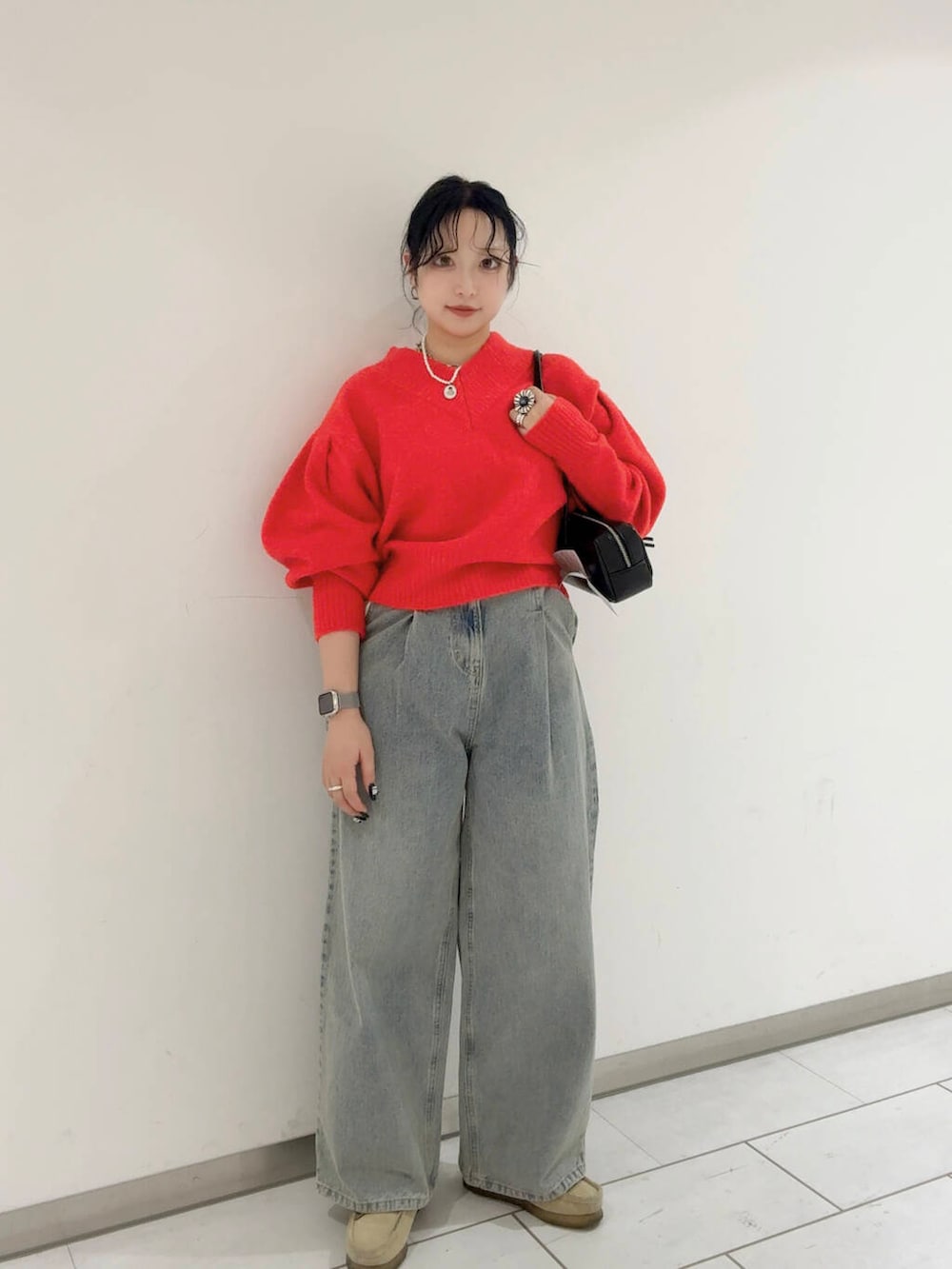 赤ニットにデニムでカジュアルに❗️