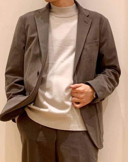 肌触りの良い細畝のコーデュロイです。生地感は厚めで秋冬に使っていただけます。今回はSサイズを着用しています。