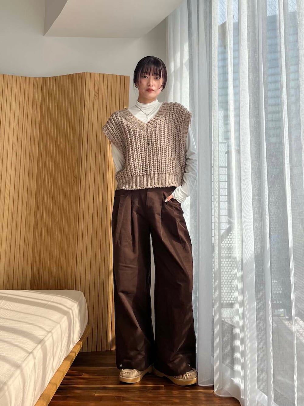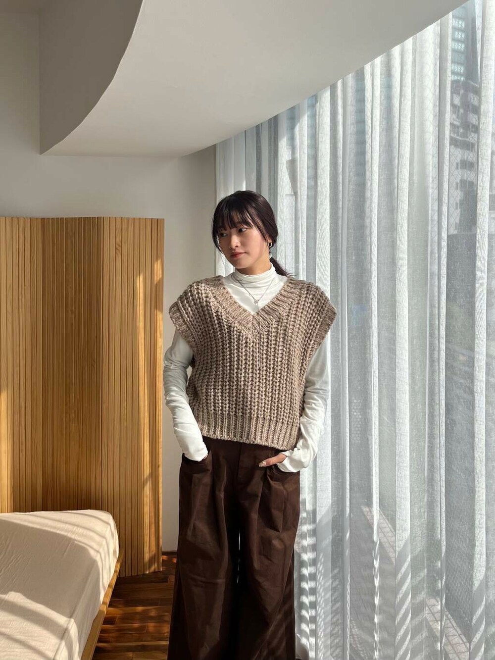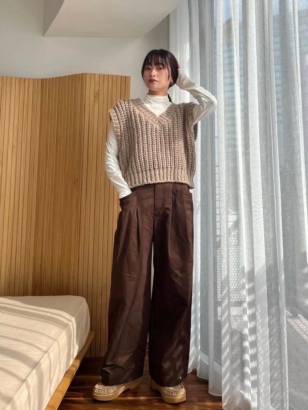 ニットベストがゆったりしてるので、中にはピッタリとスキントップスを合わせて腕や首周りを細く見せてダボッと見えないようにしたのがポイントです🌟