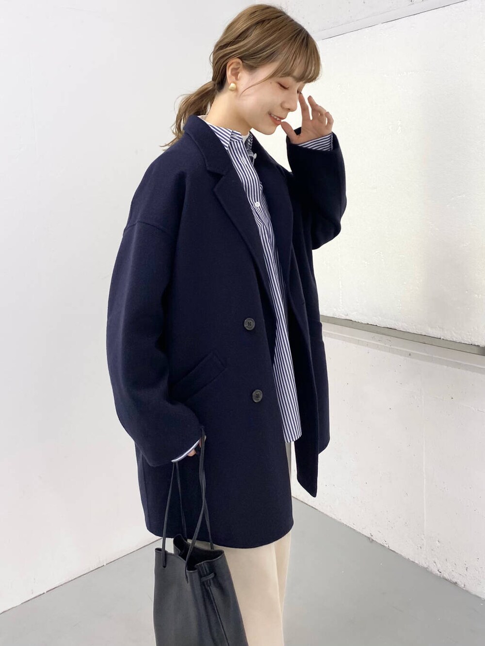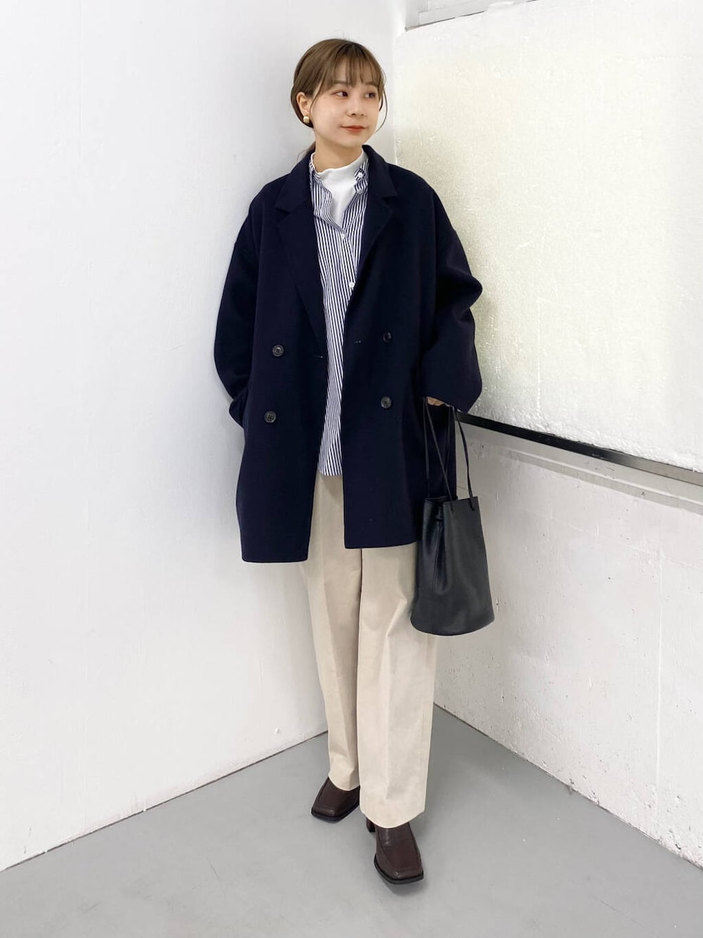 今回はストライプのシャツを合わせてハンサムな印象にまとめてみました。