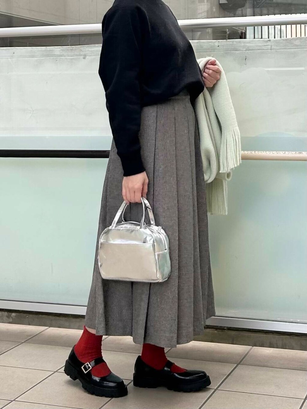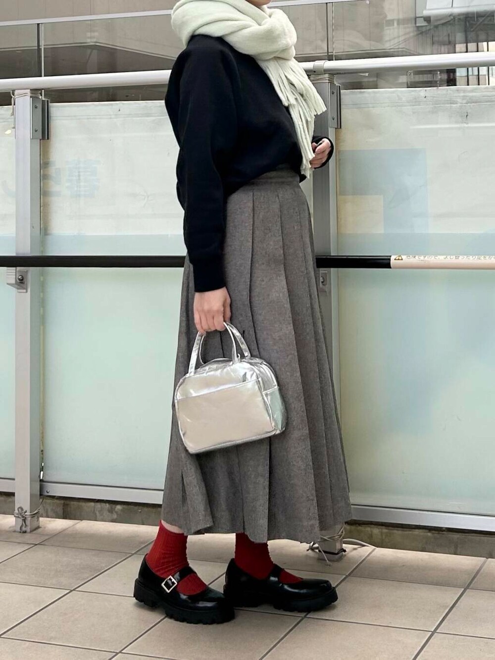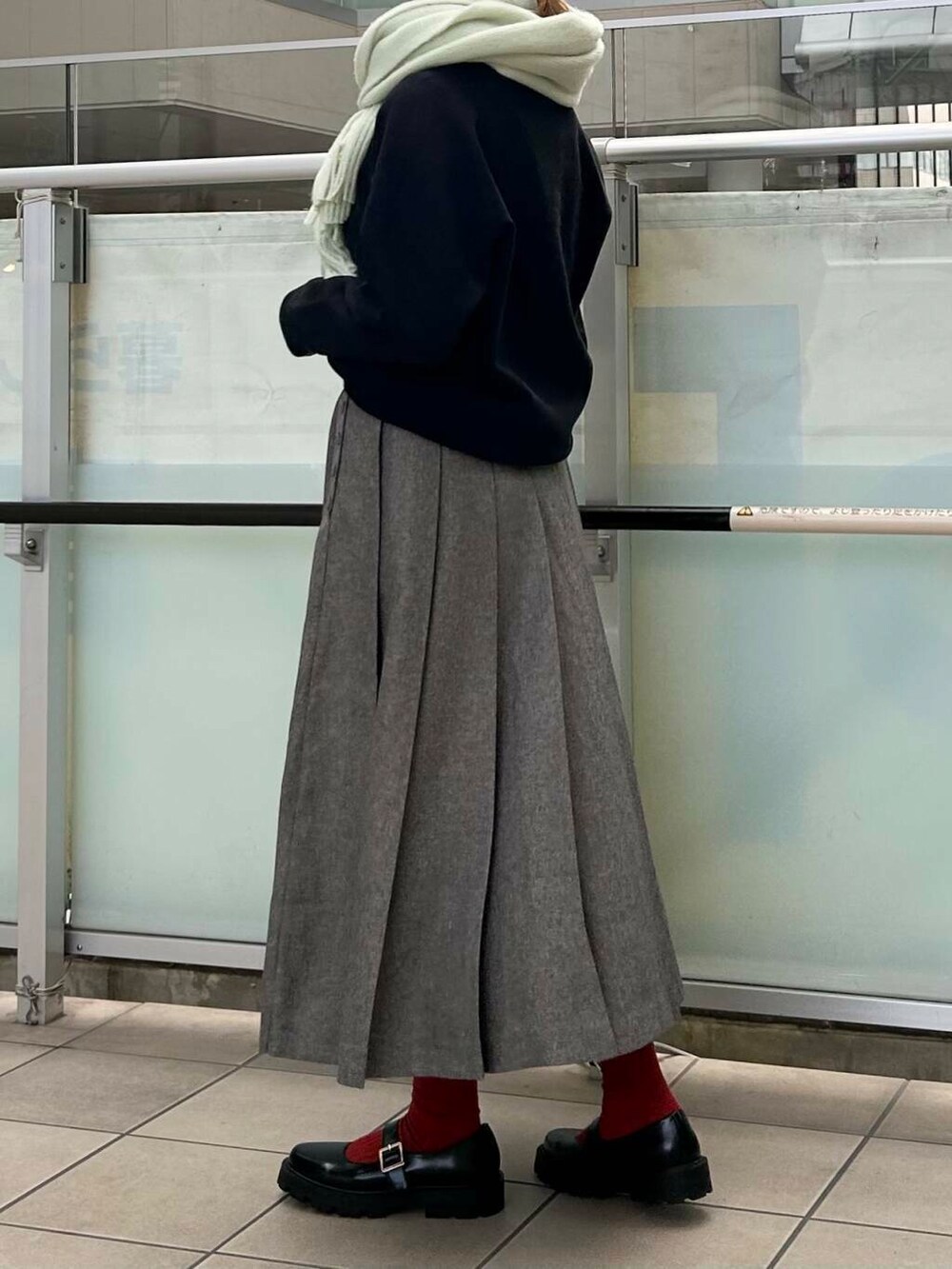 アウターを羽織らずボリュームのあるマフラーを合わせました。肩からかけても暖かいですよ。