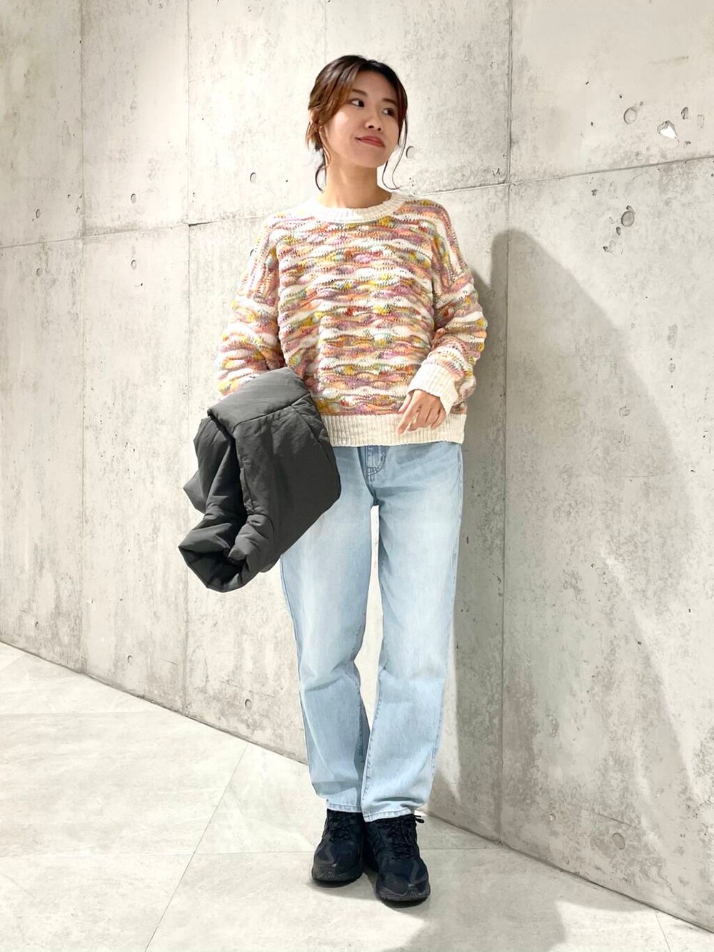ミックス糸がインパクトのあるニットを使ったシンプルスタイルです。