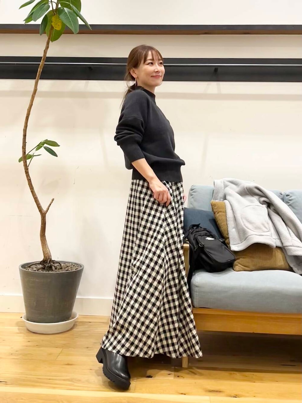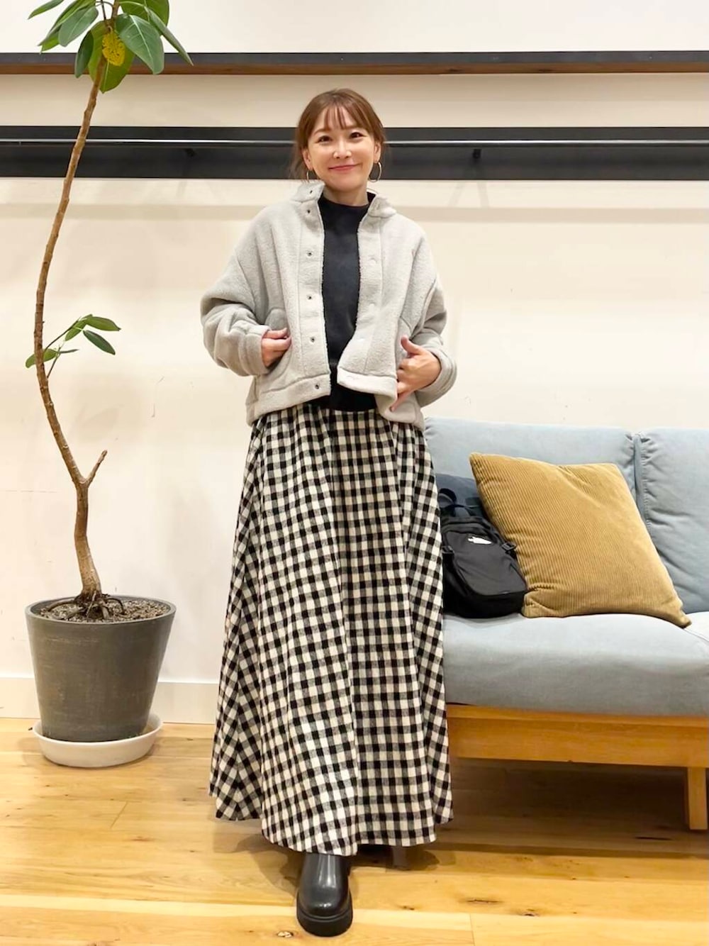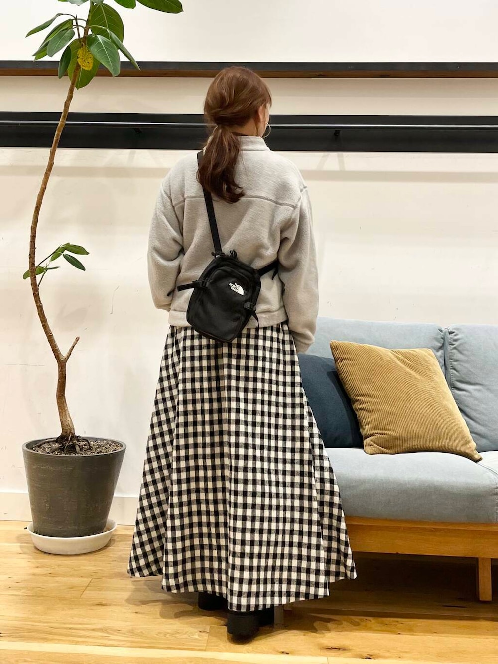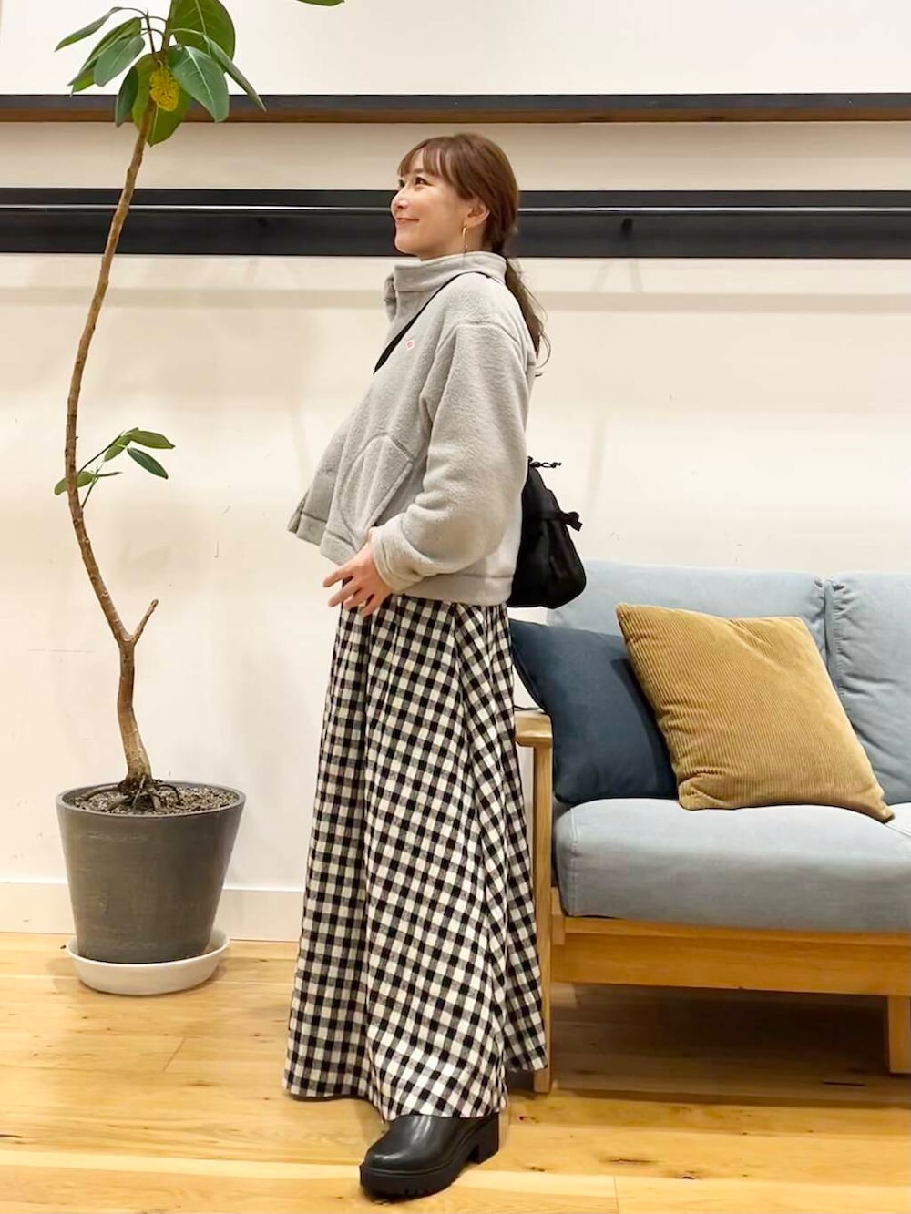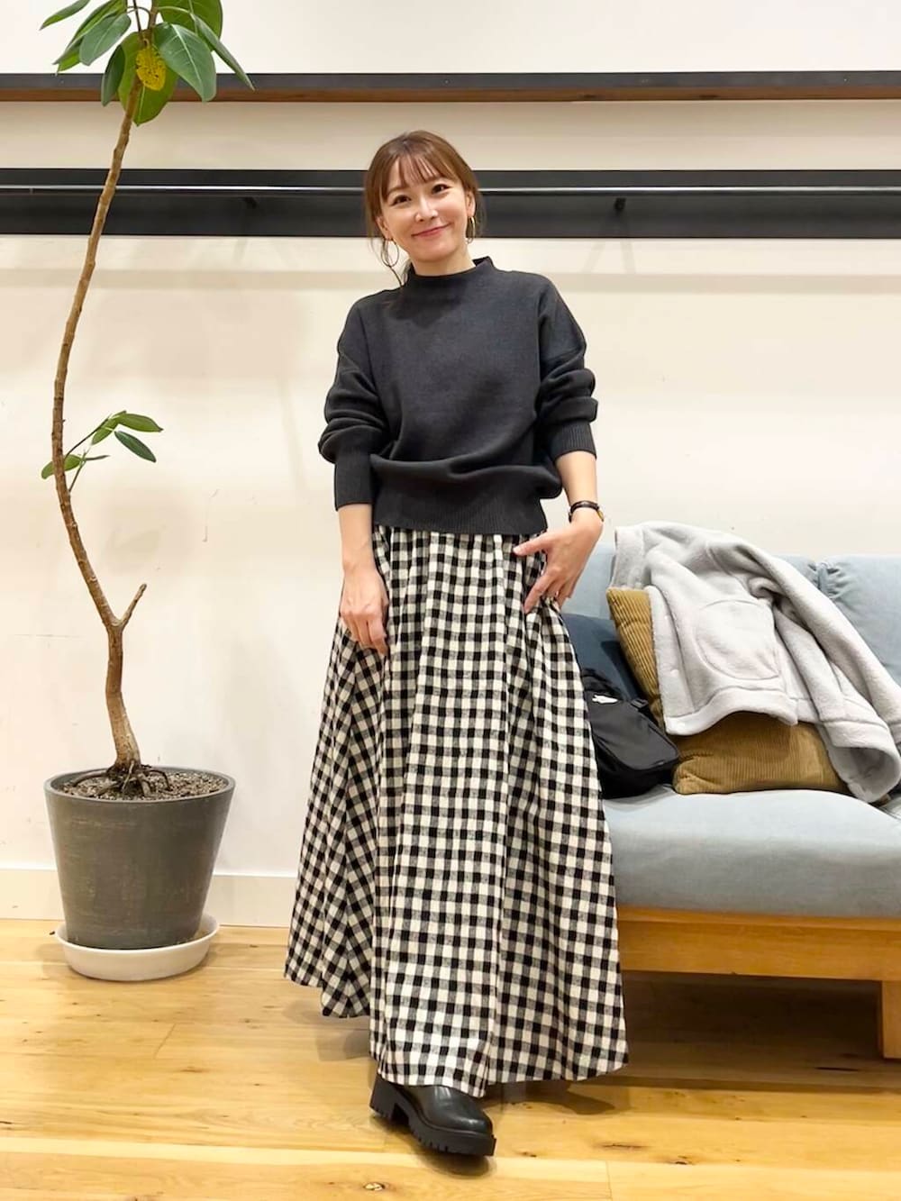 裾に向かって綺麗に広がるフレアシルエットが大人っぽくもギンガムチェックがカジュアルで可愛らしい雰囲気です。