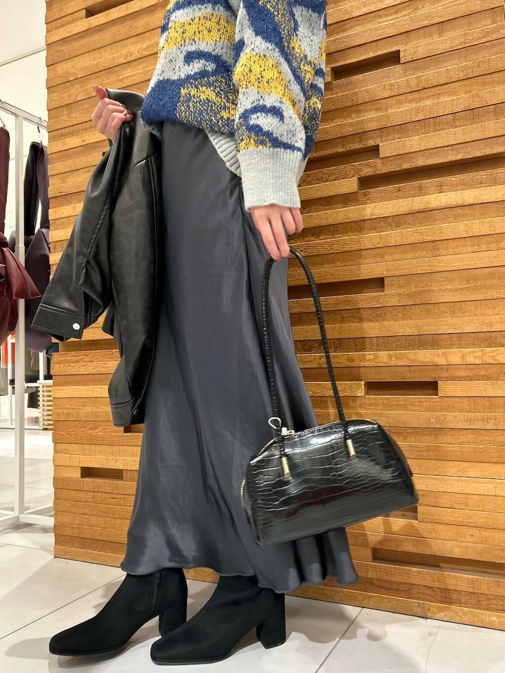 ニット自体が目を惹く主役級なのでボトムはシンプルにデニムや無地のスカートを合わせ、是非ニットを目立たせて着用していただきたいです。