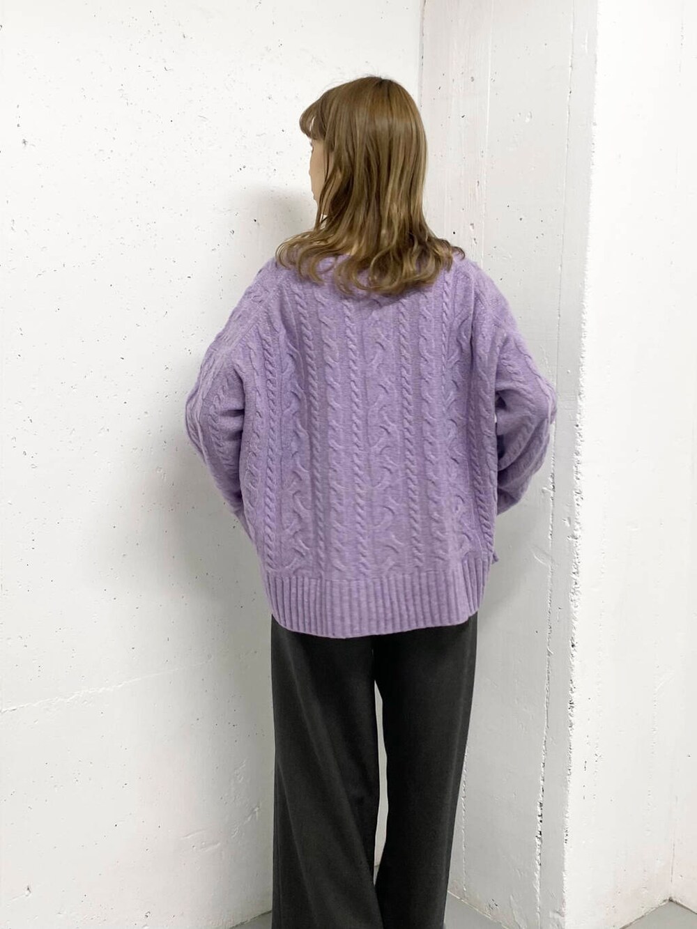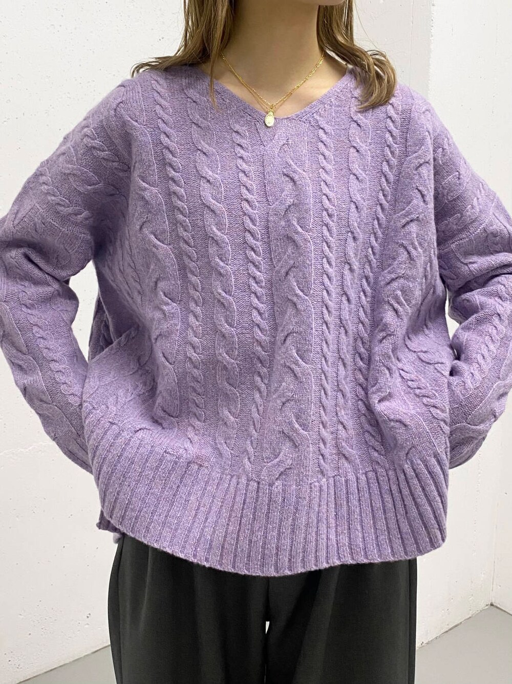 アラン柄の編み目が冬らしい雰囲気ですが、分厚すぎない軽やかな印象のニットなので