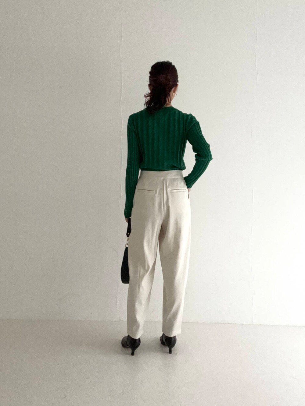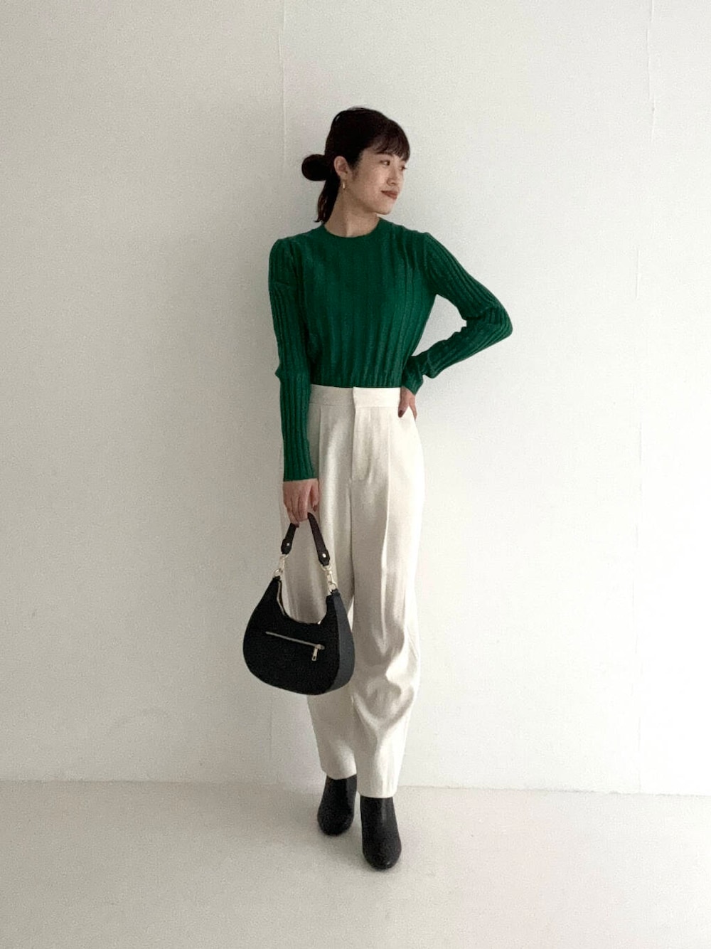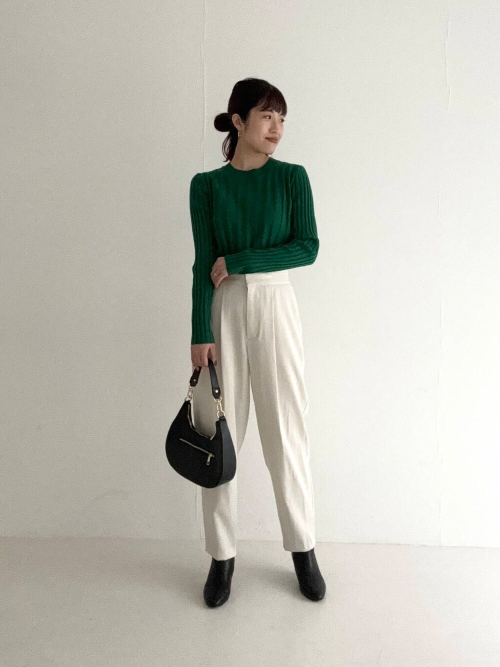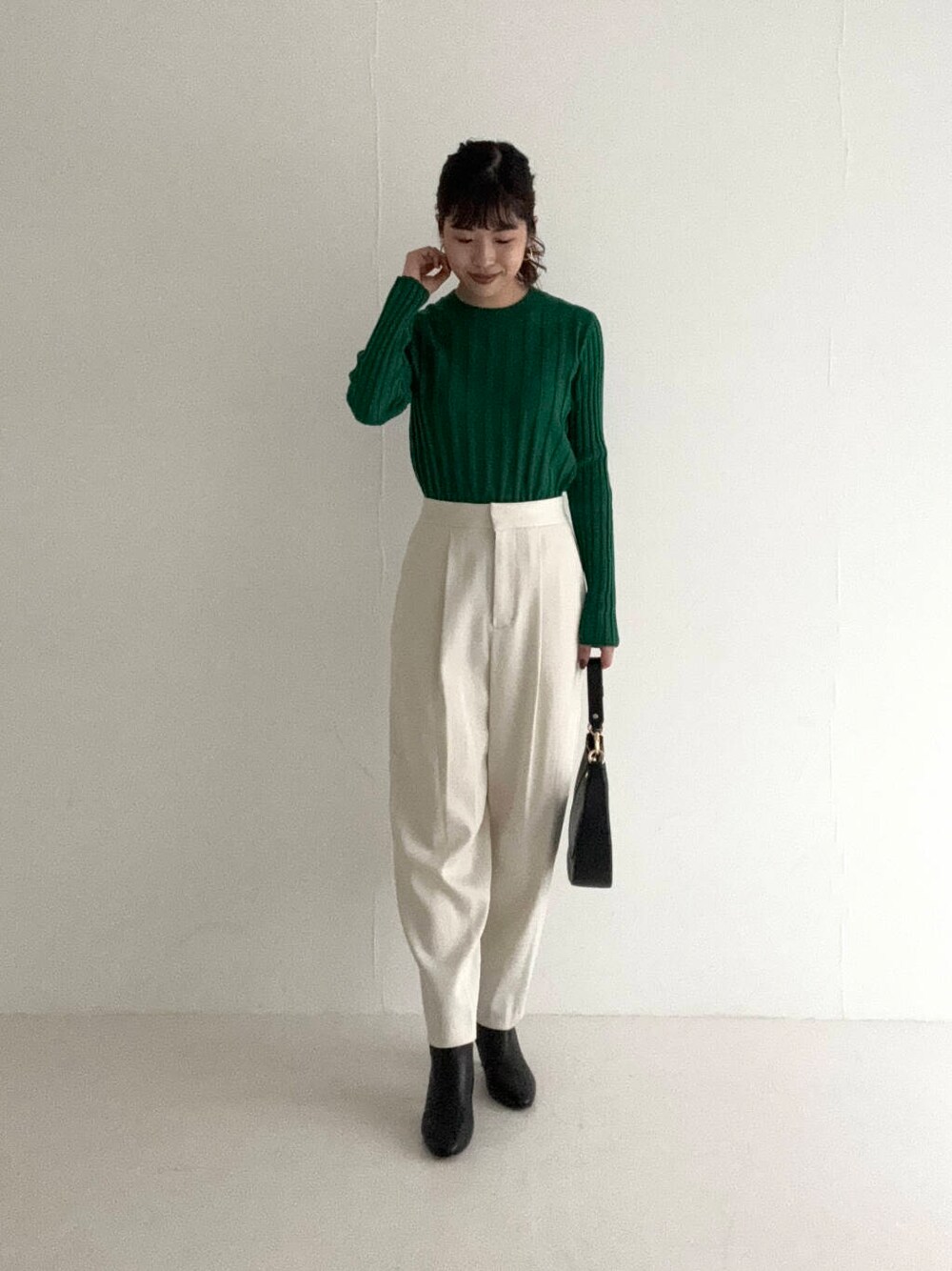 目を惹くGREENカラーが新鮮な、伸縮性抜群のリブニットを着用しました♪