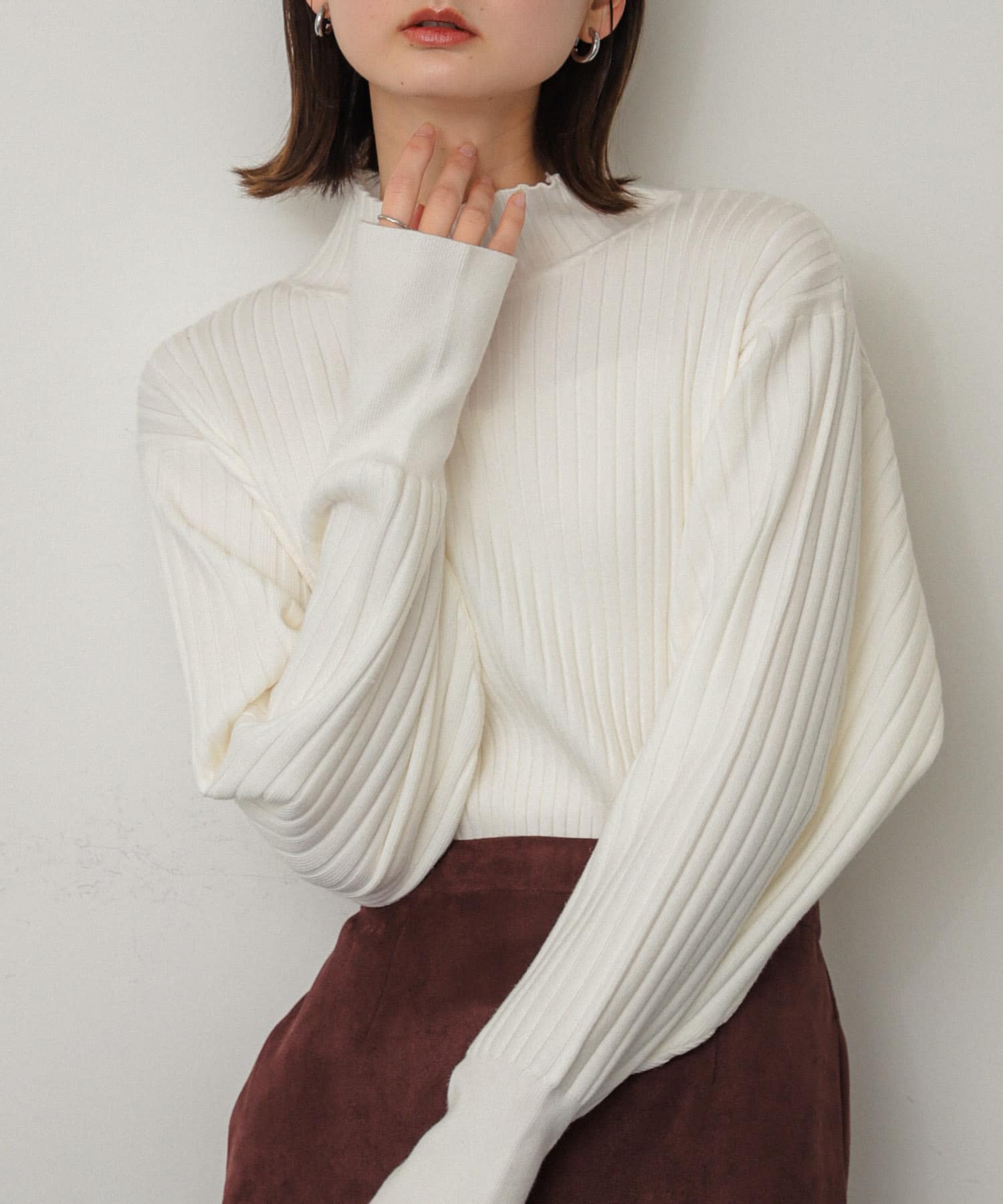 トップスのニットは袖がふんわりですごく可愛いです〜😍1枚でばっちり着映えしますが、サムホール付きなのでアウターと合わせたコーデも楽しめちゃいます🥹✨️✨️これからの季節大活躍まちがいなし🙆♀️