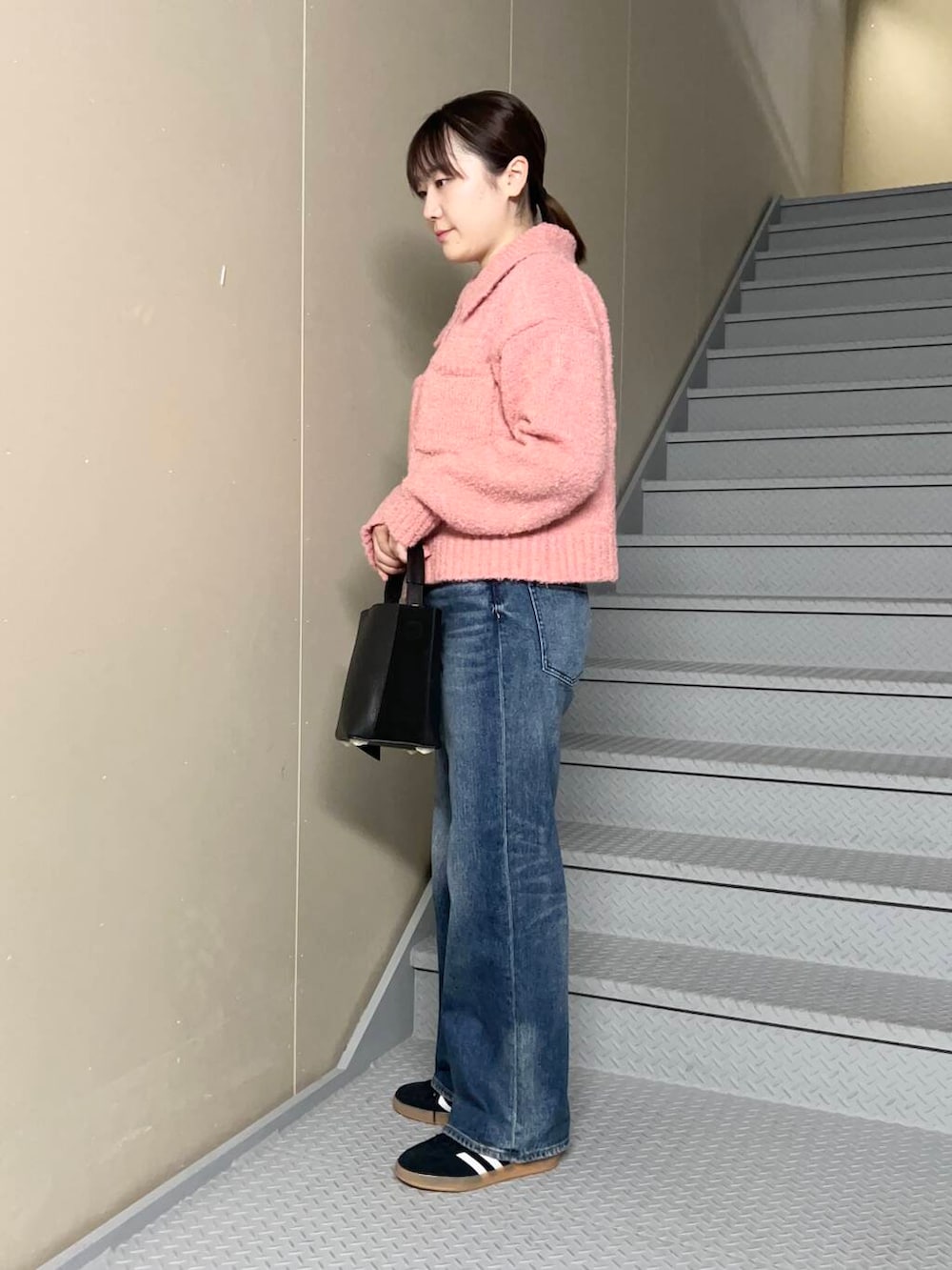 今年のトレンドカラーであるピンクの襟付きブークレットニットシャツ。