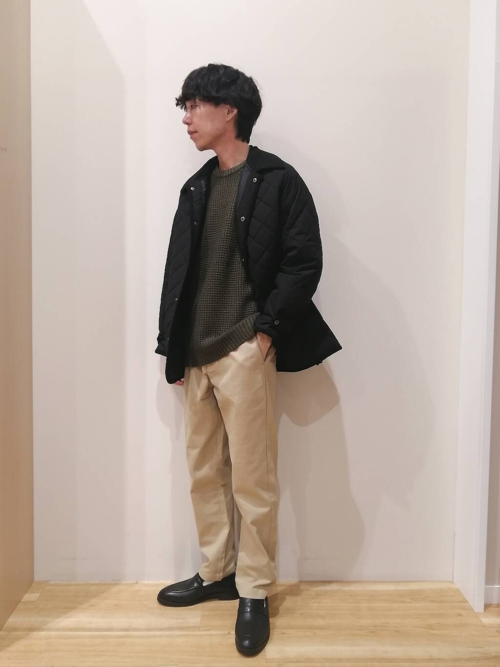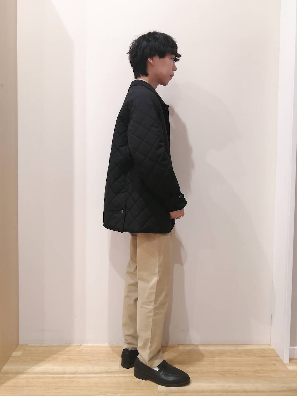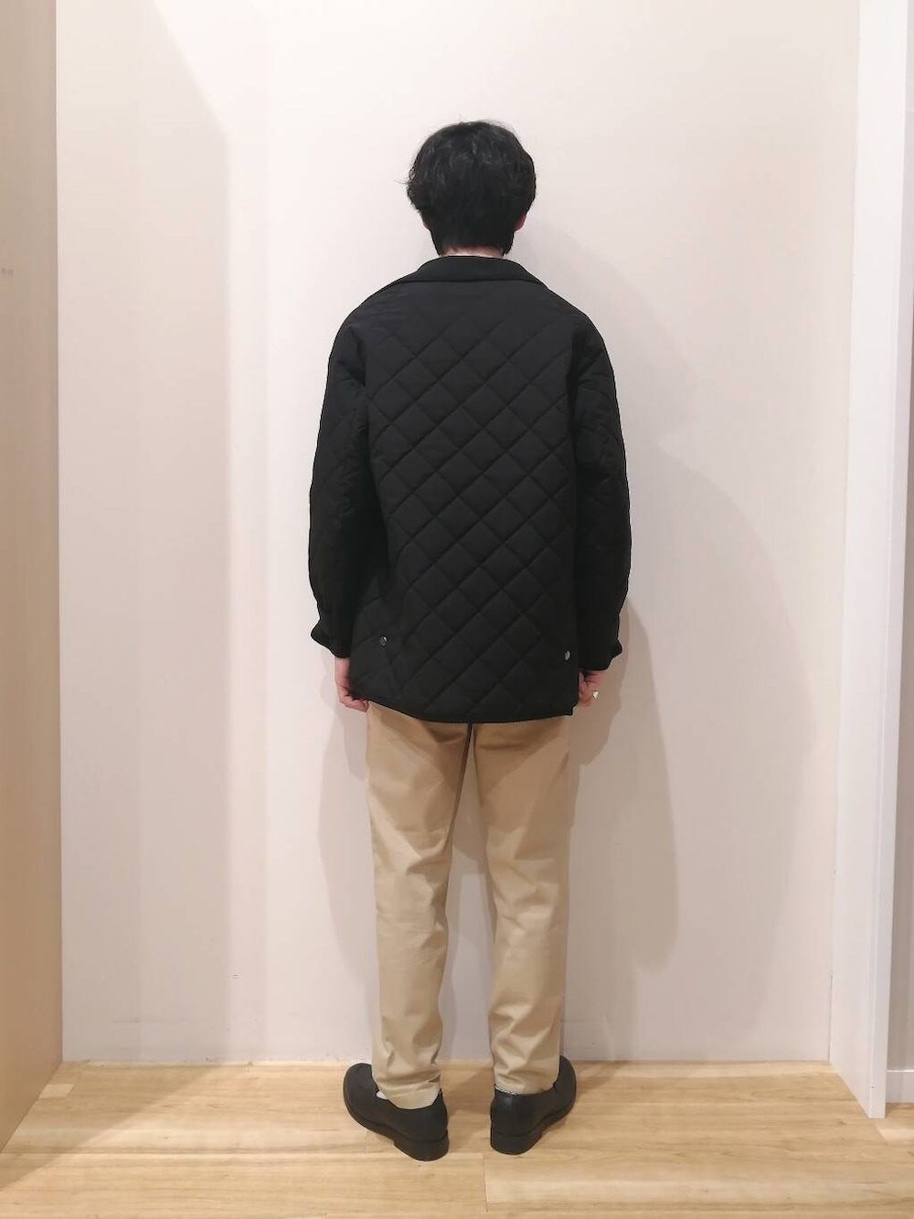 アウターは襟コーデュロイとダイヤデザインのキルティングが特徴的な中綿ジャケットになります。