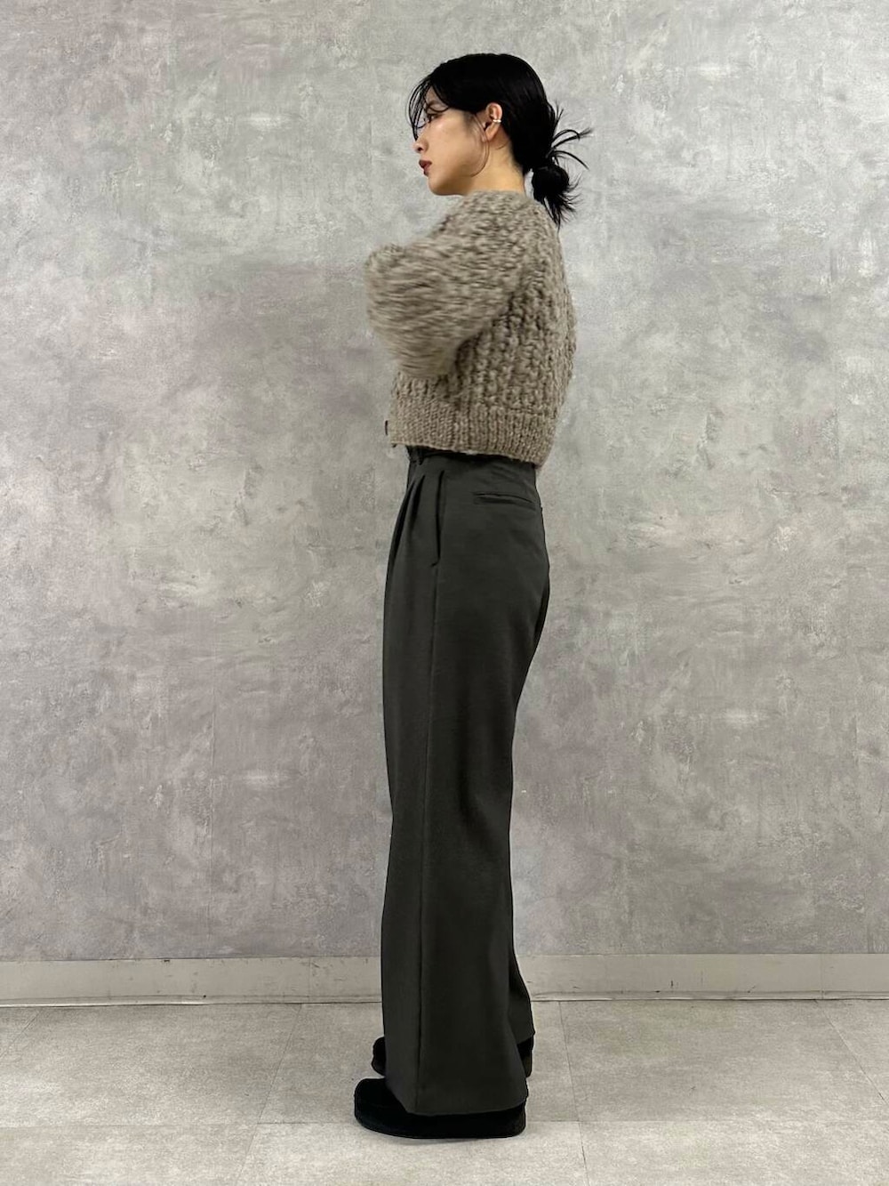 今回はカーデの丈感を活用してハイウエストのスラックスでのスタイルアップを狙い、綺麗目カジュアルスタイルに。