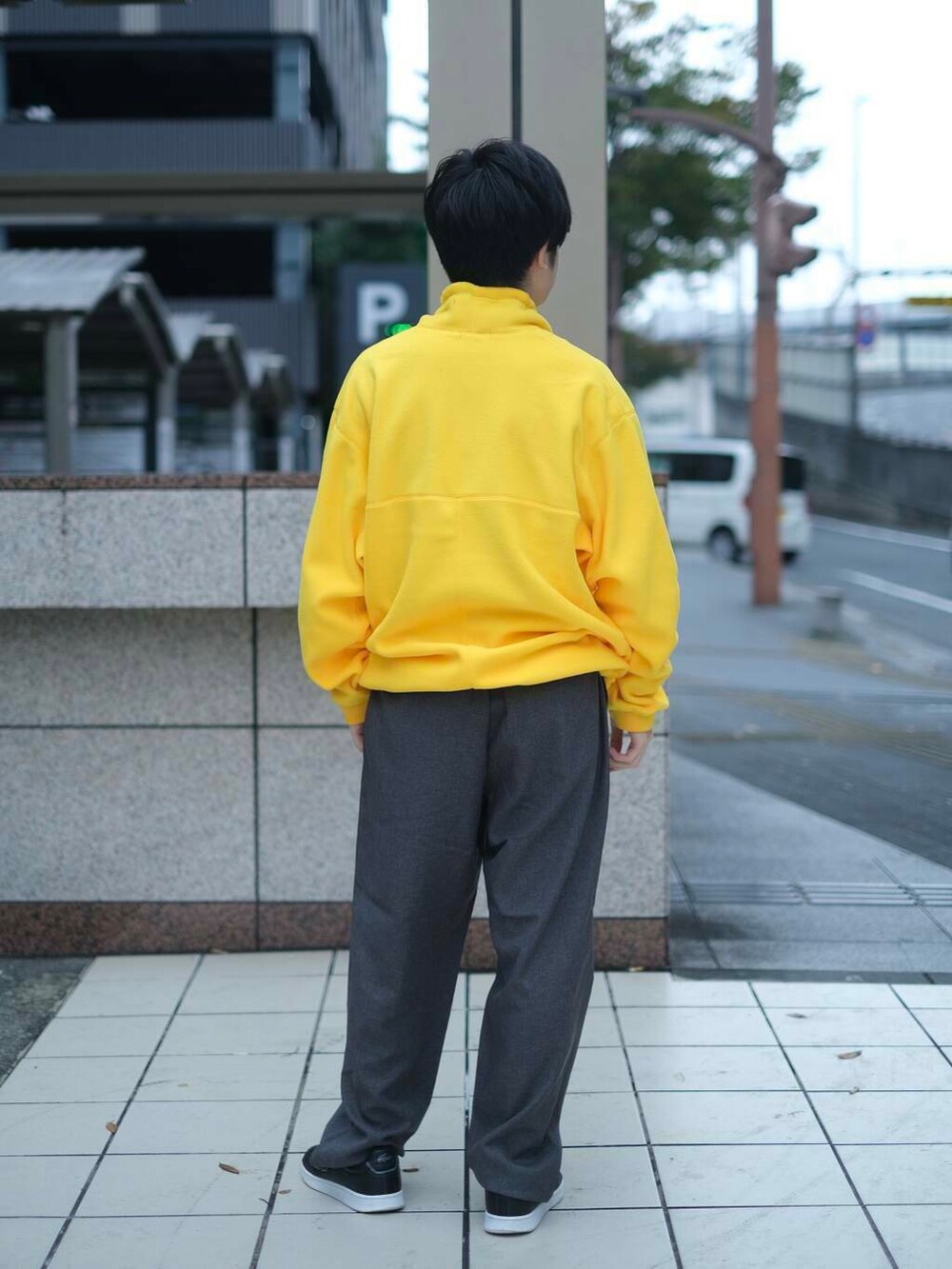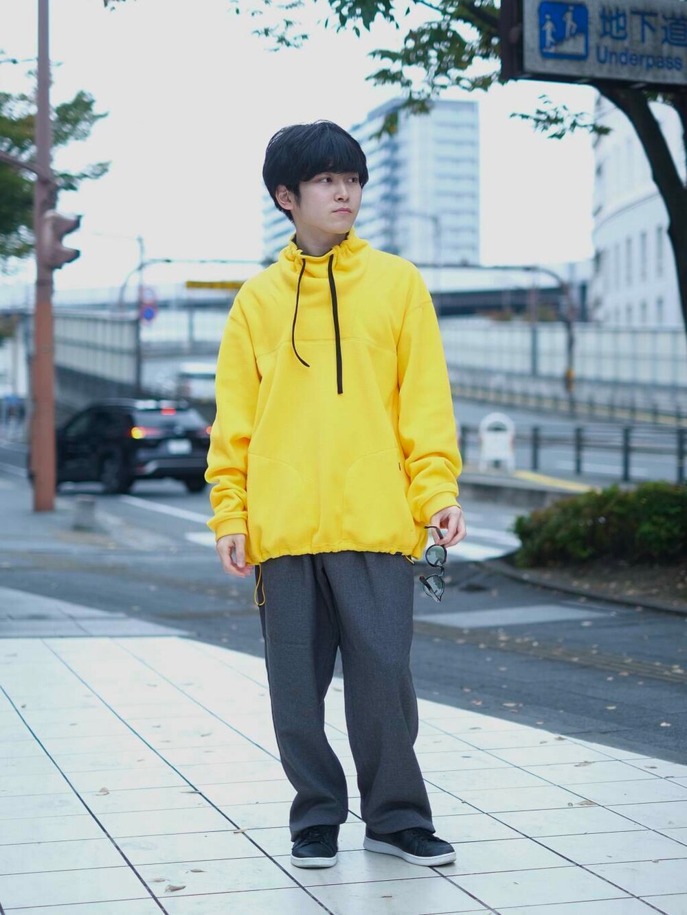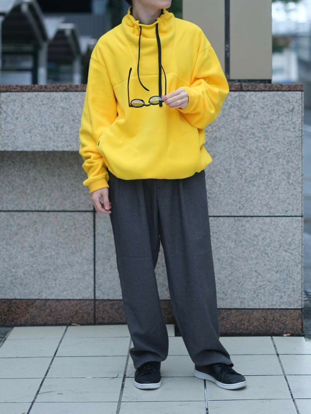EKALのスタンドフリースプルオーバーがイエローで強調されていますが、素材感と相まってかわいい印象に。