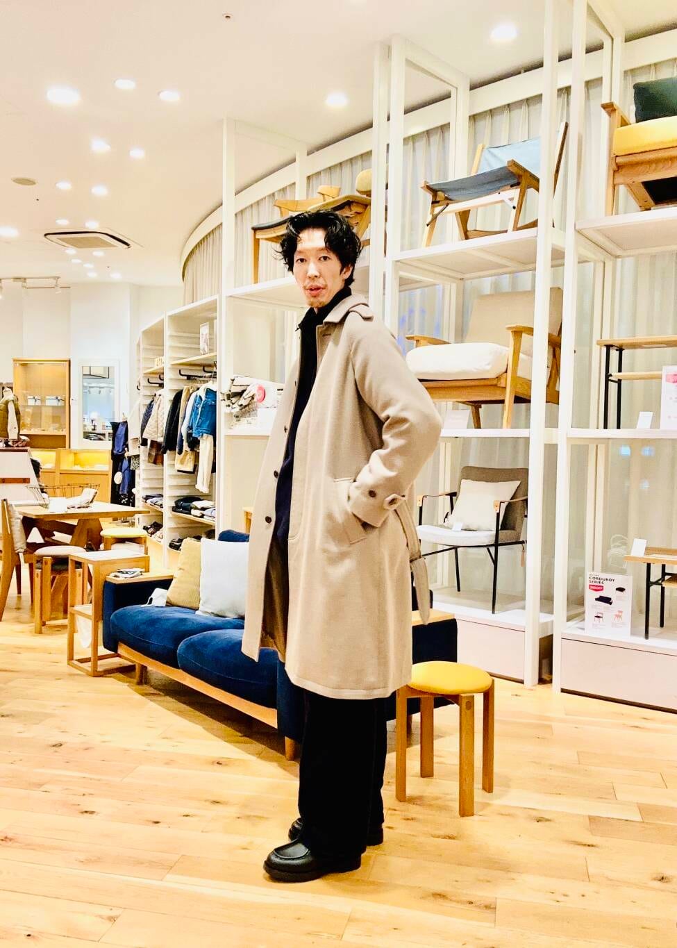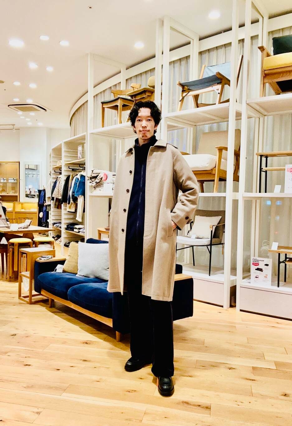 4〜5枚目 ウールメルトンステンカラーコートと革靴で