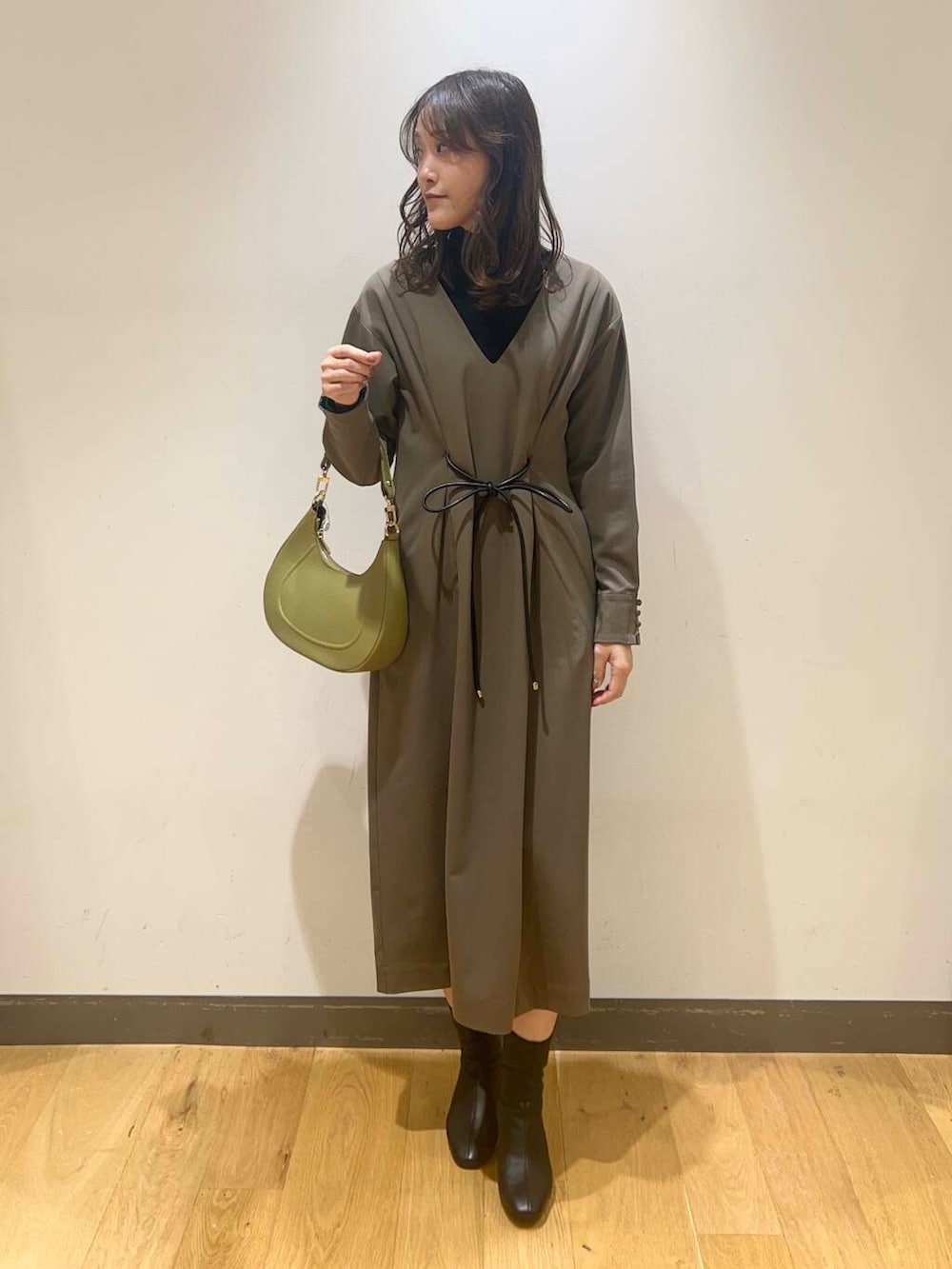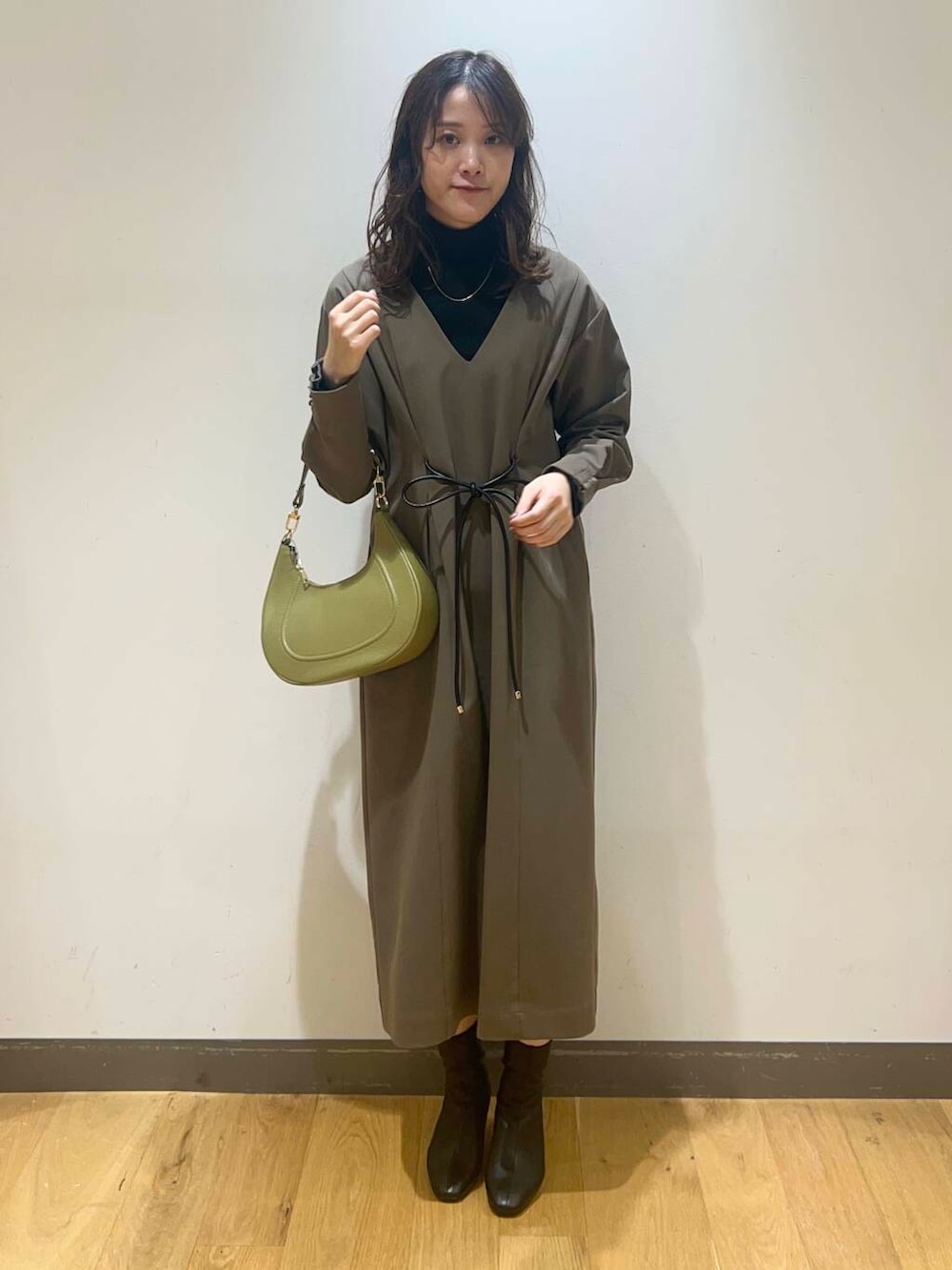 ベルトマークが目を引く大人ワンピコーデ.