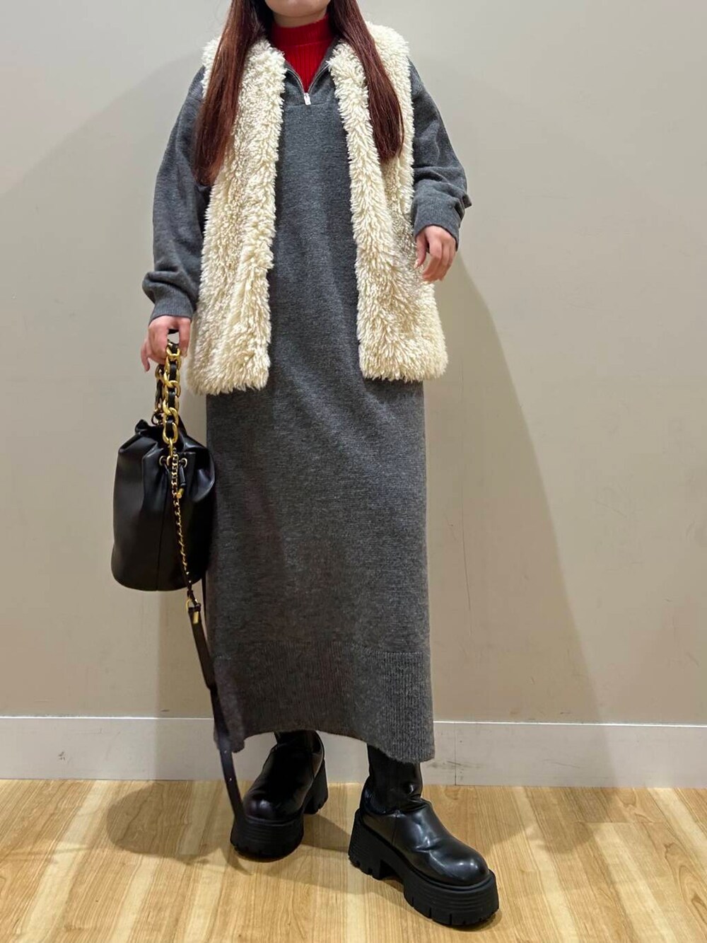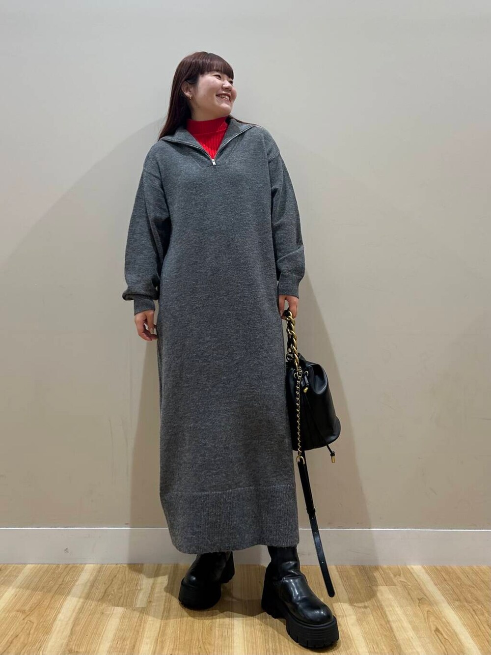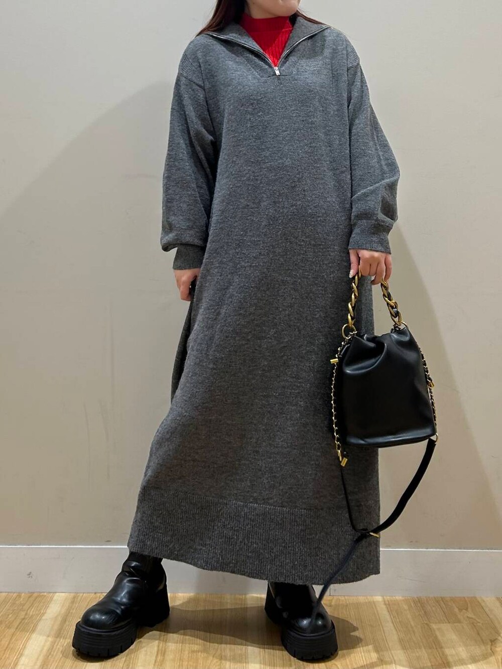 ハーフジップのワンピースは丈感しっかりあるので暖かく着用いただけます^^