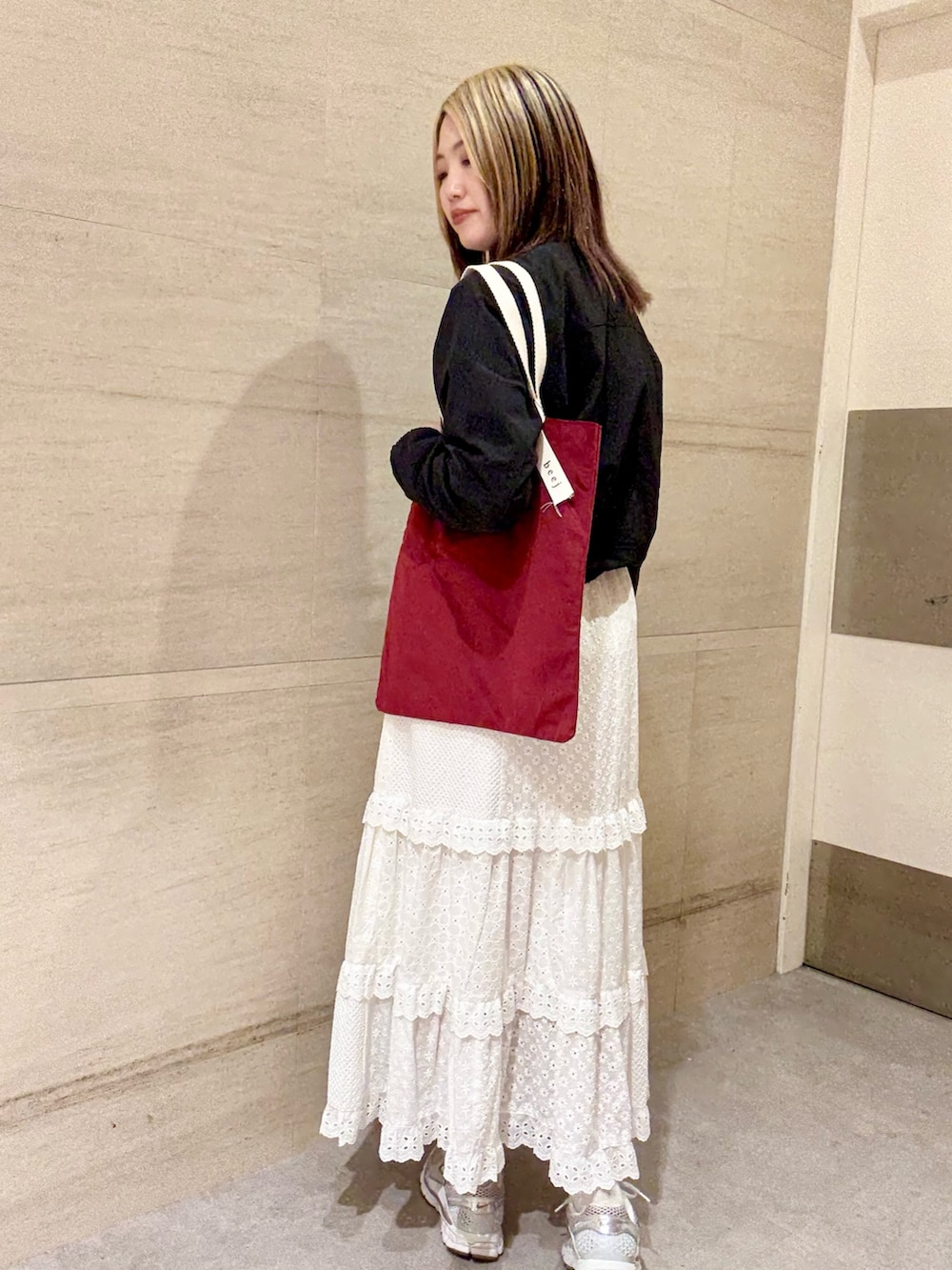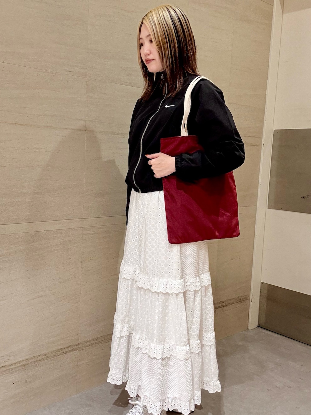 丈が短めのNIKEのジャケットはロングスカートと合わせるのがオススメです〇