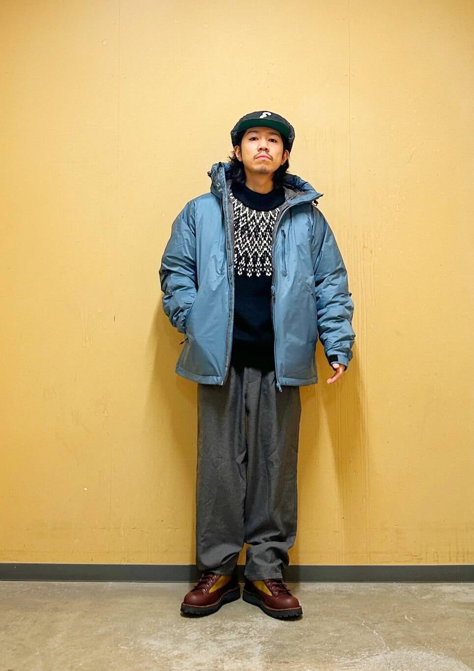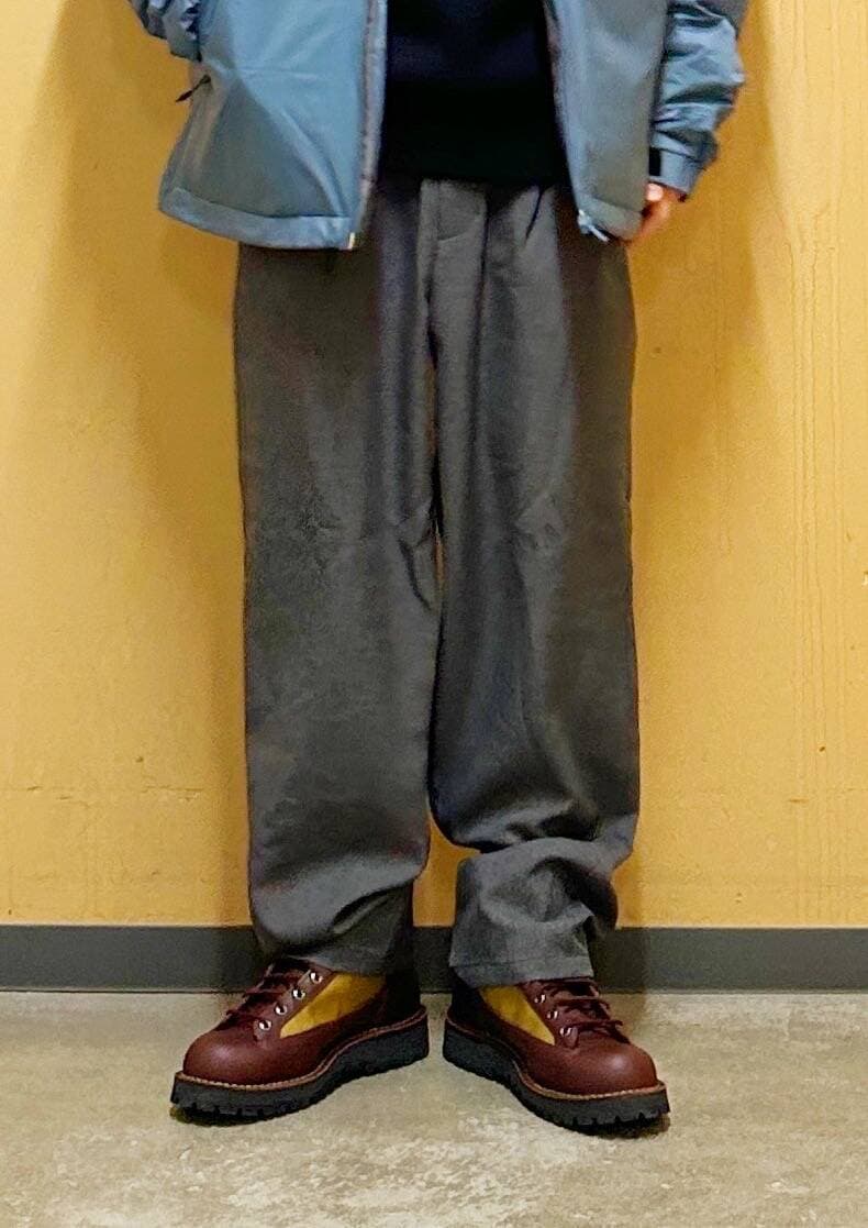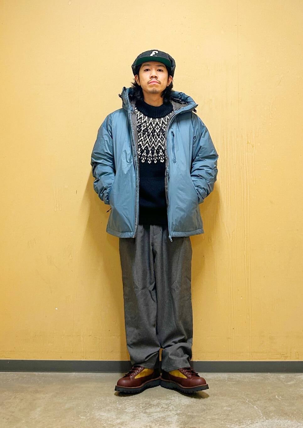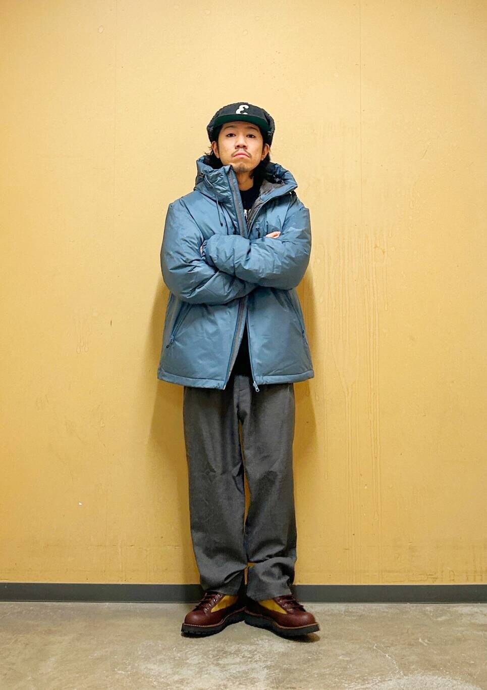 今回はnangaダウンブルゾンとツータックトラウザーを使用したコーディネート。