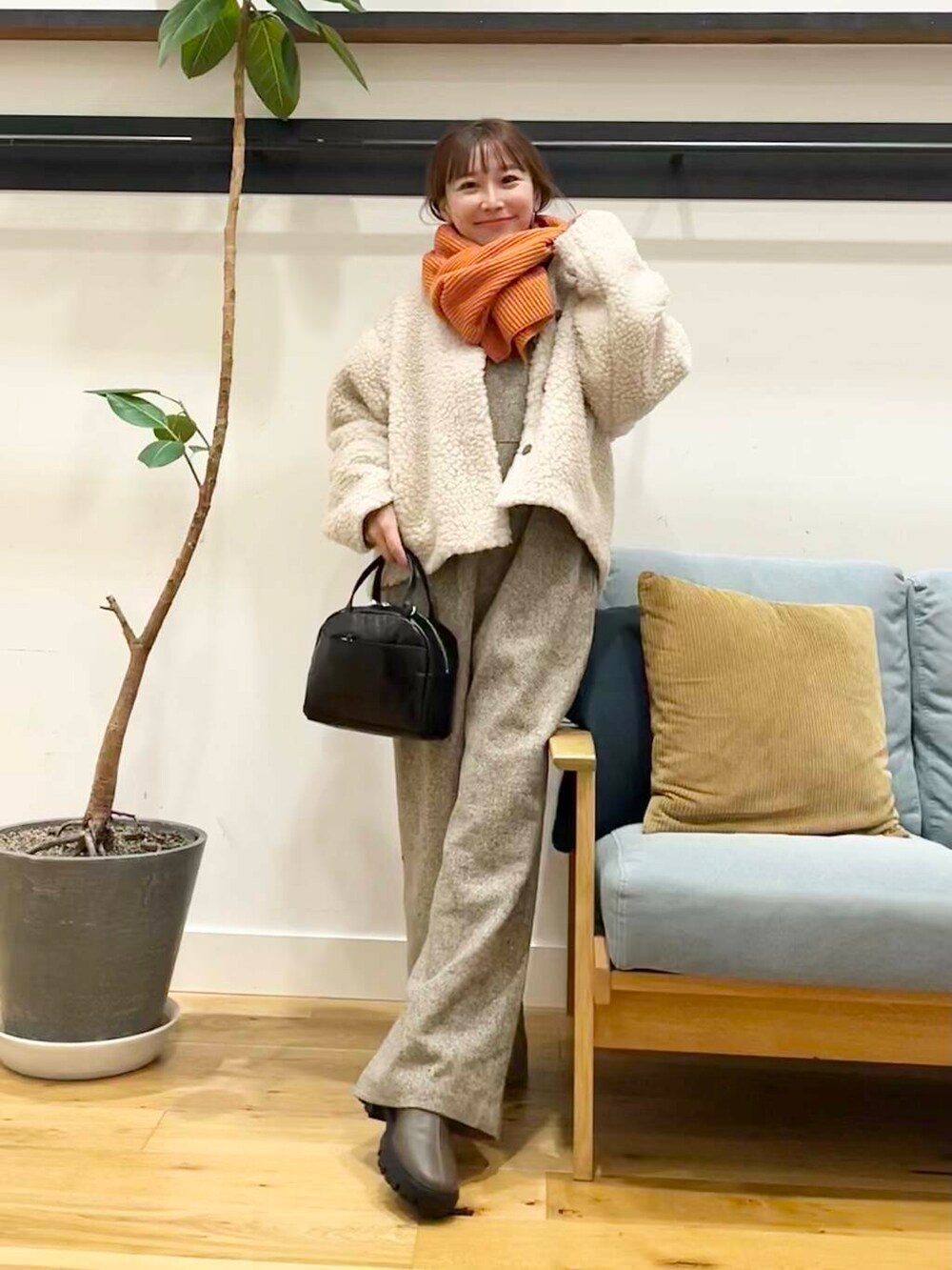 モコモコの羊みたいになりますが、着丈がそんなに長くないので、太めのパンツやスカートにも合わせやすいバランスです。