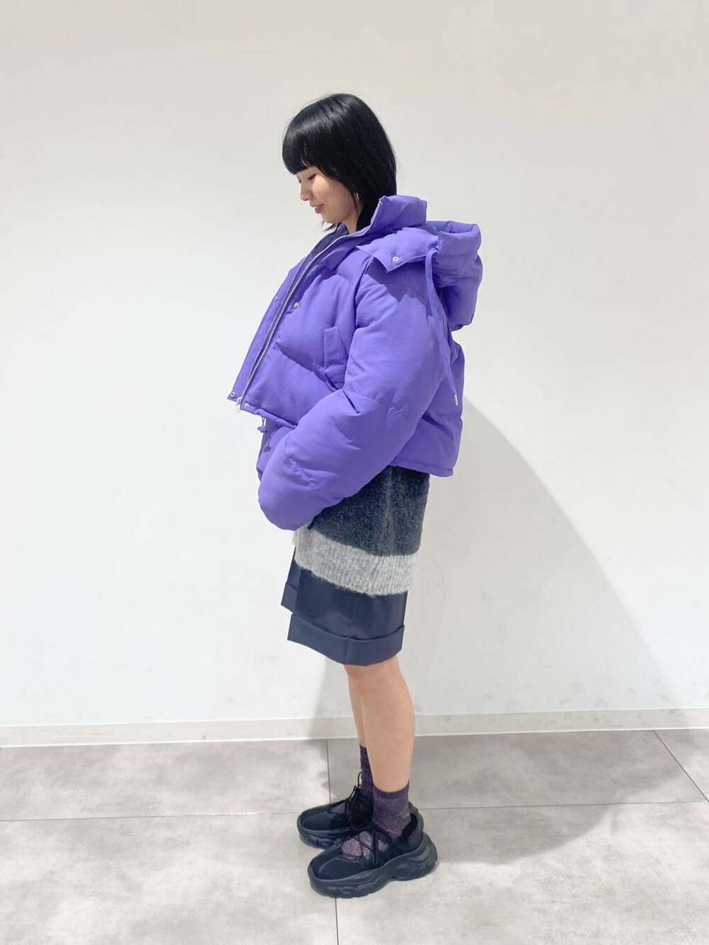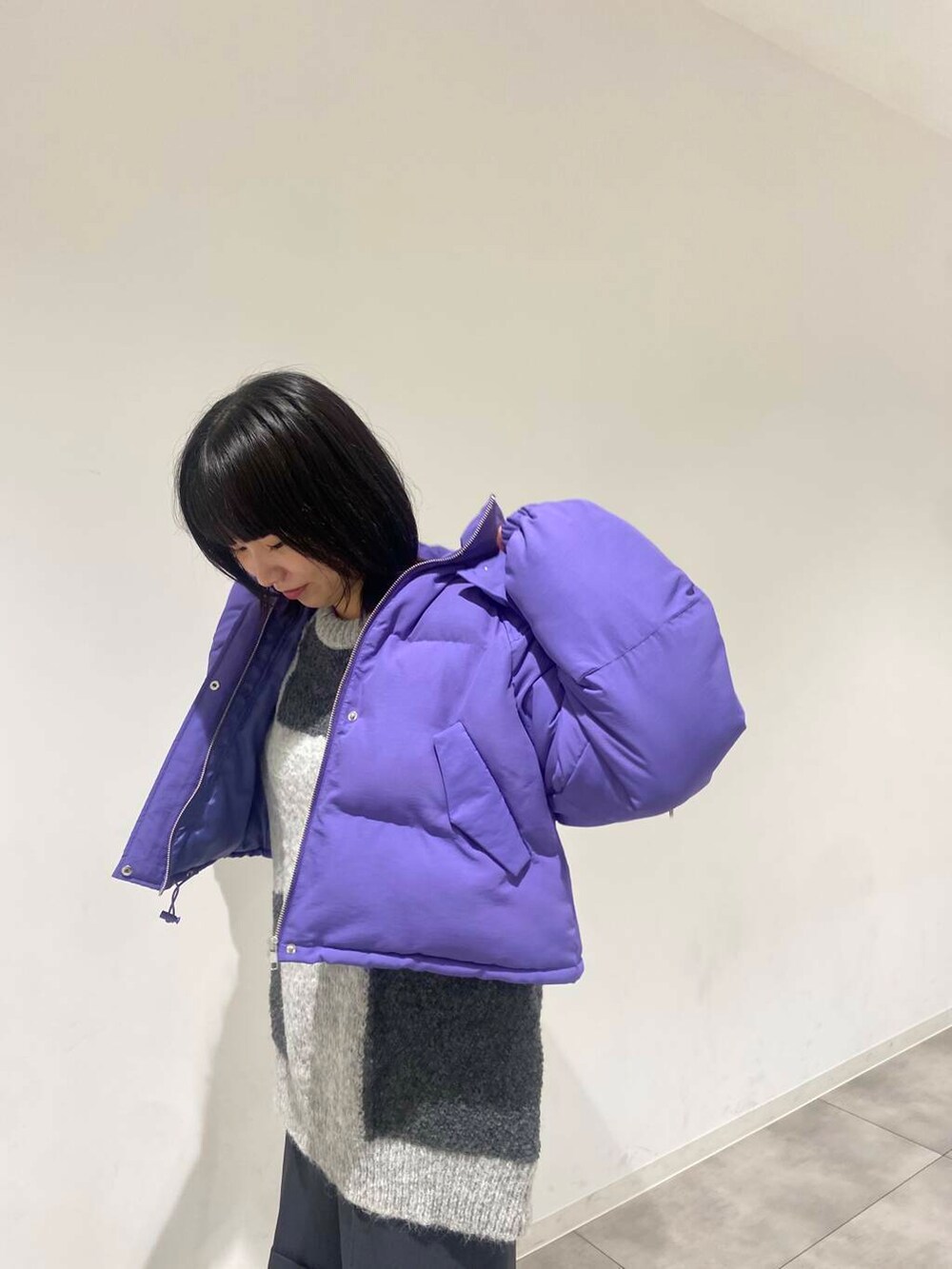 紫のショート丈アウターは1着取り入れるだけでパッと明るくなります。