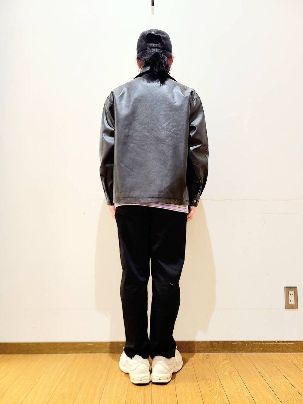 フェイクレザーパンツは一見強めの印象ですが、すっきりシルエットでどんなコーディネートにもマッチします。