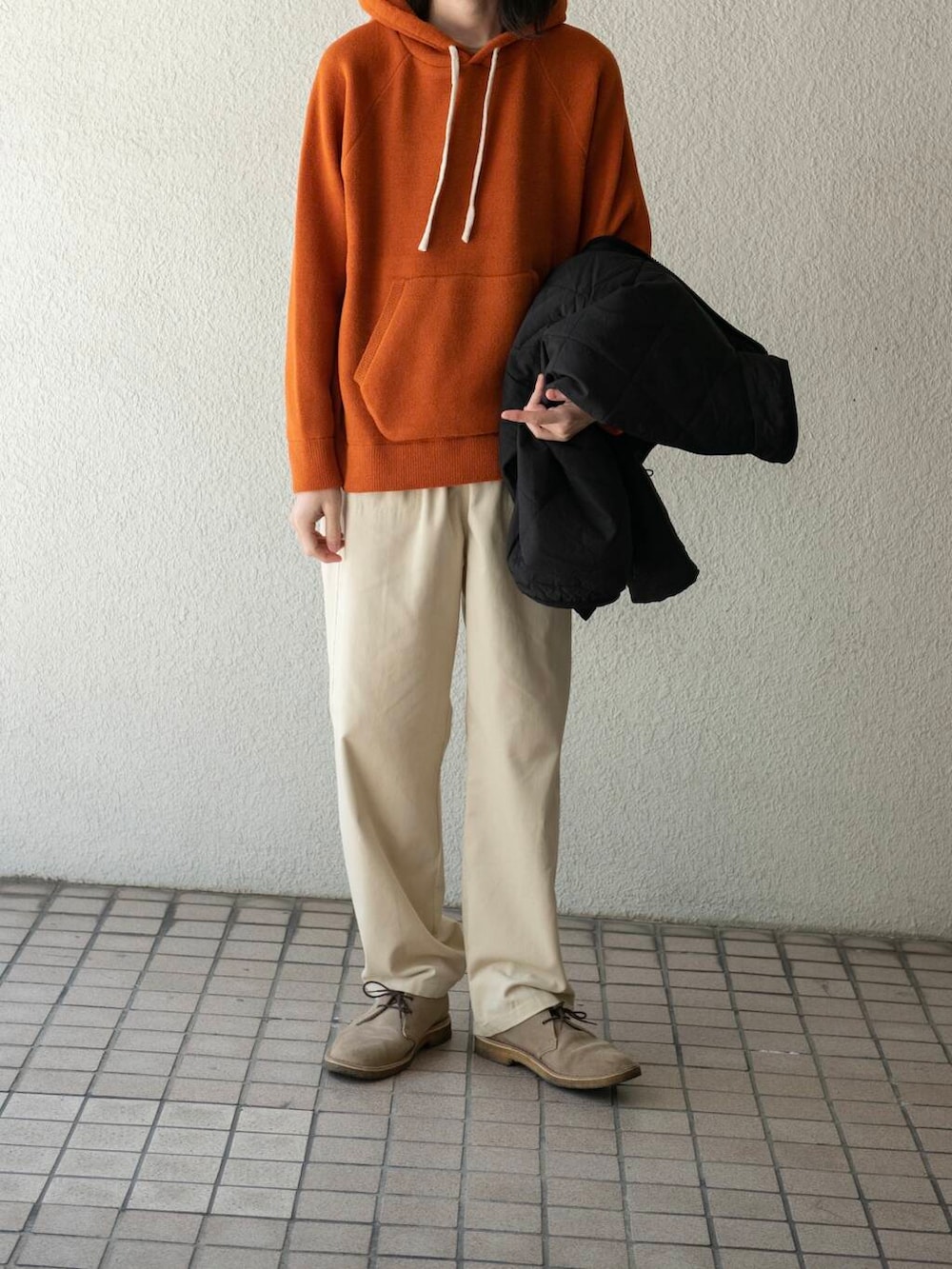 今回はオレンジのフリースパーカーと合わせました。