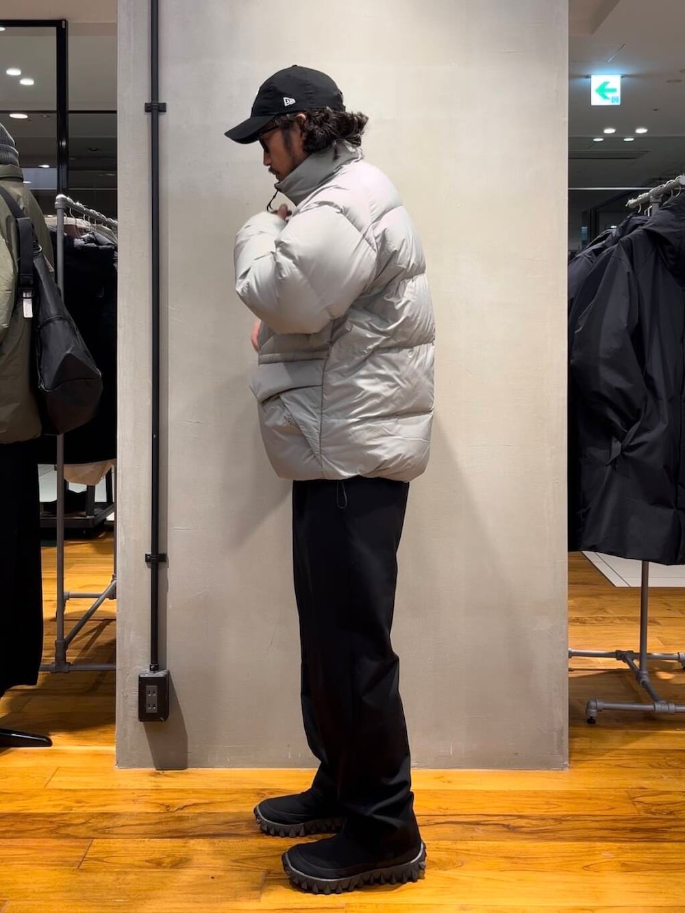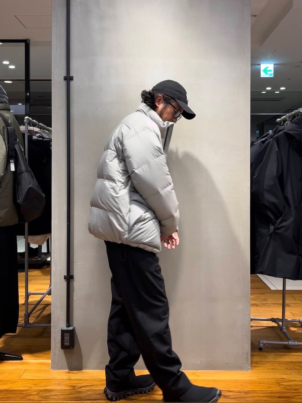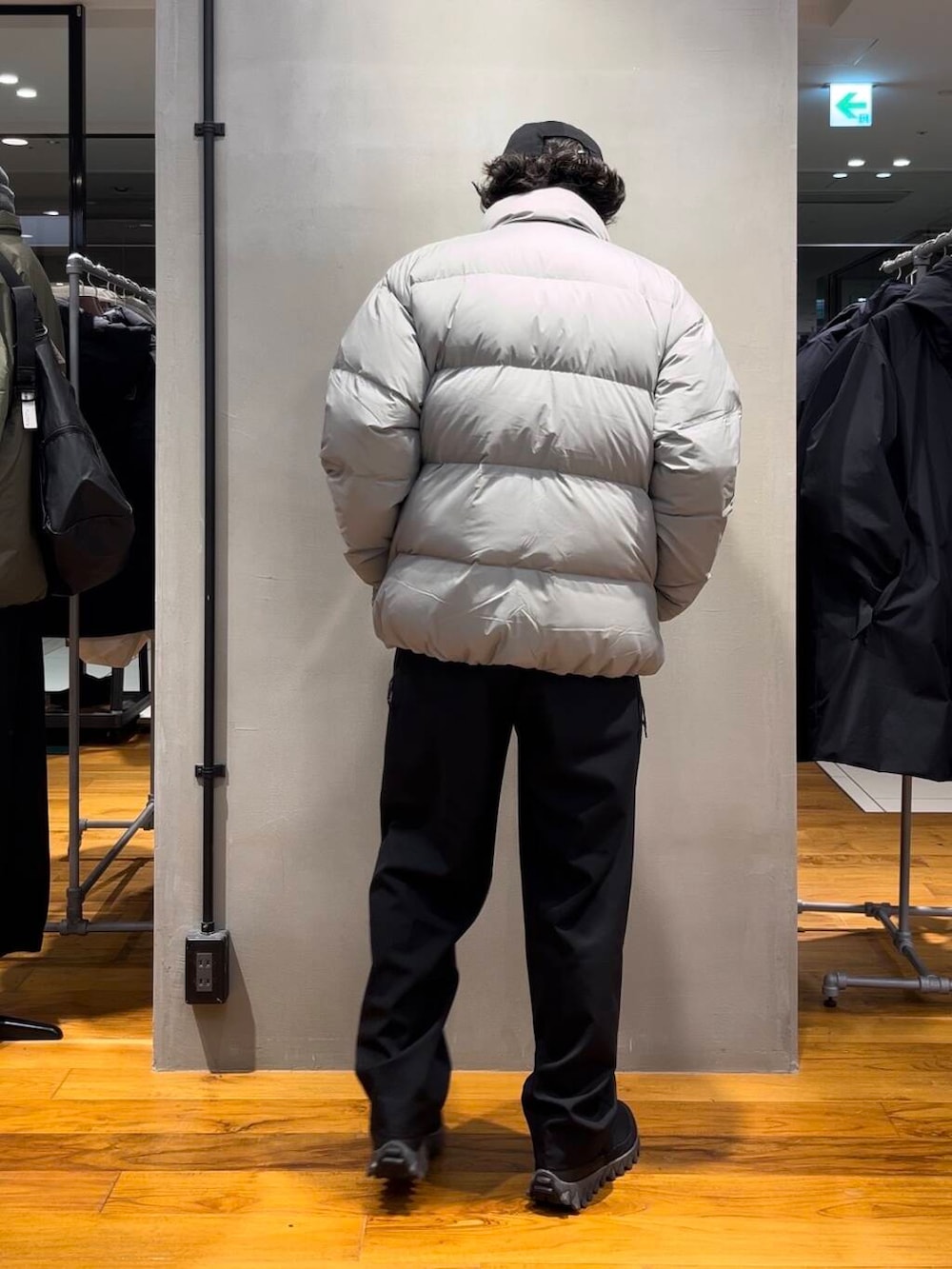 ライトグレーのNANGAダウンブルゾンとスラックスで落ち着いた印象とシューズでテック感をプラス