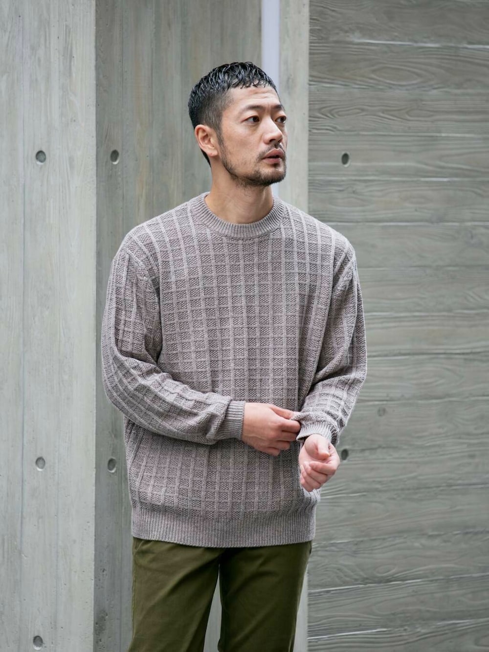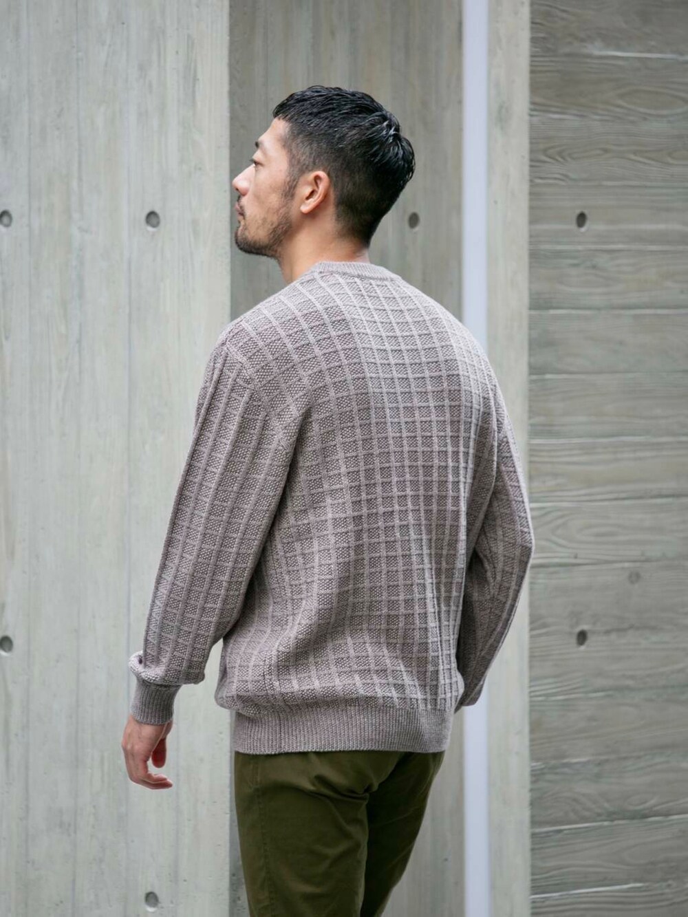メリノウールの柔らかな素材感&特徴的な編み地、1枚でもインナーでも使い勝手抜群。