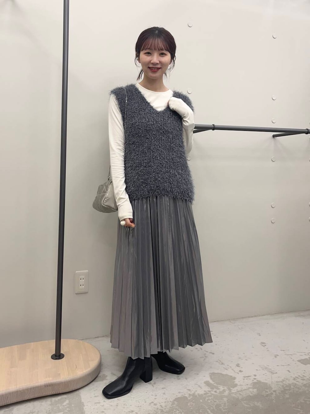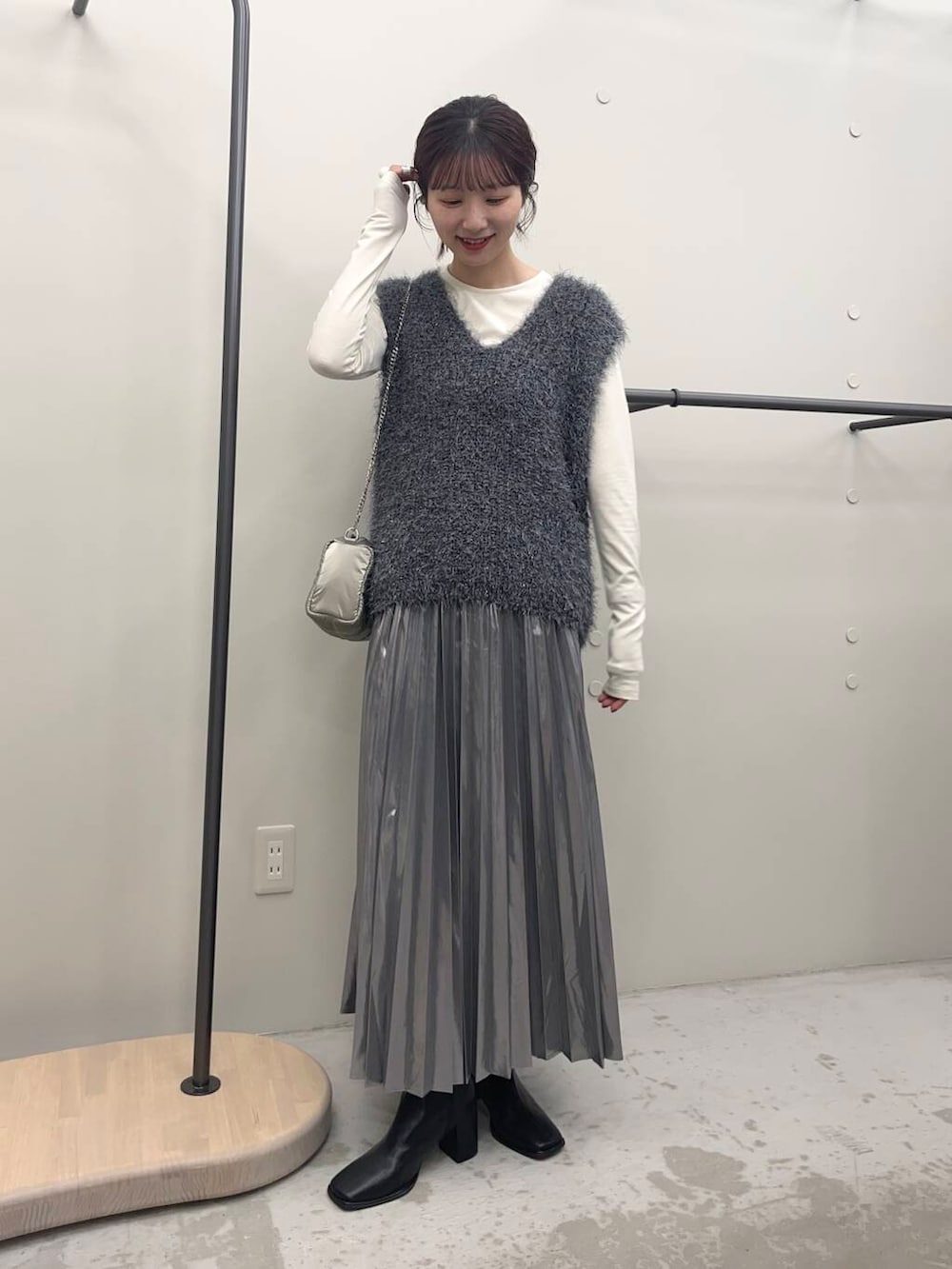 プリーツスカートは素材の光沢感が