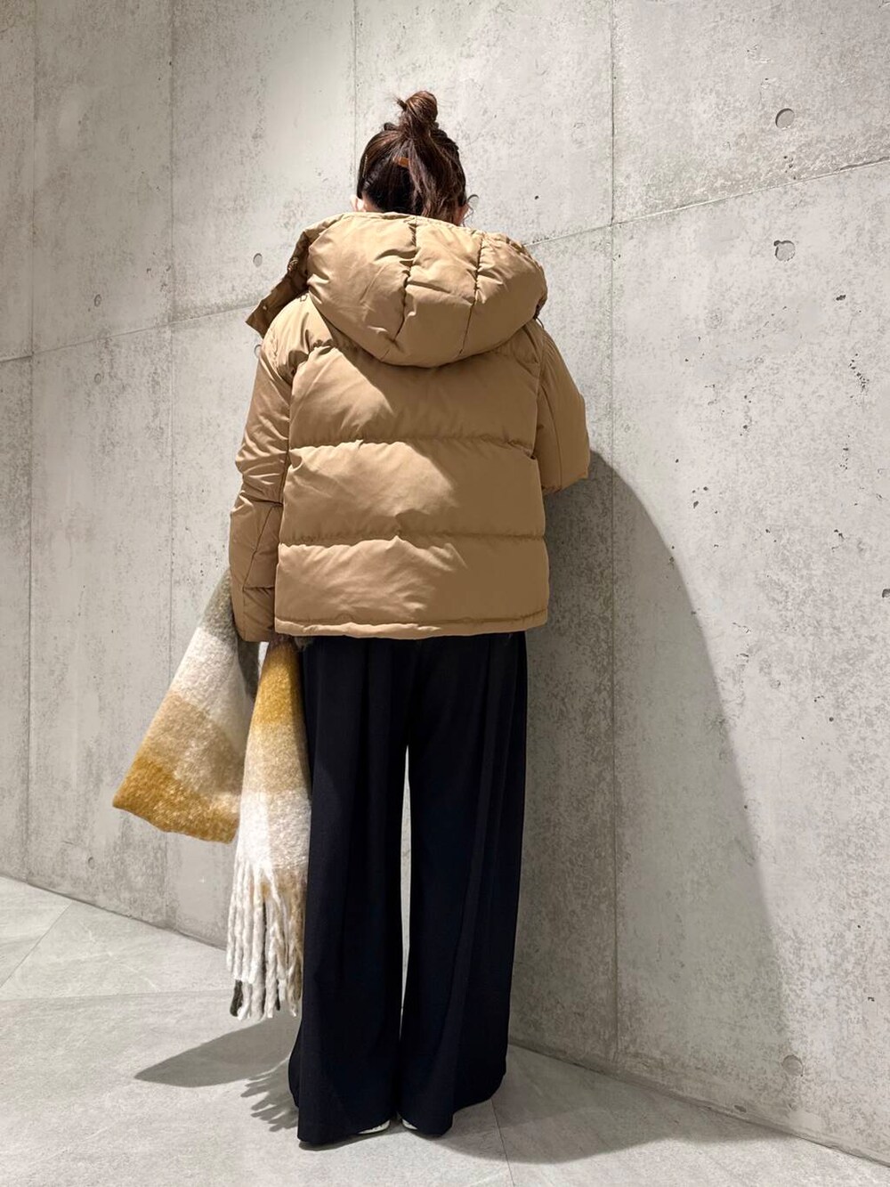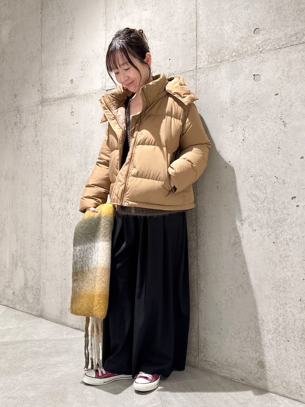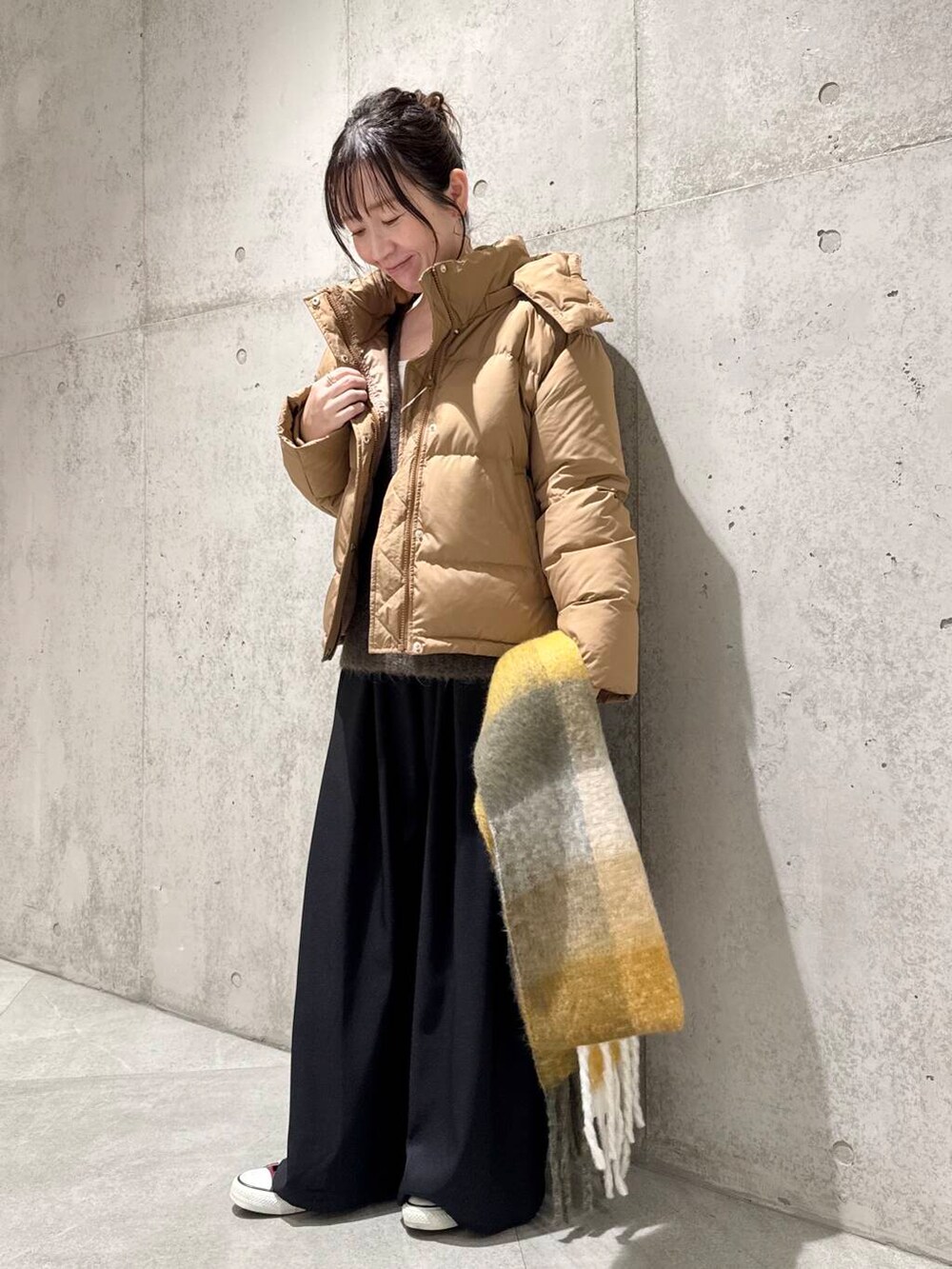 チェック柄のマフラーをアクセントにすることで、明るい印象にしてくれます。