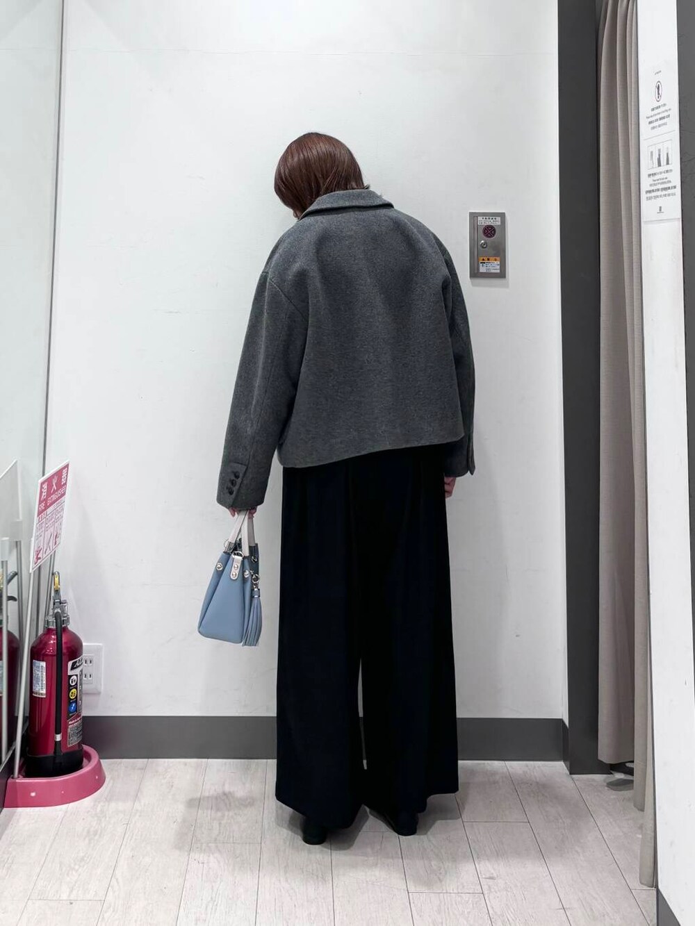短丈のニットにタックのついているワイドなボトムと合わせることで脚長効果があります!