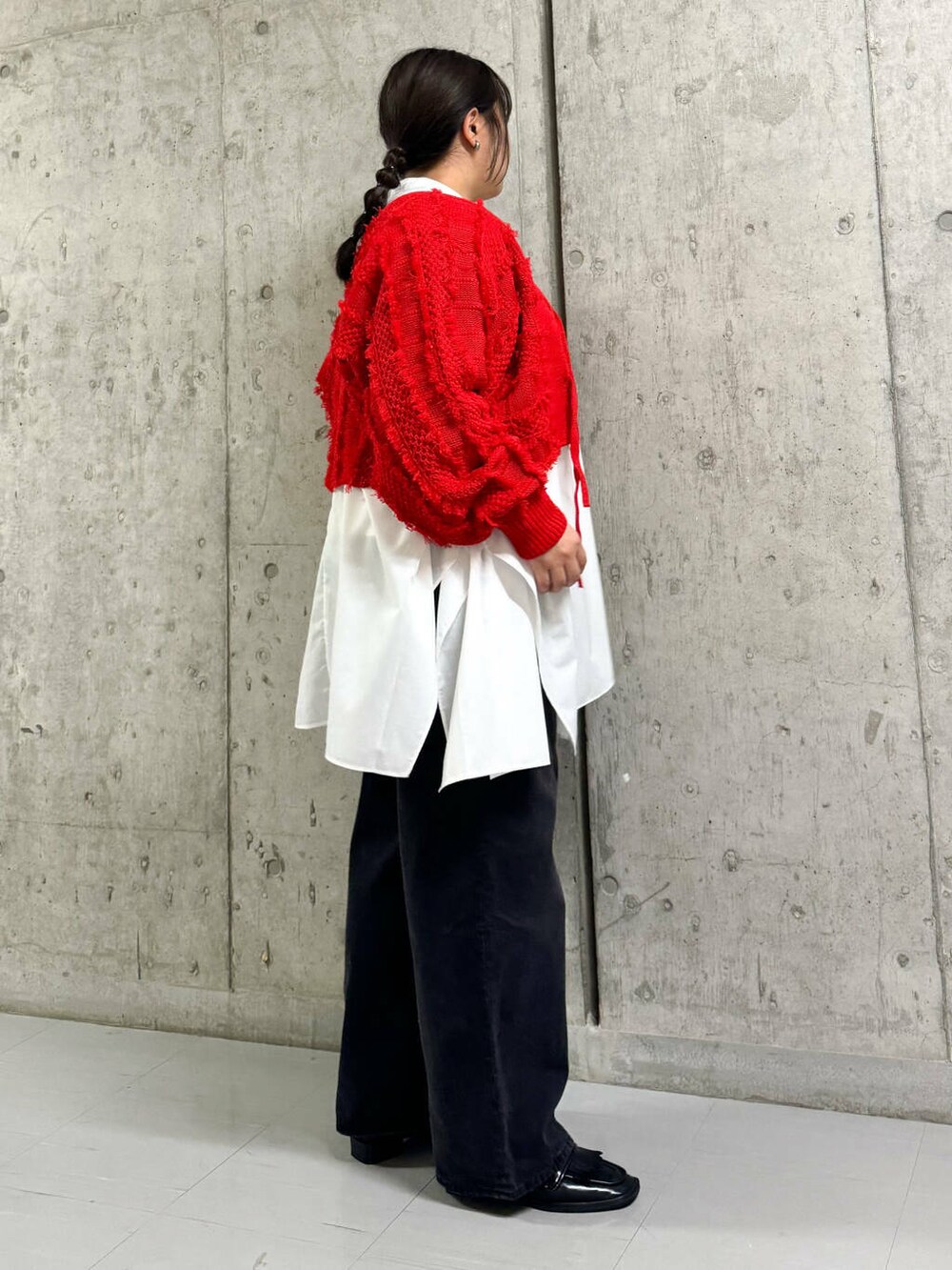 シャツのミニワンピースは裾のドレープが可愛く、丈の短いカーディガンともバランスが良くて◎
