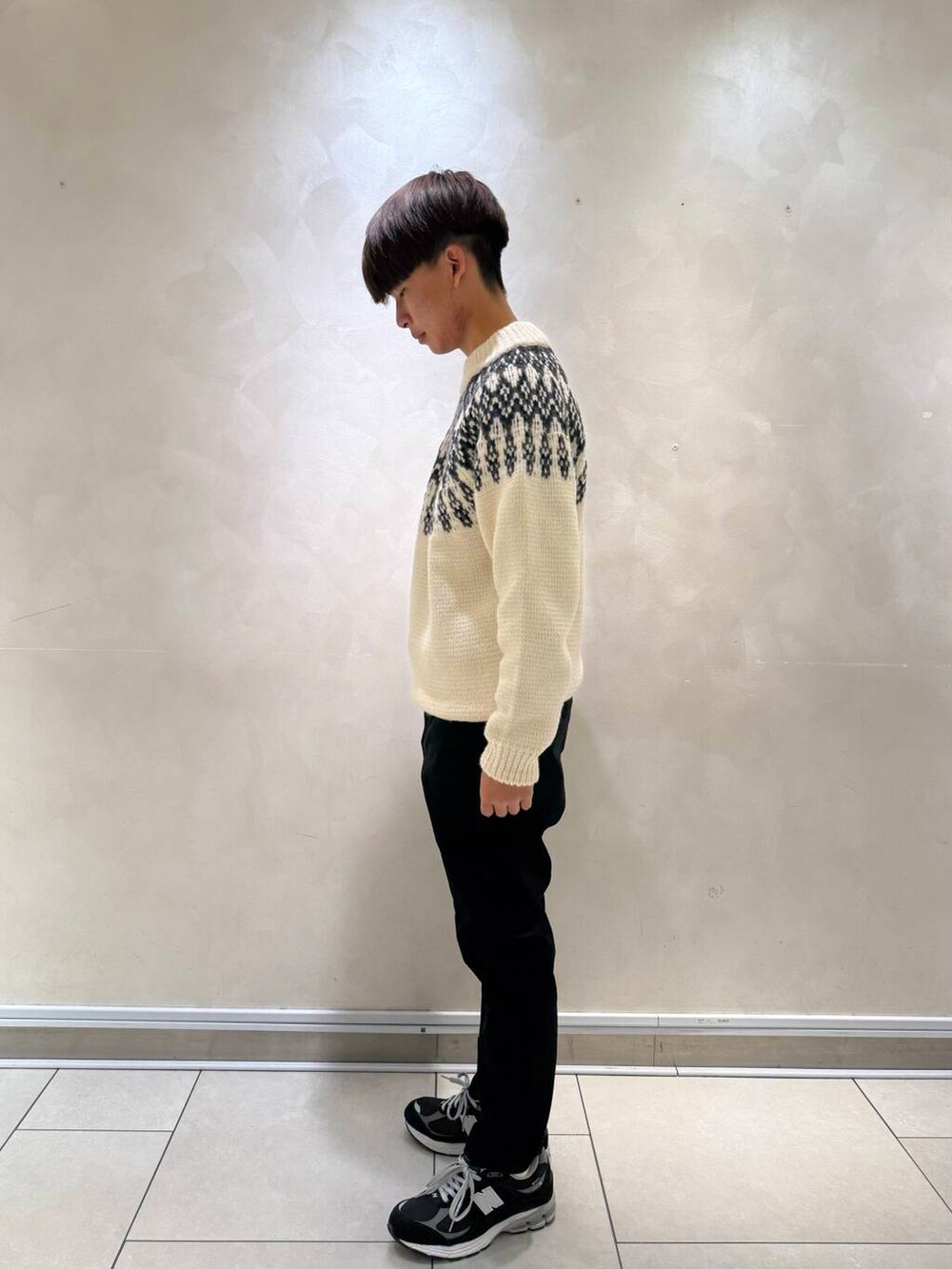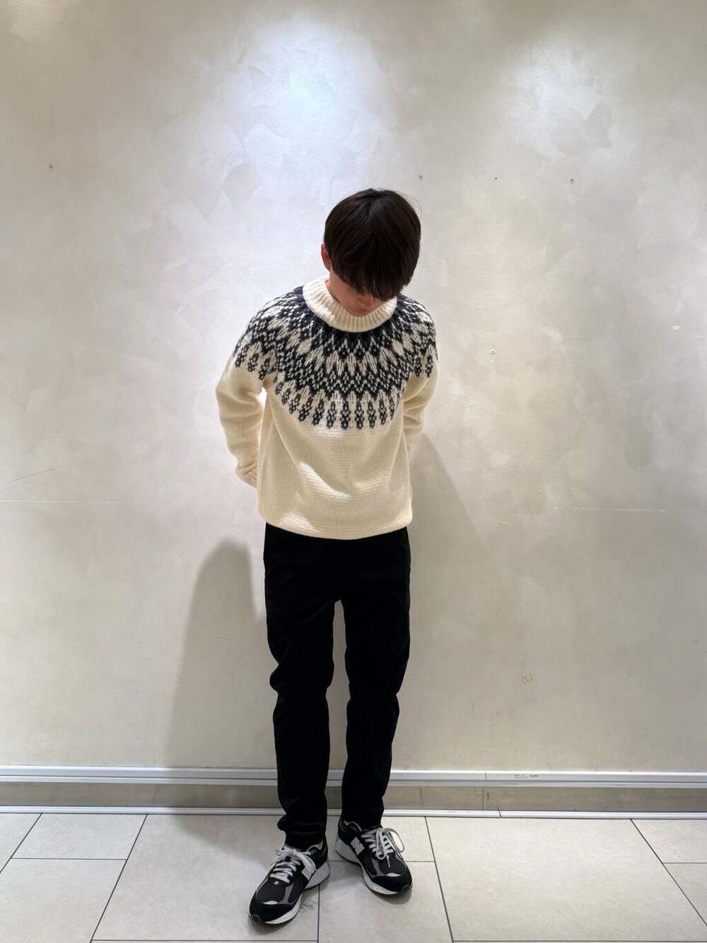 今回は求心柄のニットを使ってコーデを組んで見ました。ニットはウール混の本格的な糸でふっくらとした編みあがりなっており、ほどよい厚みと軽さを両立しているため、窮屈にならず着やすい仕上がりになってます。