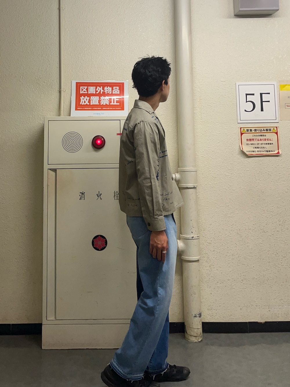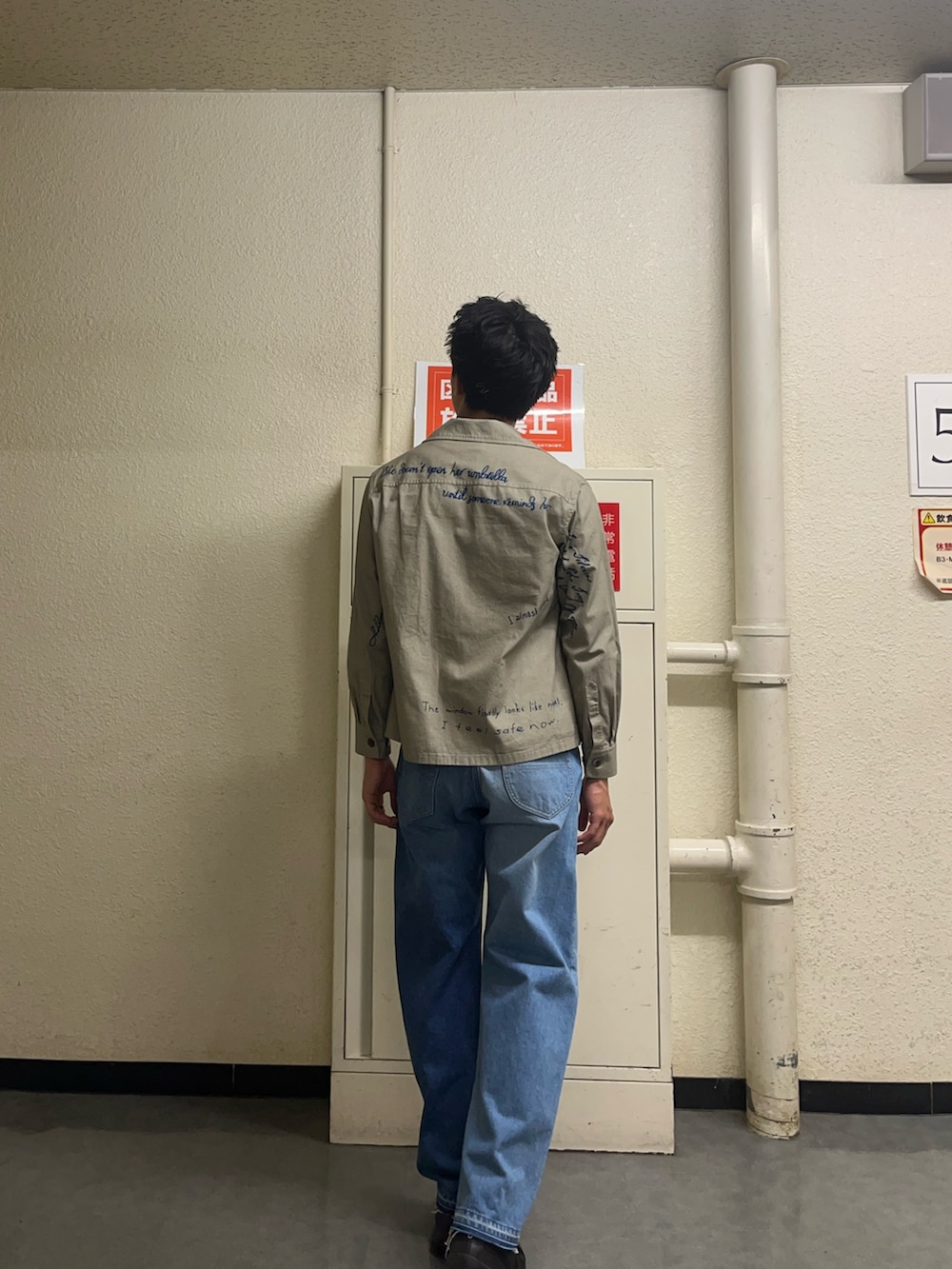シャツをいかして少し細めなラインで仕上げてみました。シャツが短丈なのでそれに合わせて細めのパンツで合わせてみました。