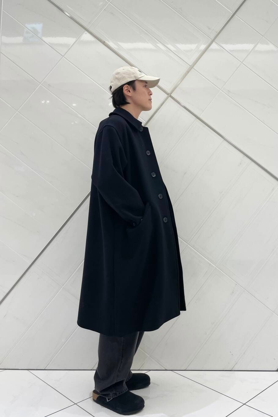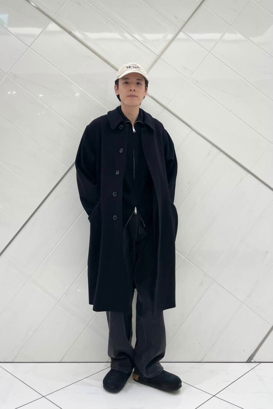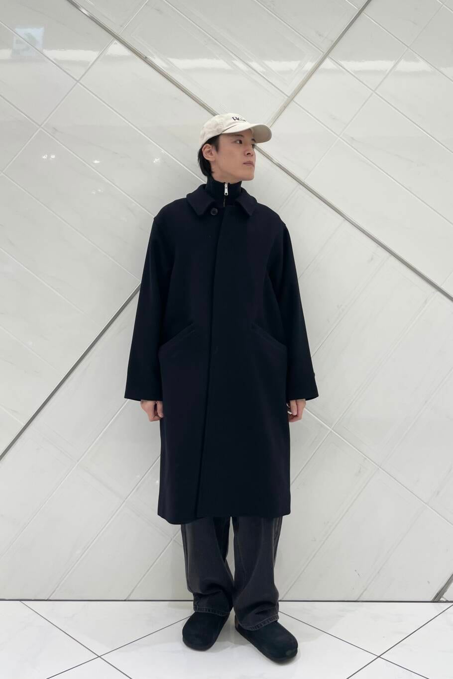 コート以外のアイテムをカジュアルアイテムで統一する事で、決まりすぎないスタイリングにしました。