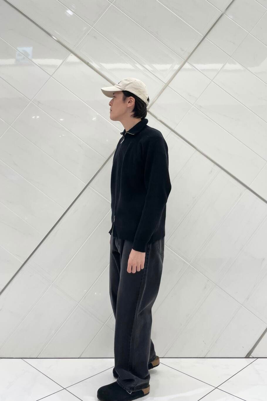 EKALのドライバーズニットは軽めな着心地で程よく厚みがあるため、羽織としてもおすすめです。サイズ感もゆったり過ぎないフィッティングで、裾のリブも強くないため、キレイめなスタイリングに使えます。