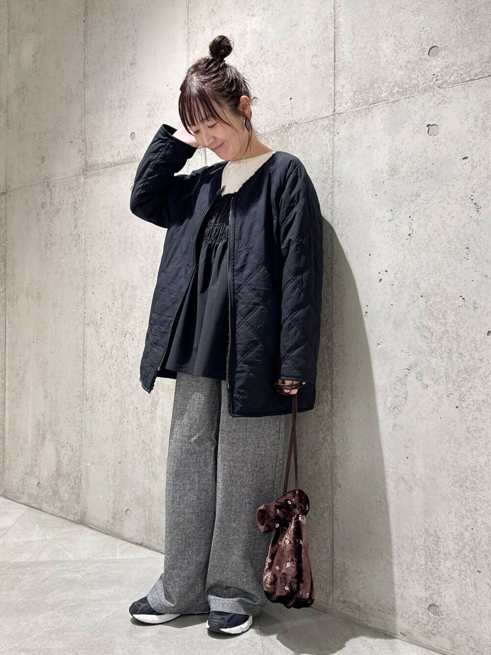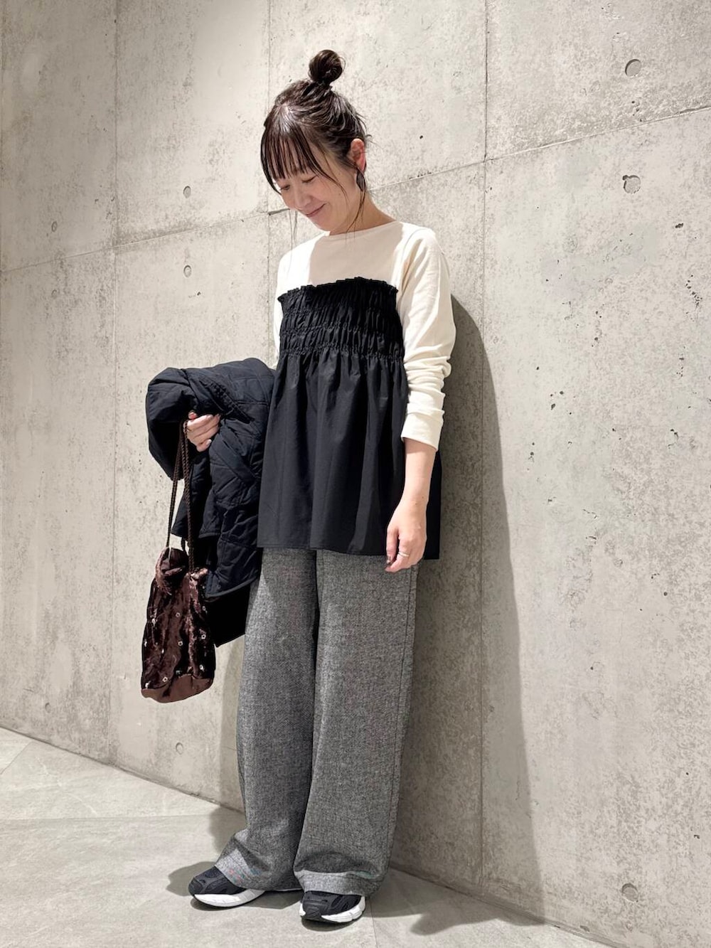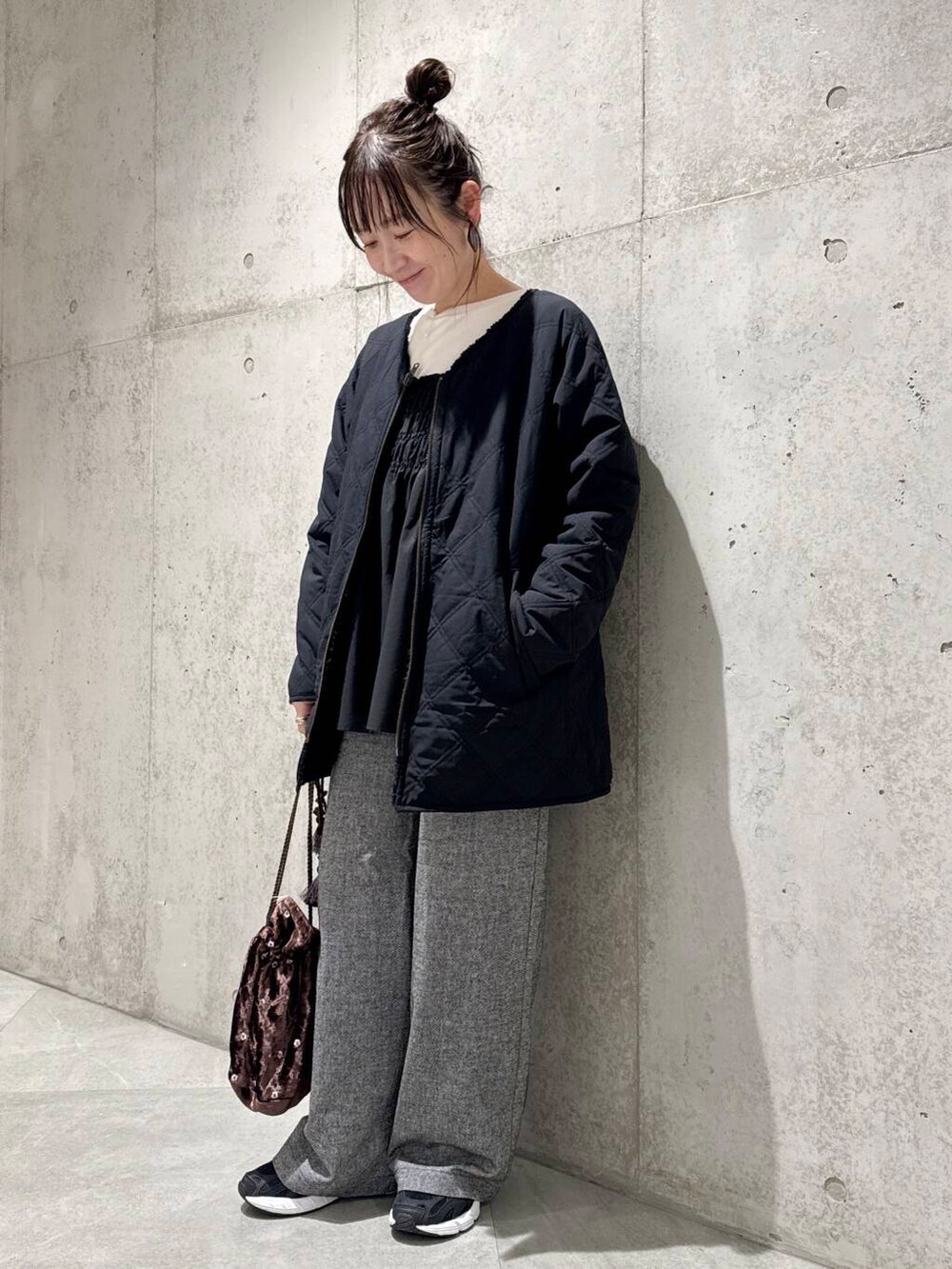 ボトムスは、ツイードパンツで、落ち着いたモノトーンスタイルにまとめてみました。