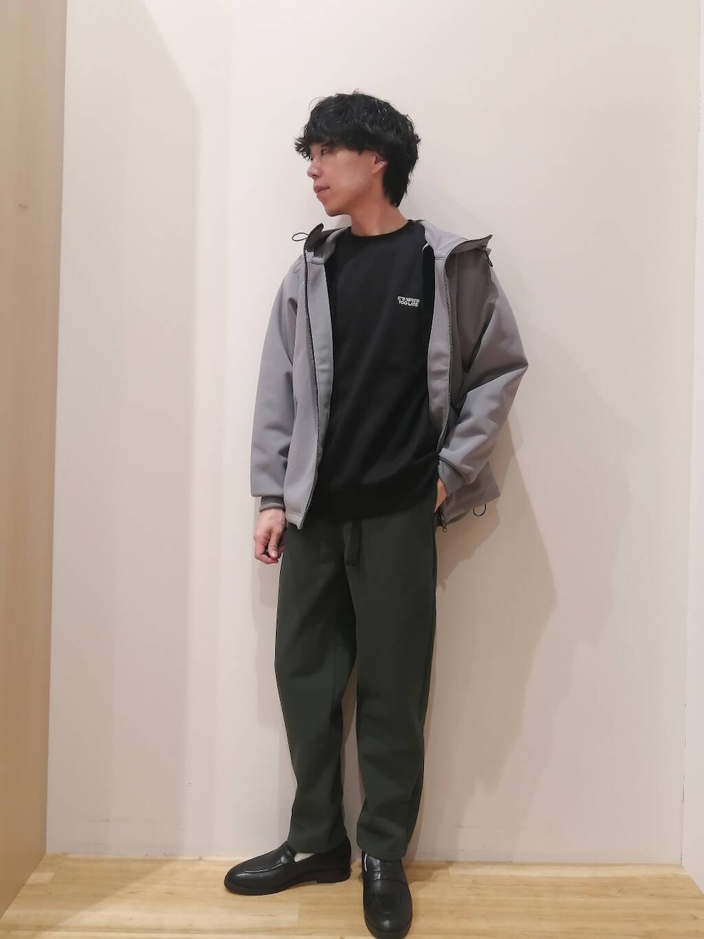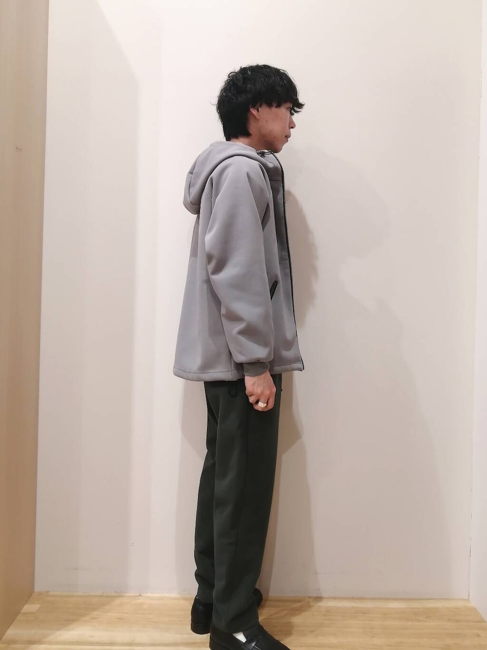 アウター、スウェット、パンツすべてMサイズを着用しております。
