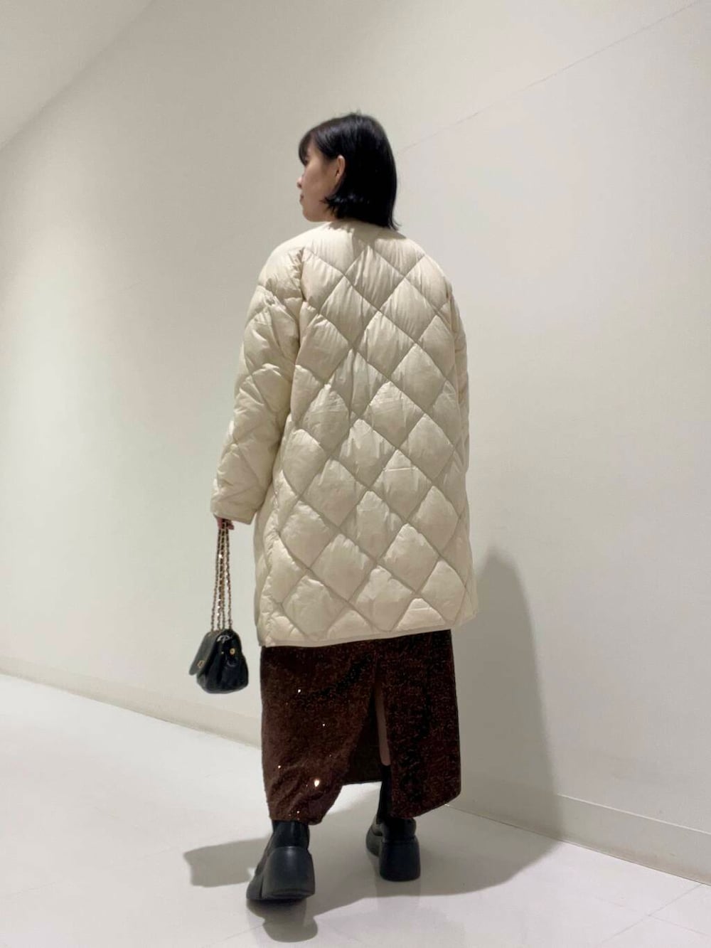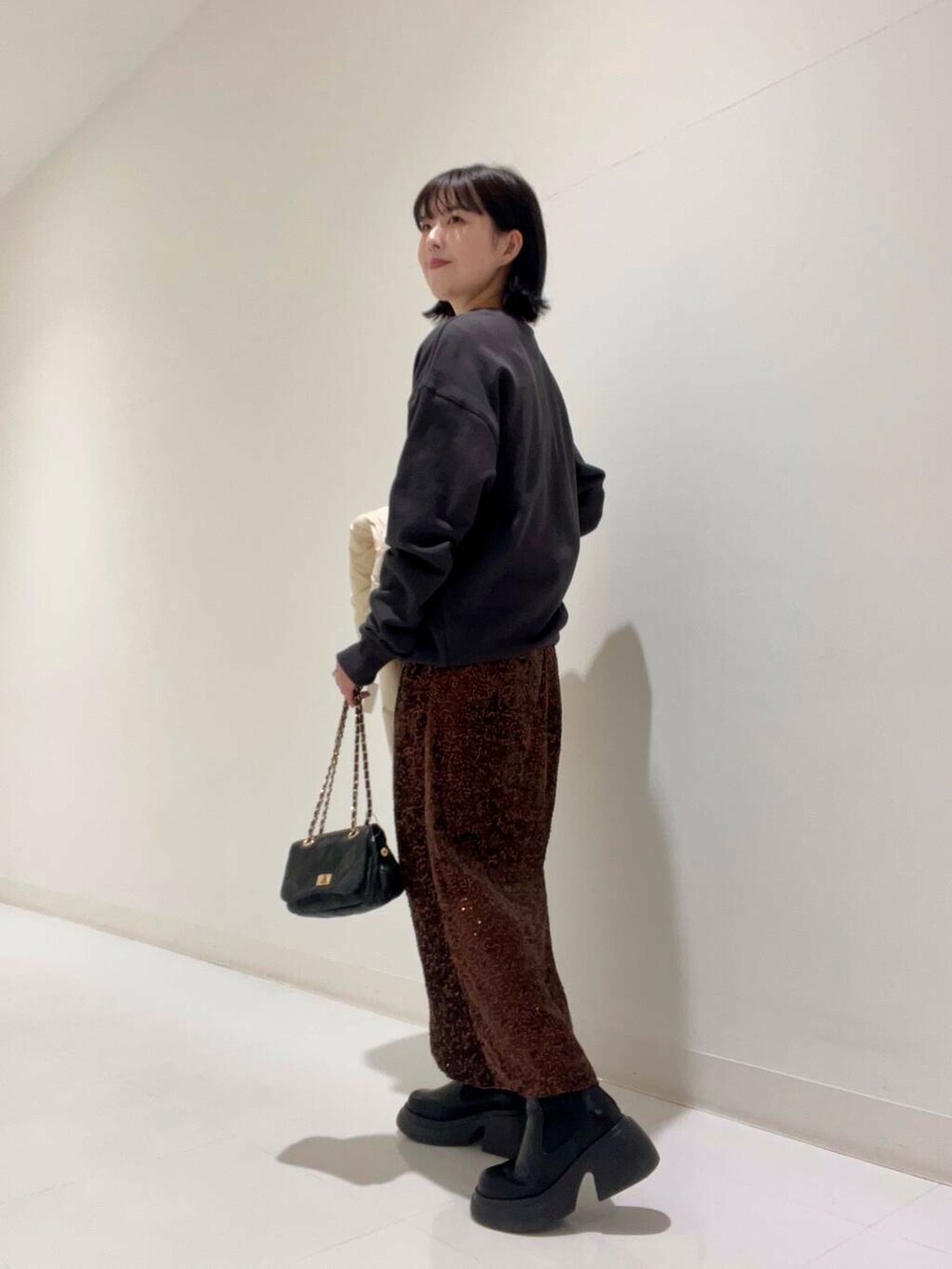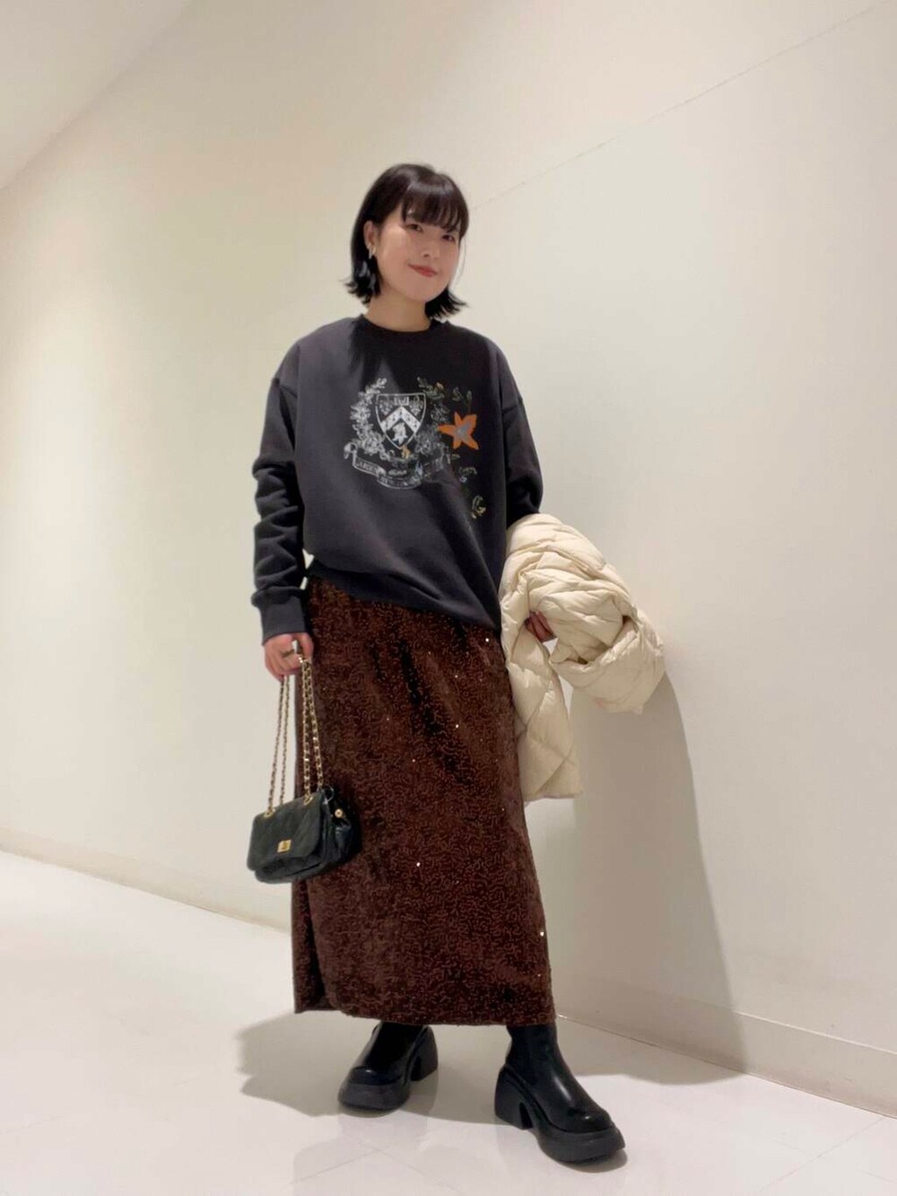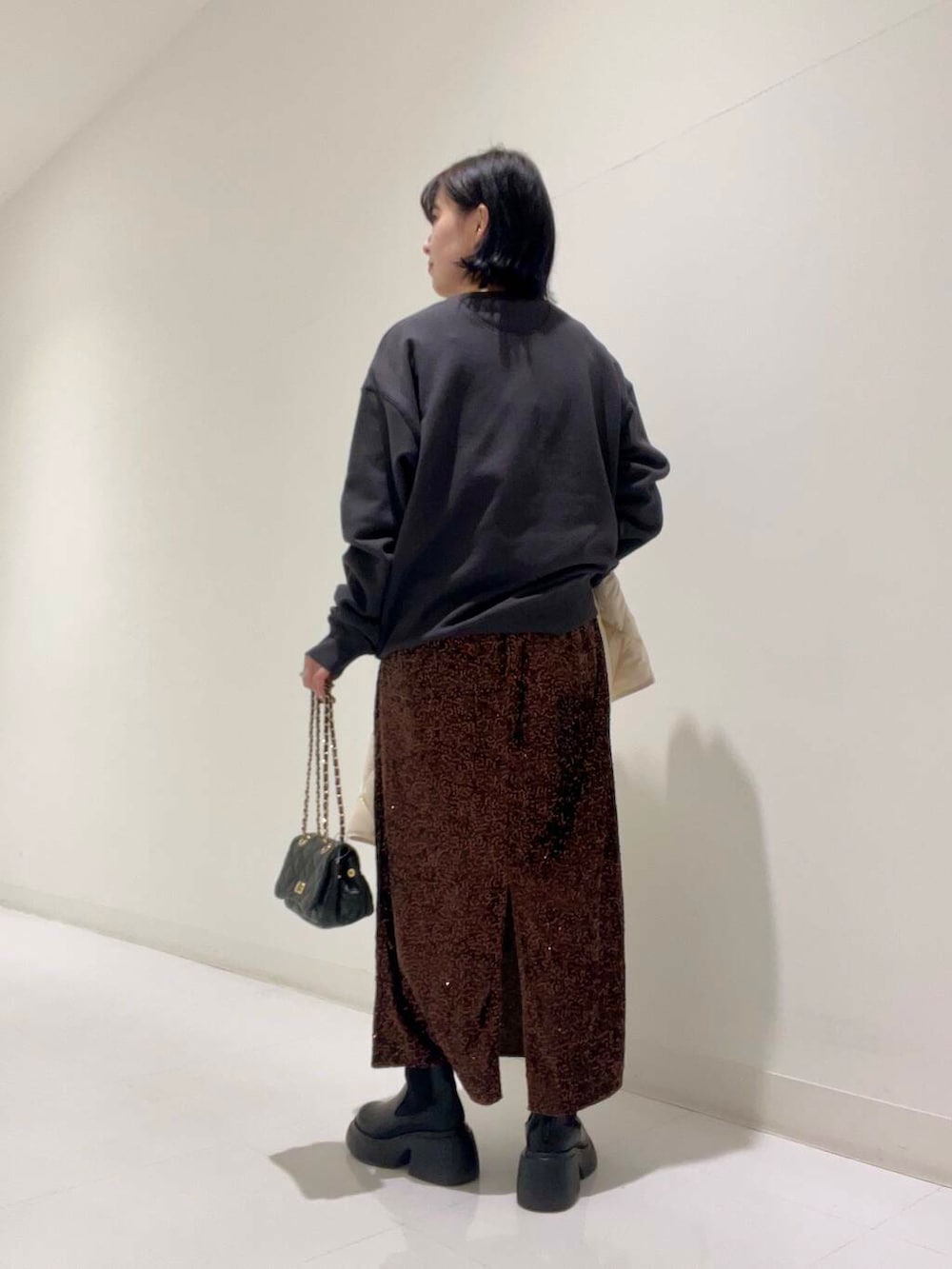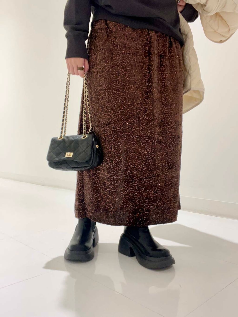 スパンコールスカートは丸山玲さんコラボアイテムです!シンプルなトップスに合わせて、素材感で一気に洒落感を演出できます◎