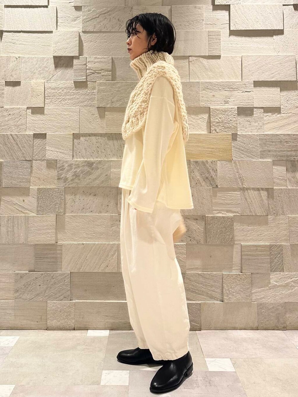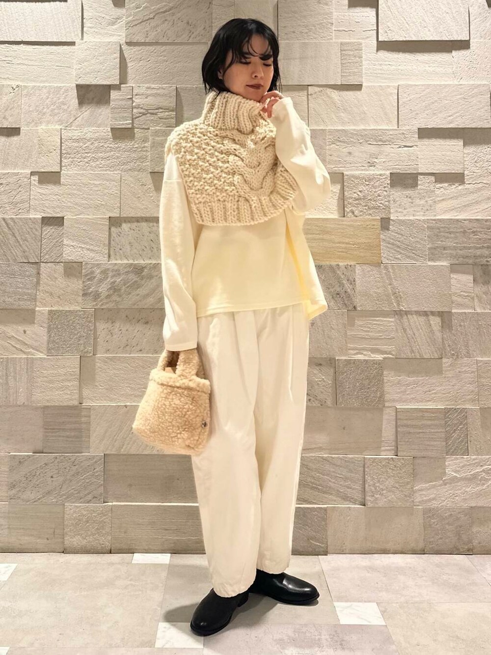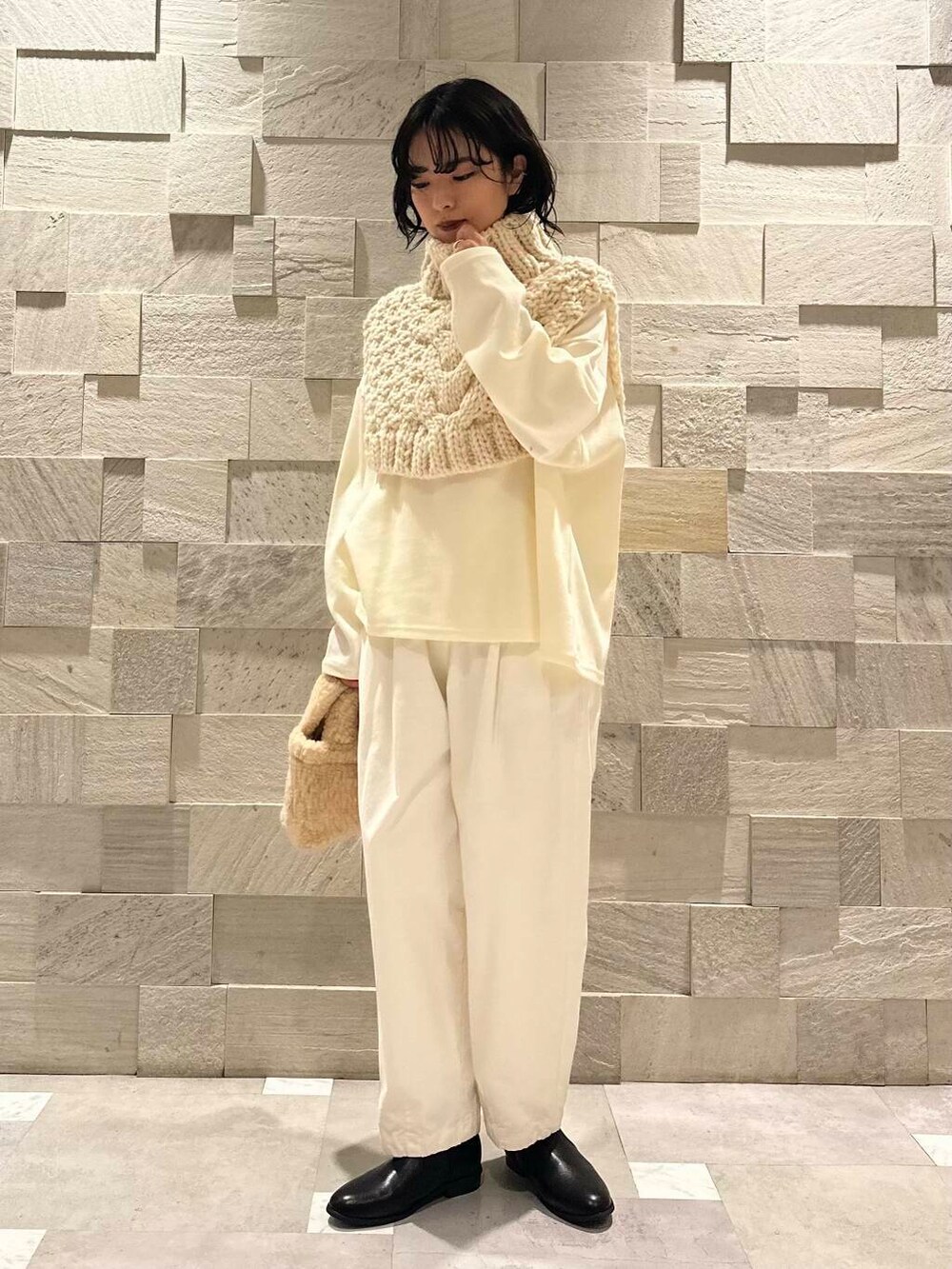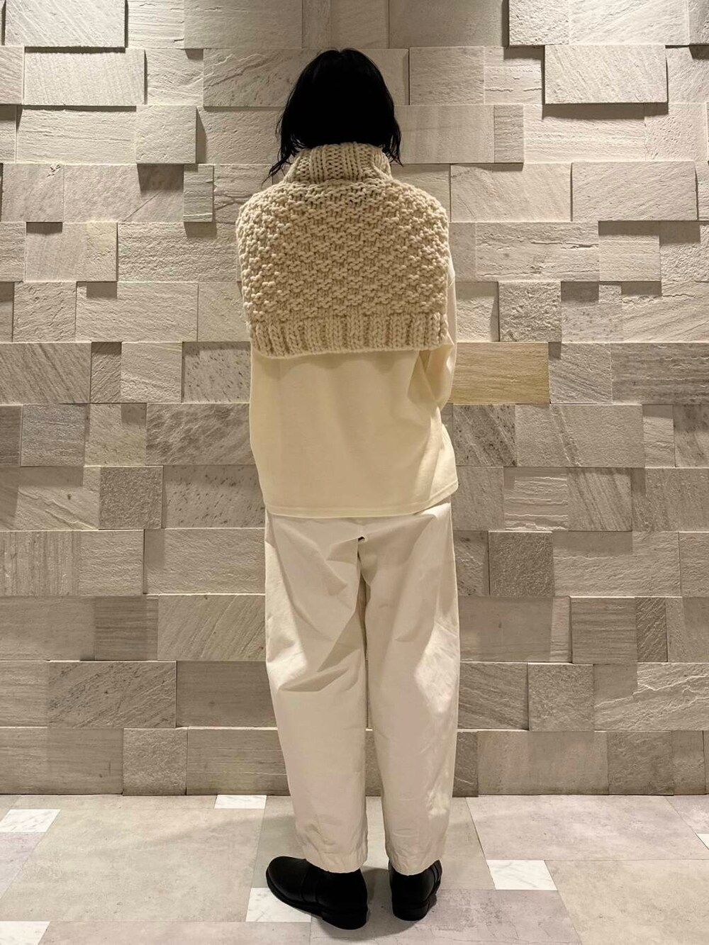 一見扱いの難しそうなニットウォーマーですが、シンプルなトップスにかぶるだけでなんだか様になる…。これは冬活躍しそうなアイテムです。