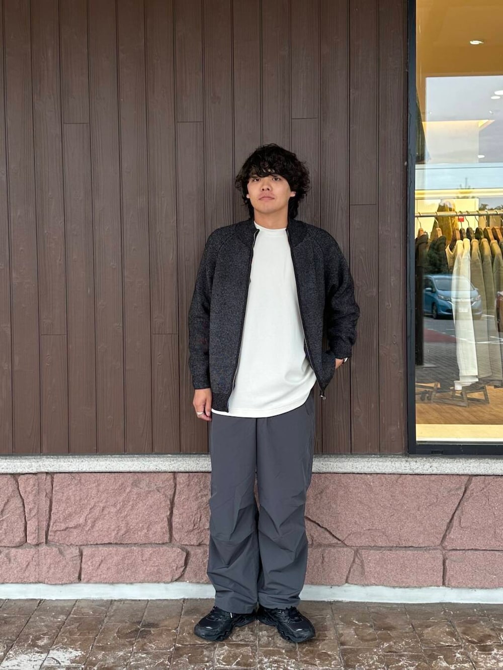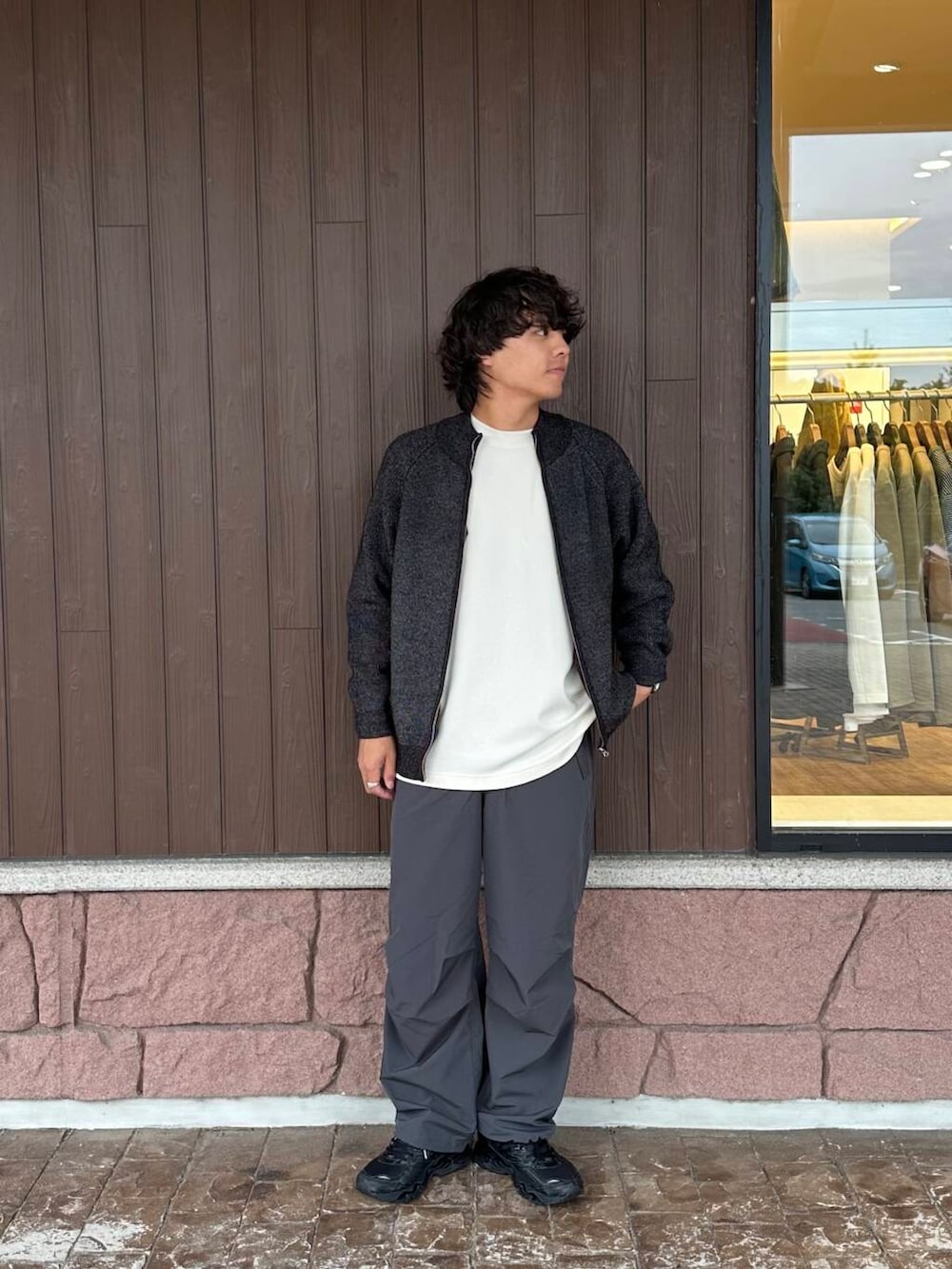 シックにモノトーンで固めましたが、スニーカーをボリュームのあるものにしているのがポイントです。