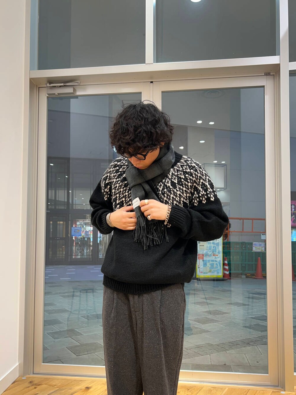 ニットの柄が激しいのでマフラーは落ち着いたトーンを