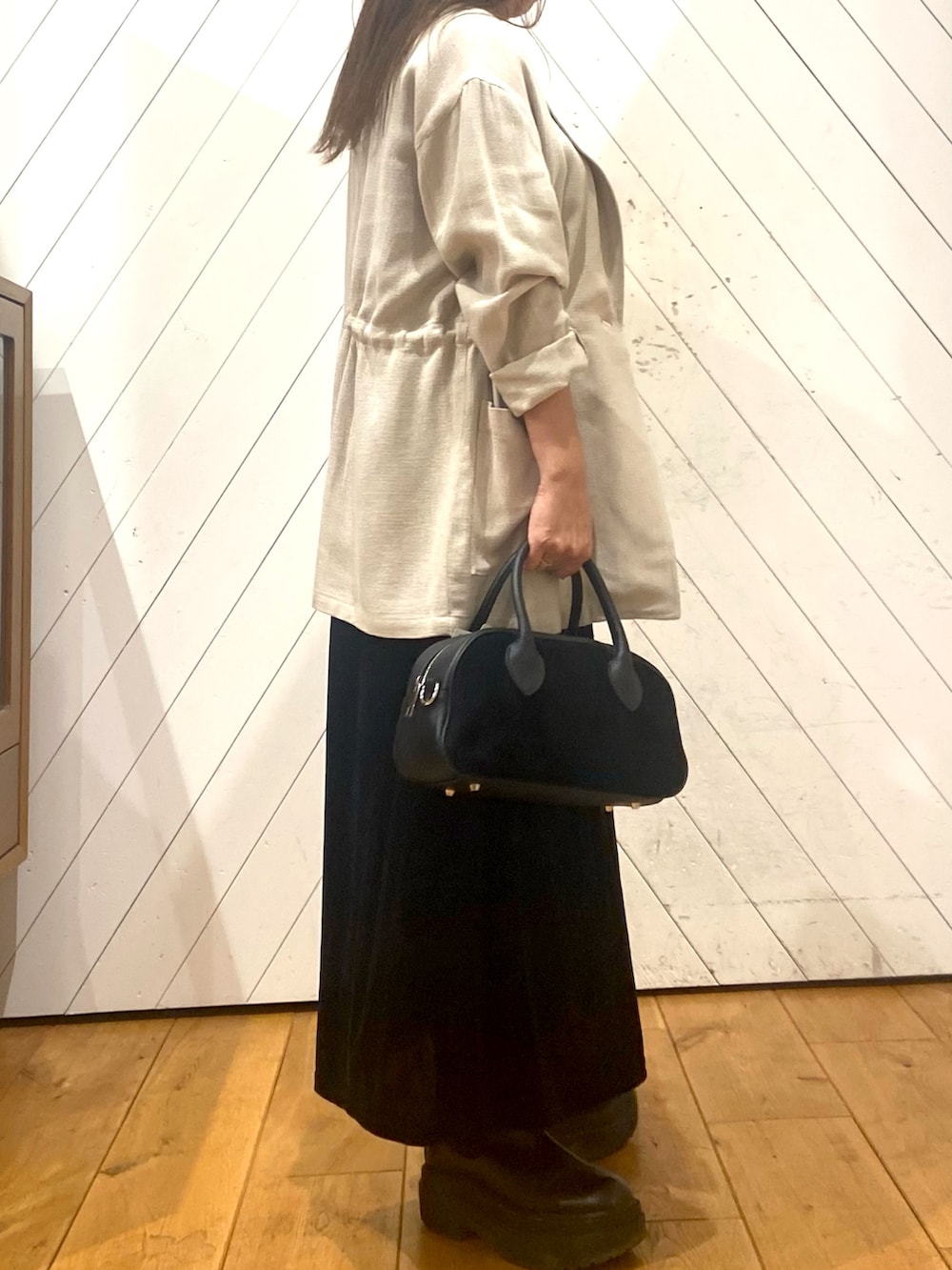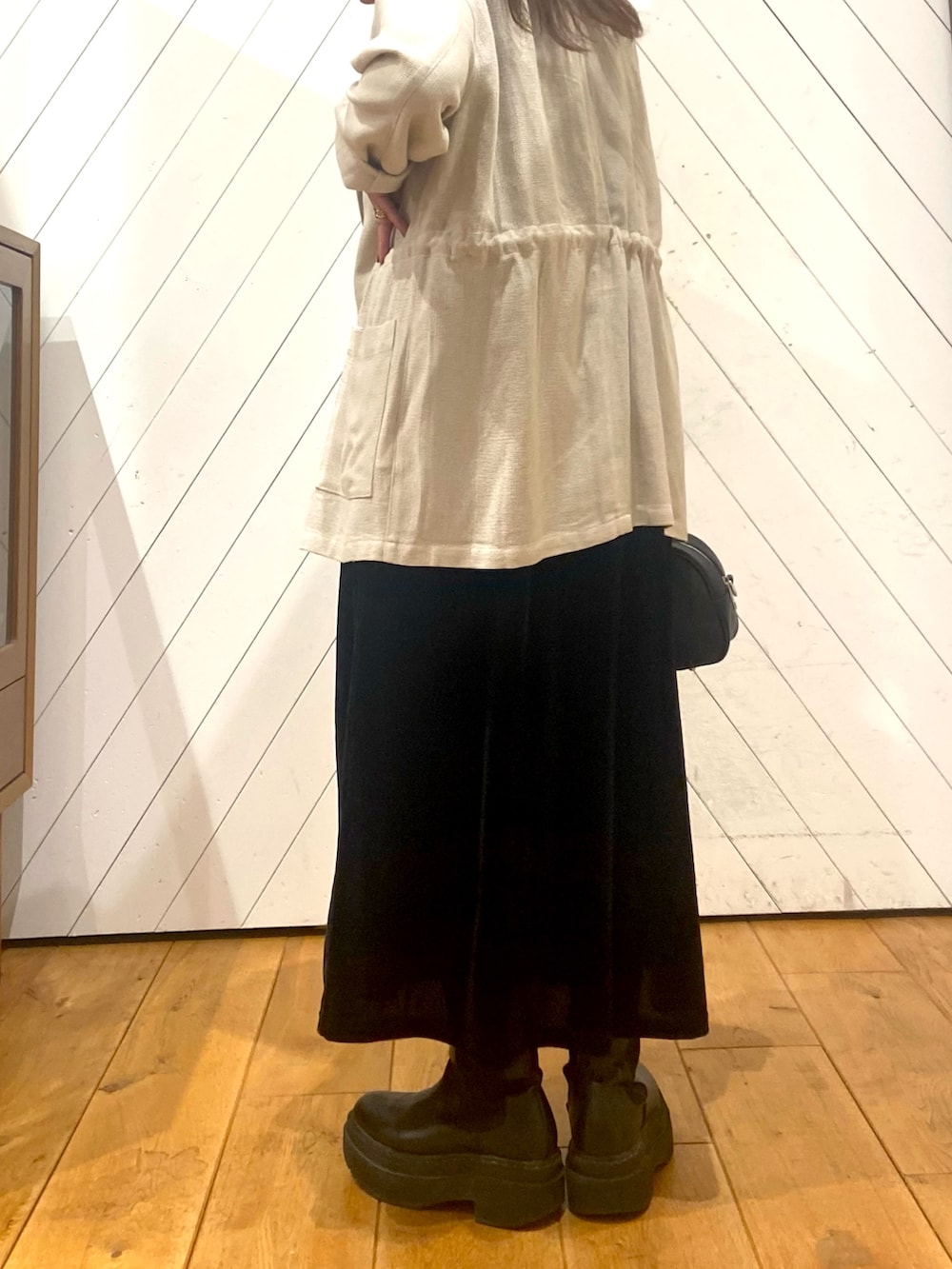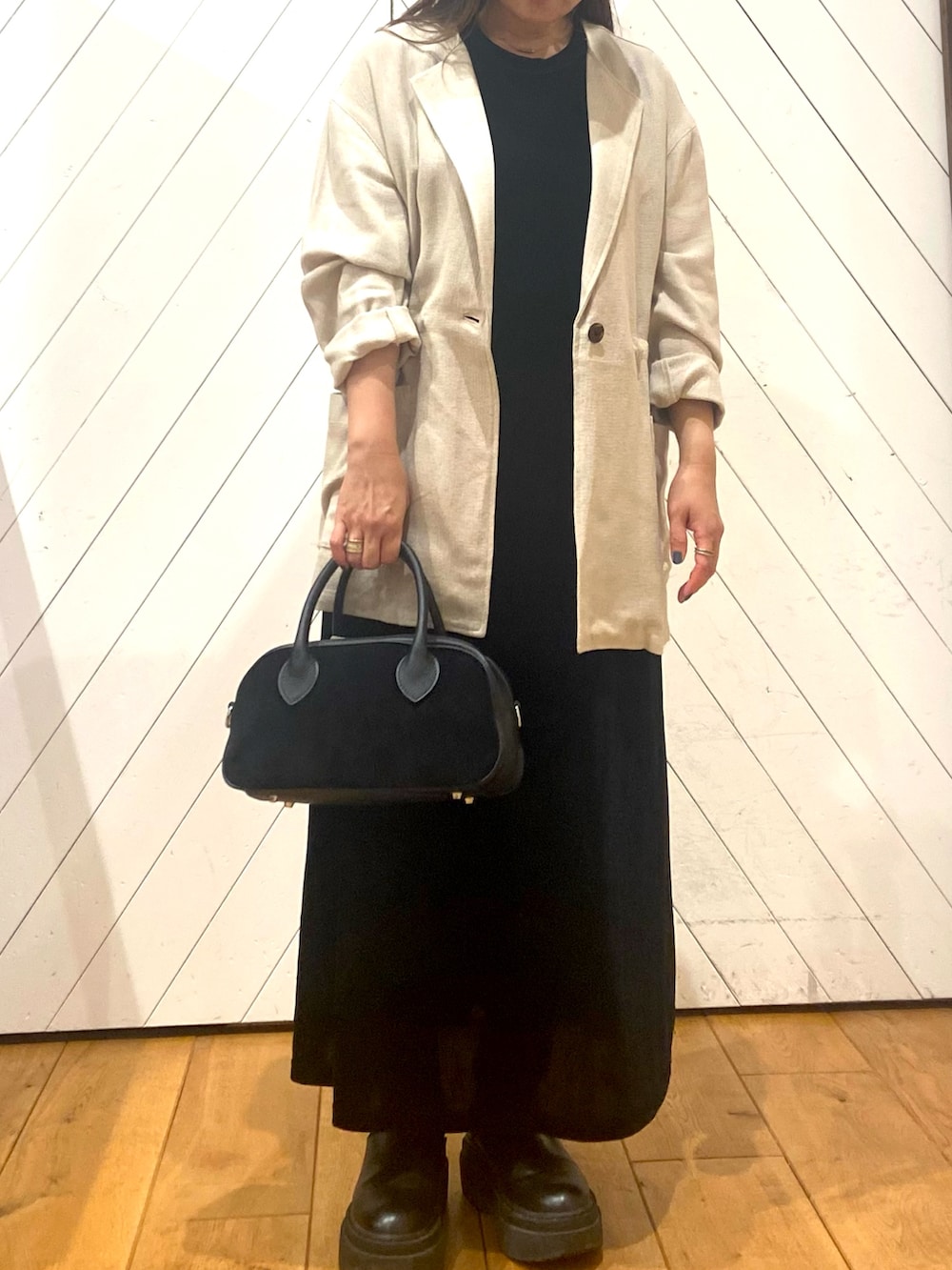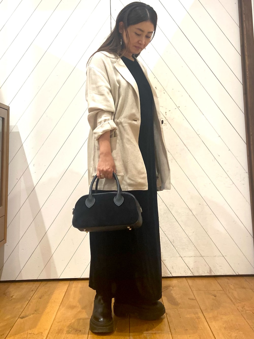 シンプルなベロア調のワンピに、ゆるっとしたジャケットをあわせて、きれいめカジュアルコーデです。