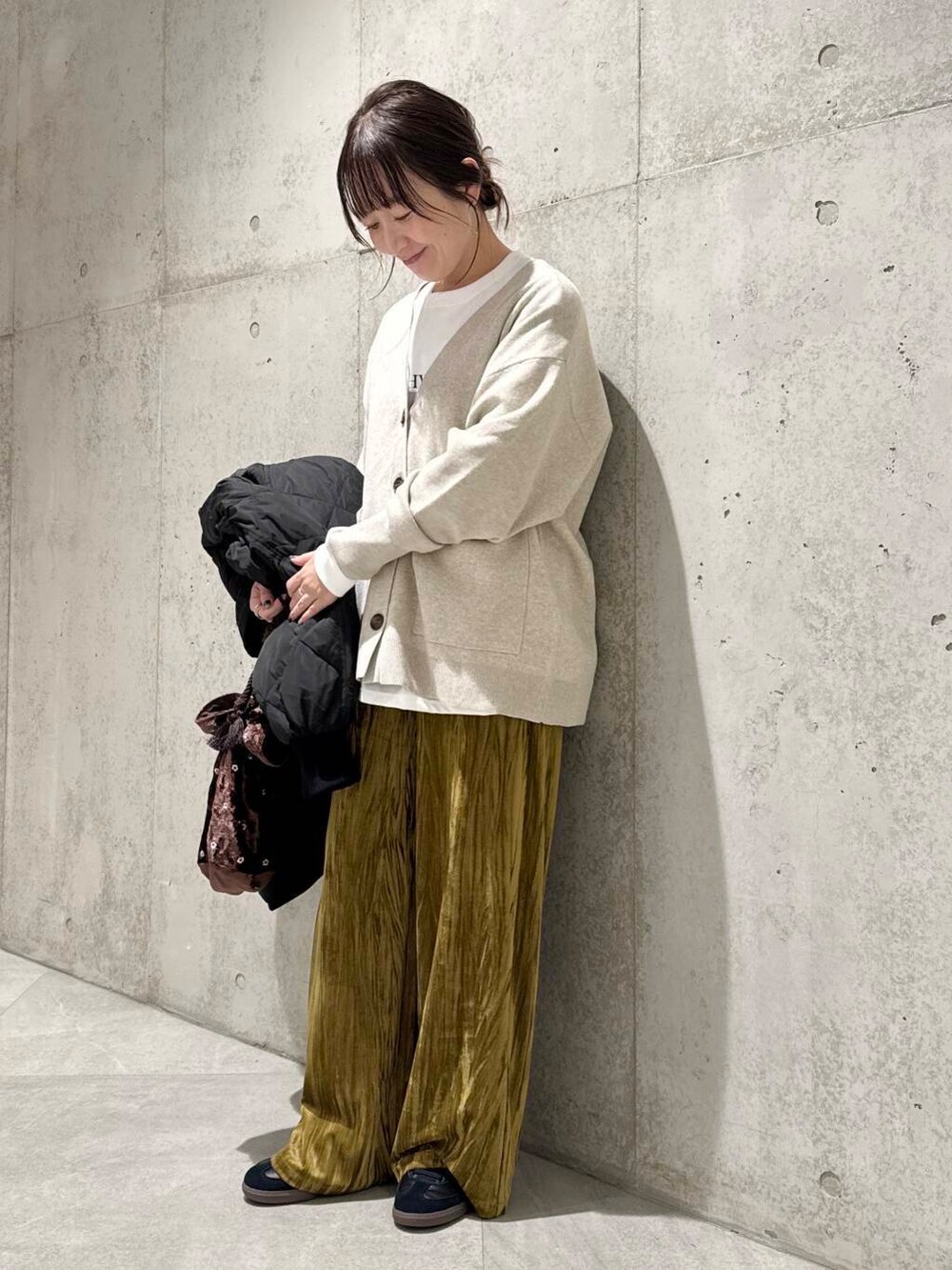 今回は、ベロアパンツのオリーブカラーをアクセントにしたコーディネート。
