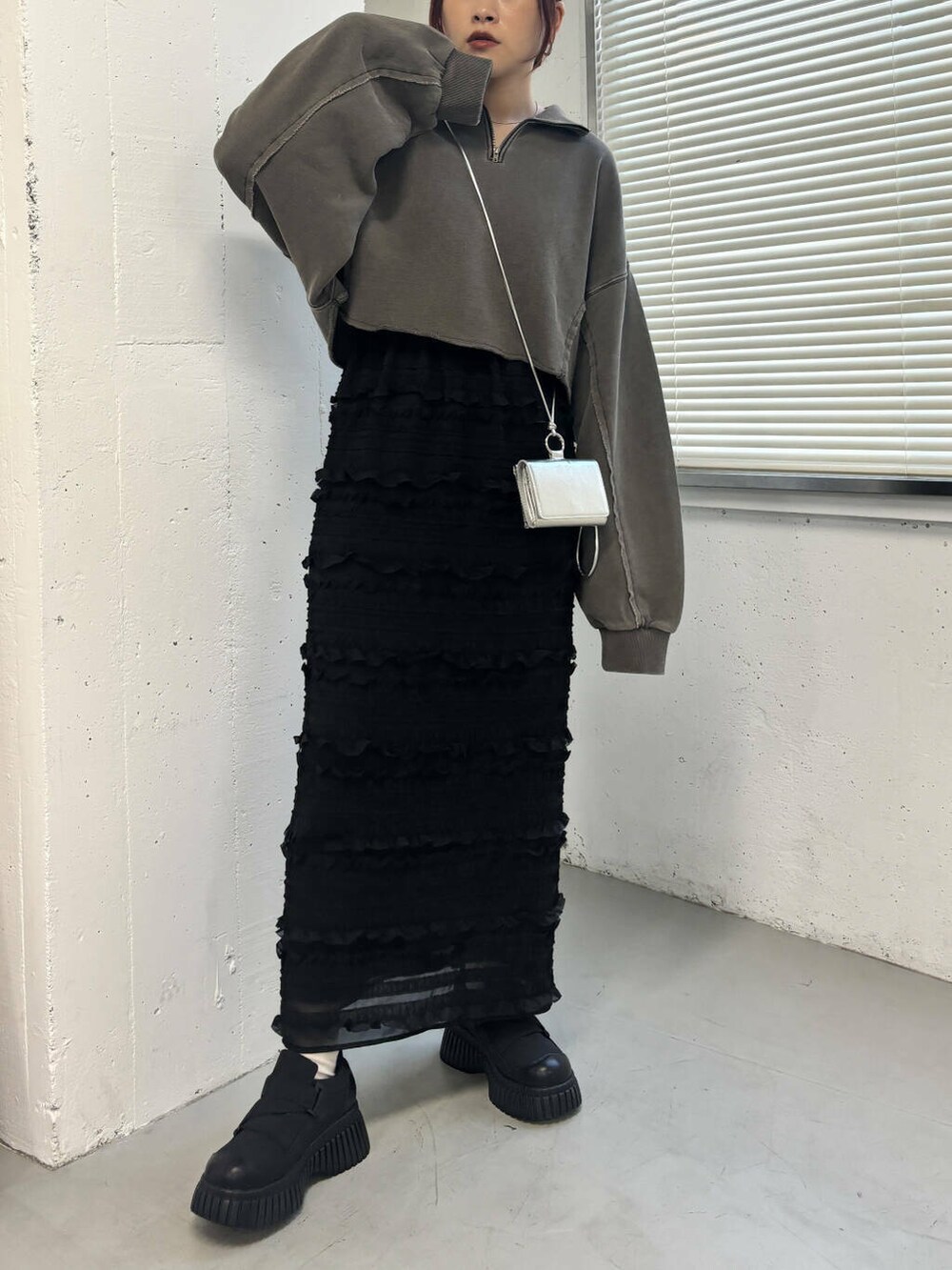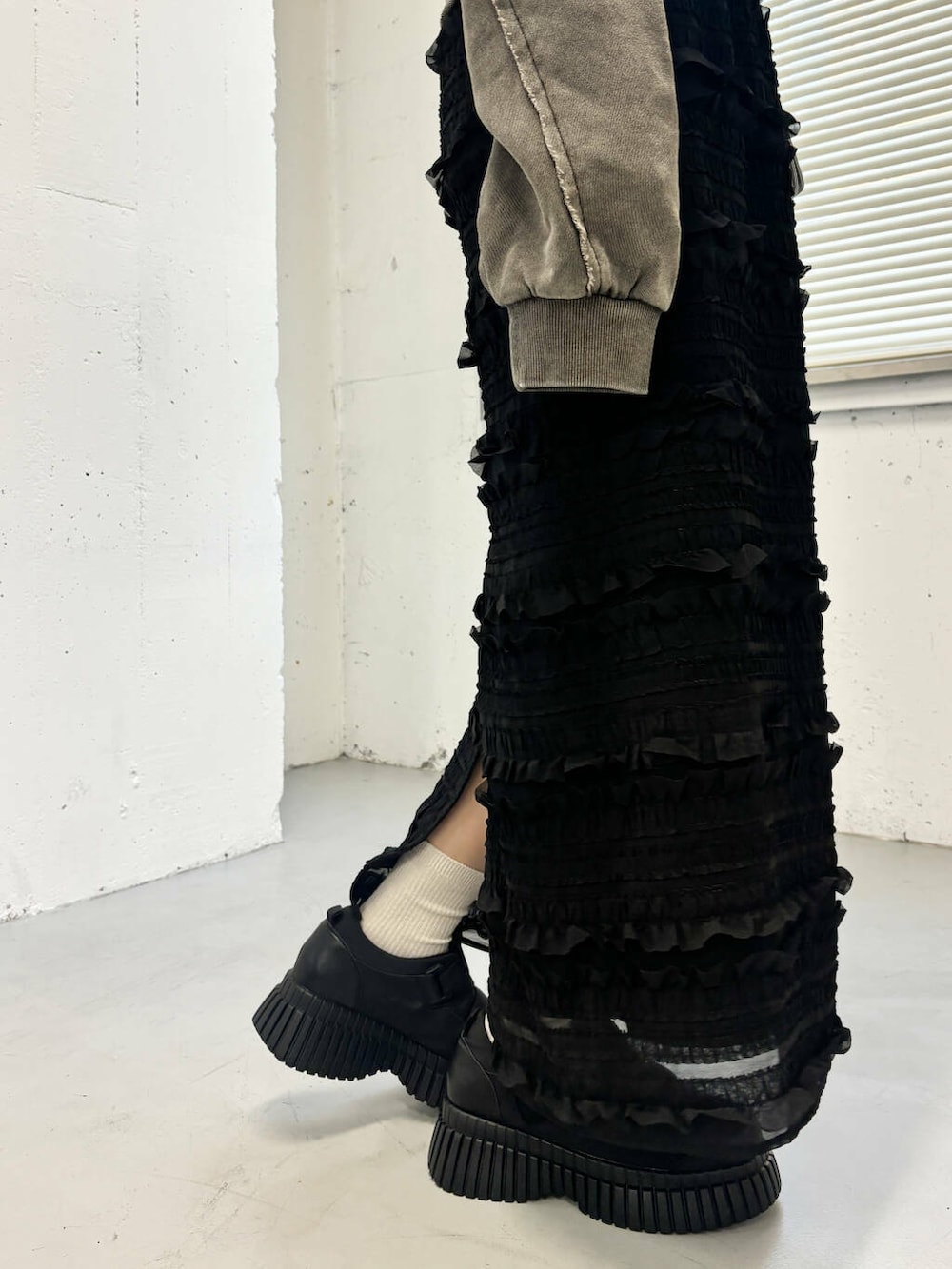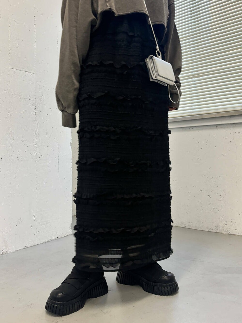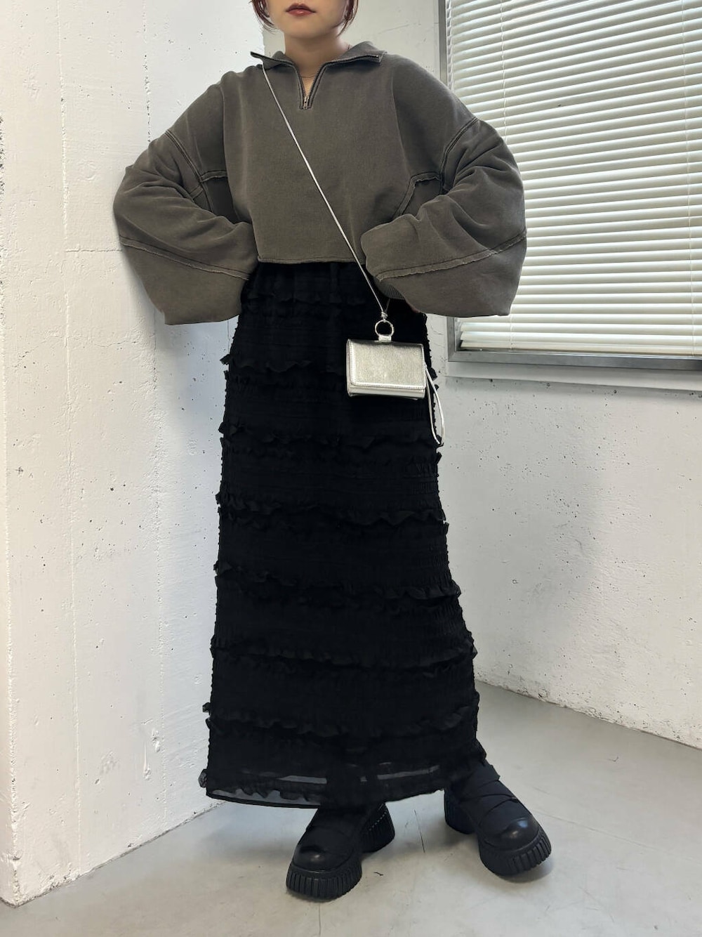 フリフリの着やせスカートと合わせて大人ガーリーコーデに◎