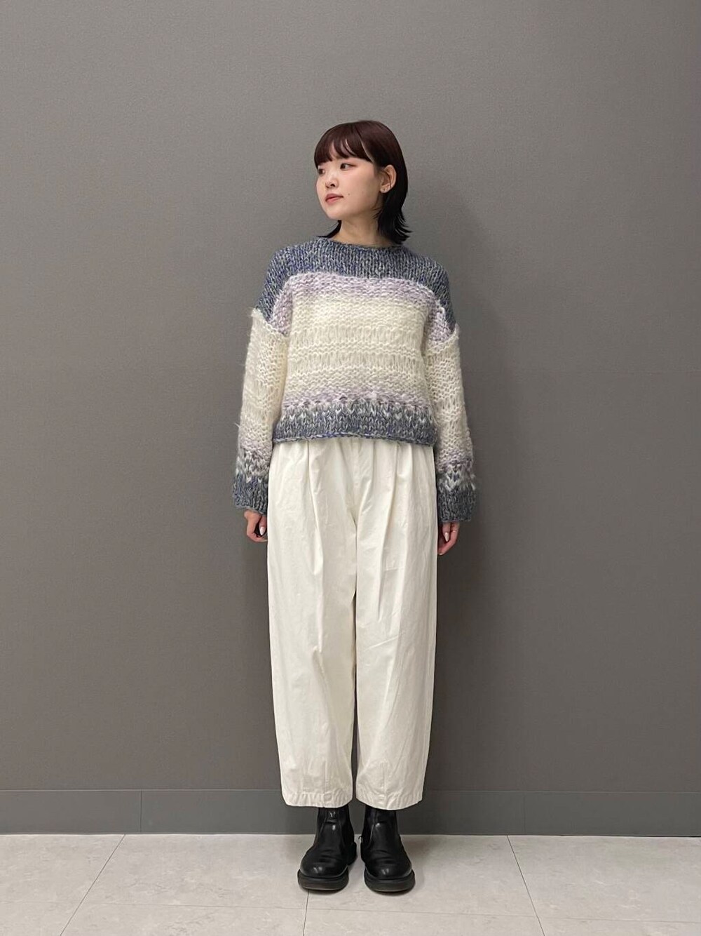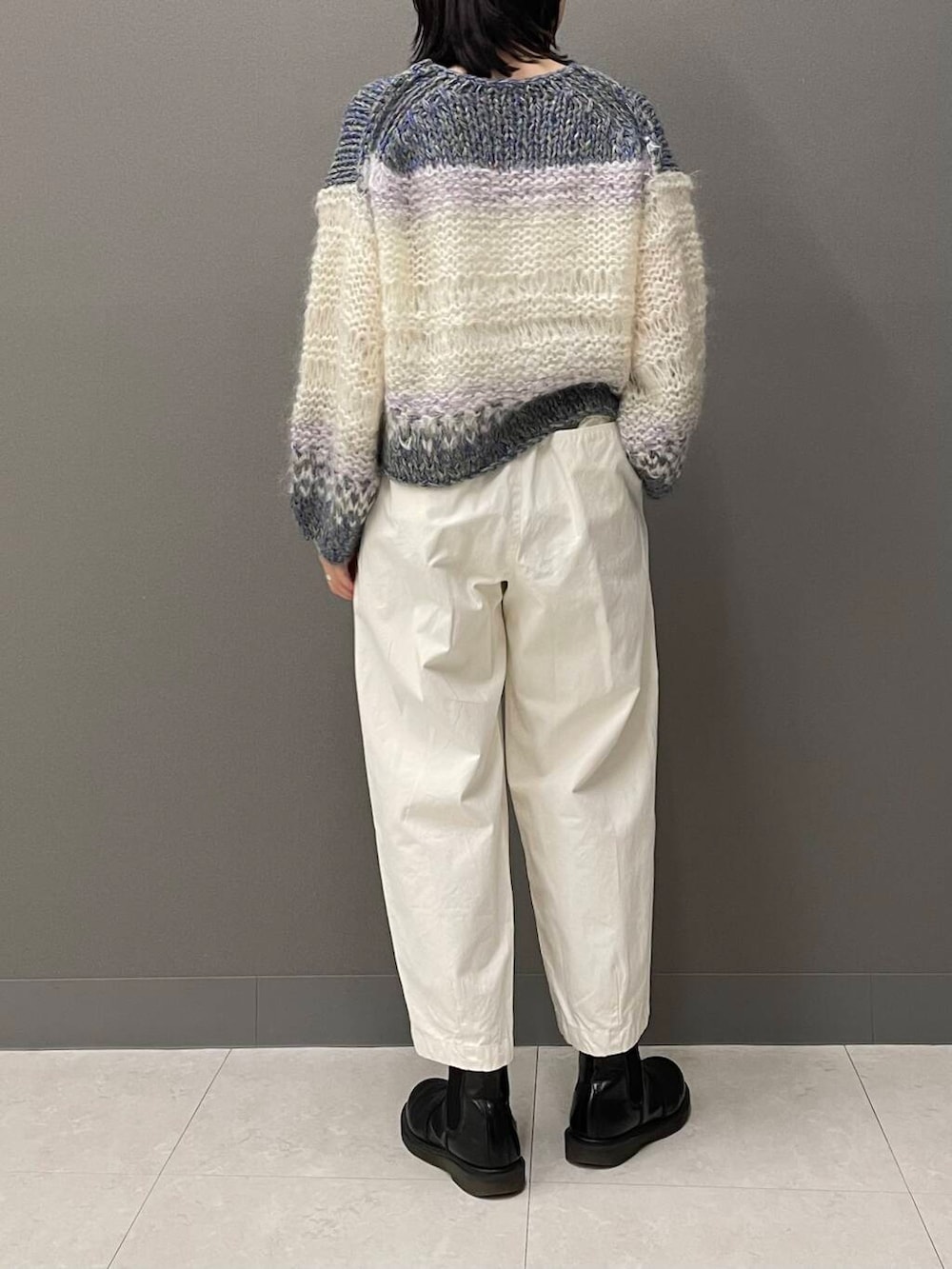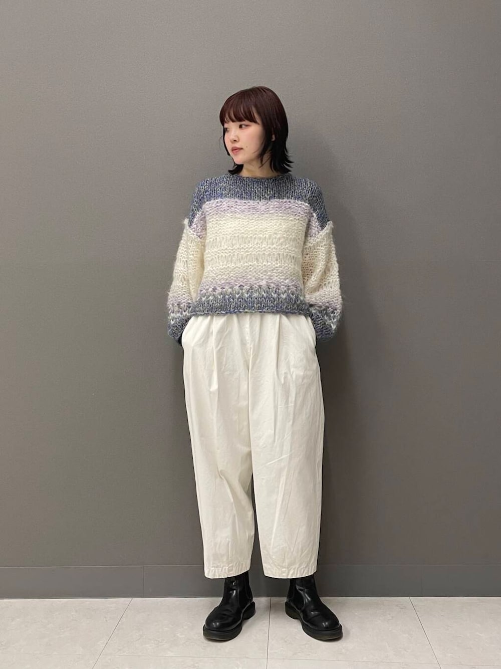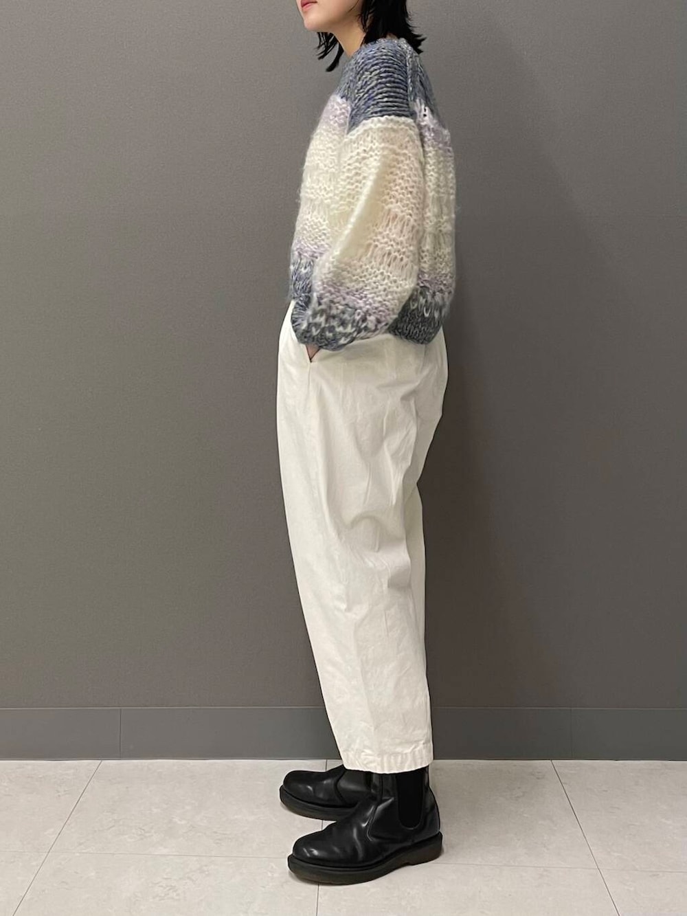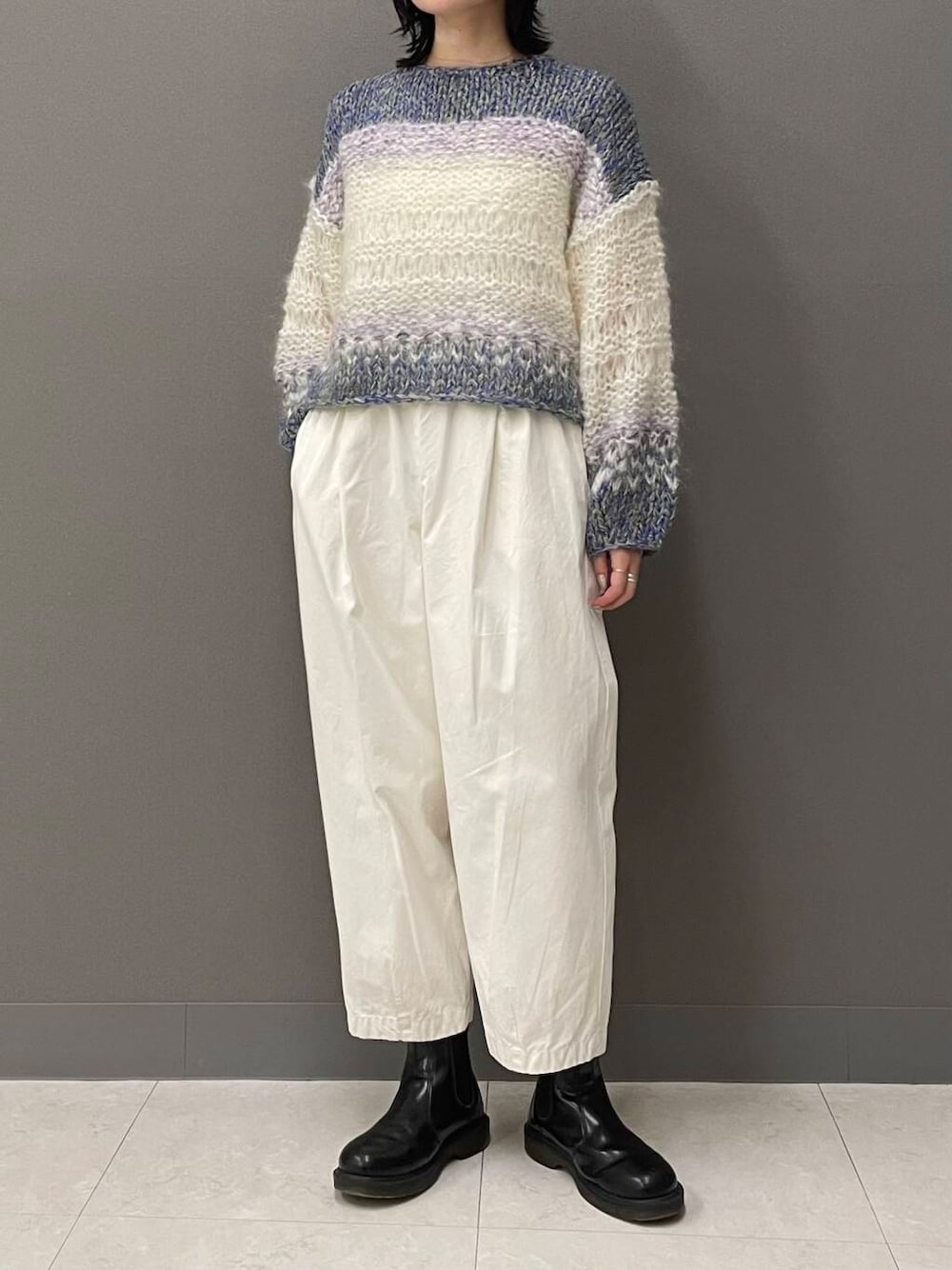 ニットのカラーを引き立たせたかったので、真っ白なコットンクロップドパンツを合わせました。