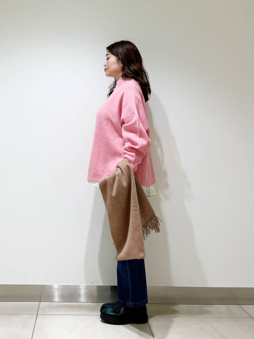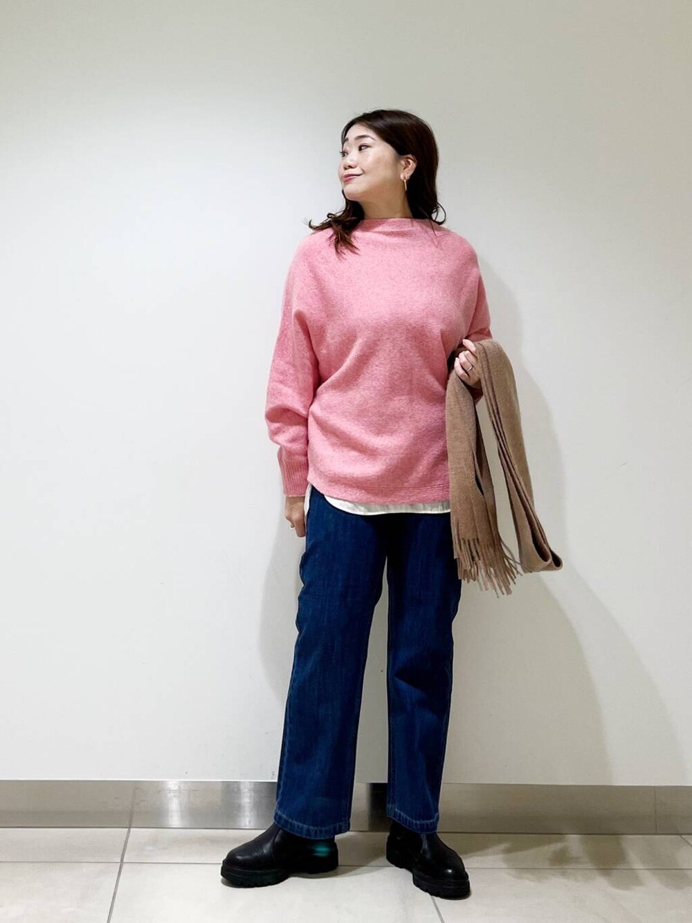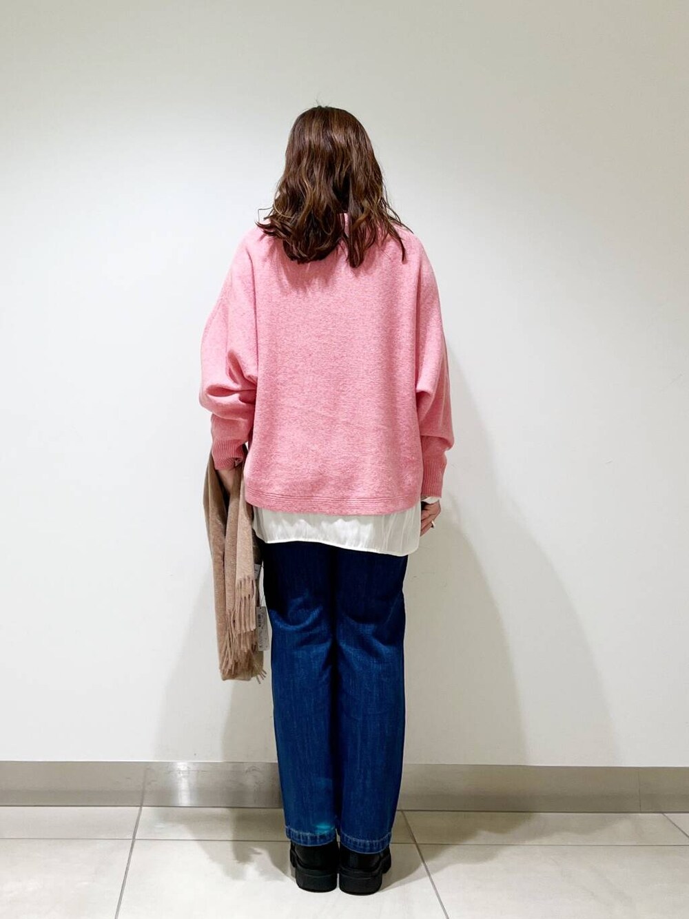カジュアルなスタイリングにこそ、なめらかなお素材のものを合わせて女性らしさを演出するのが