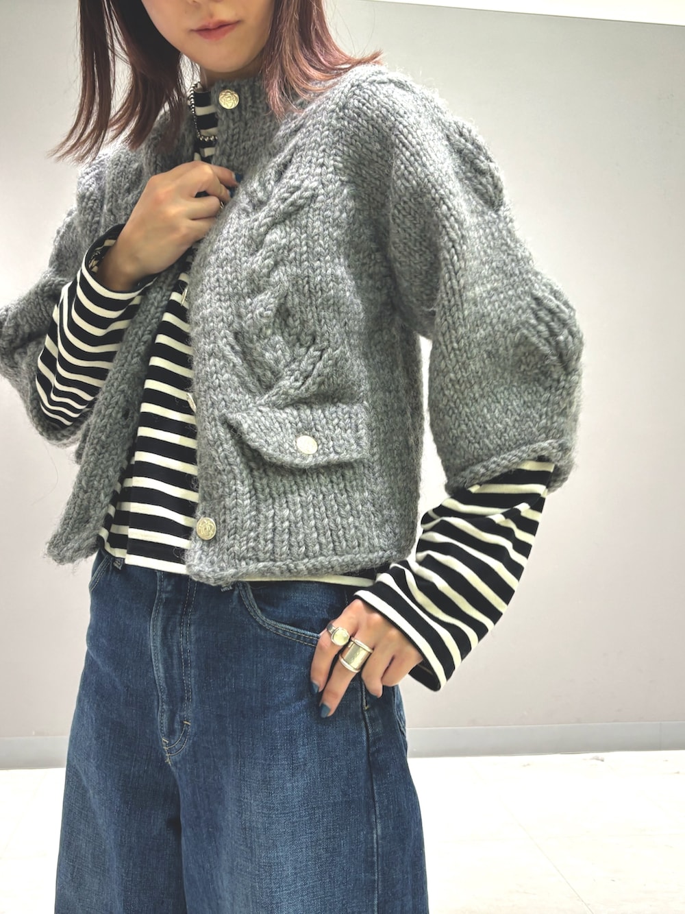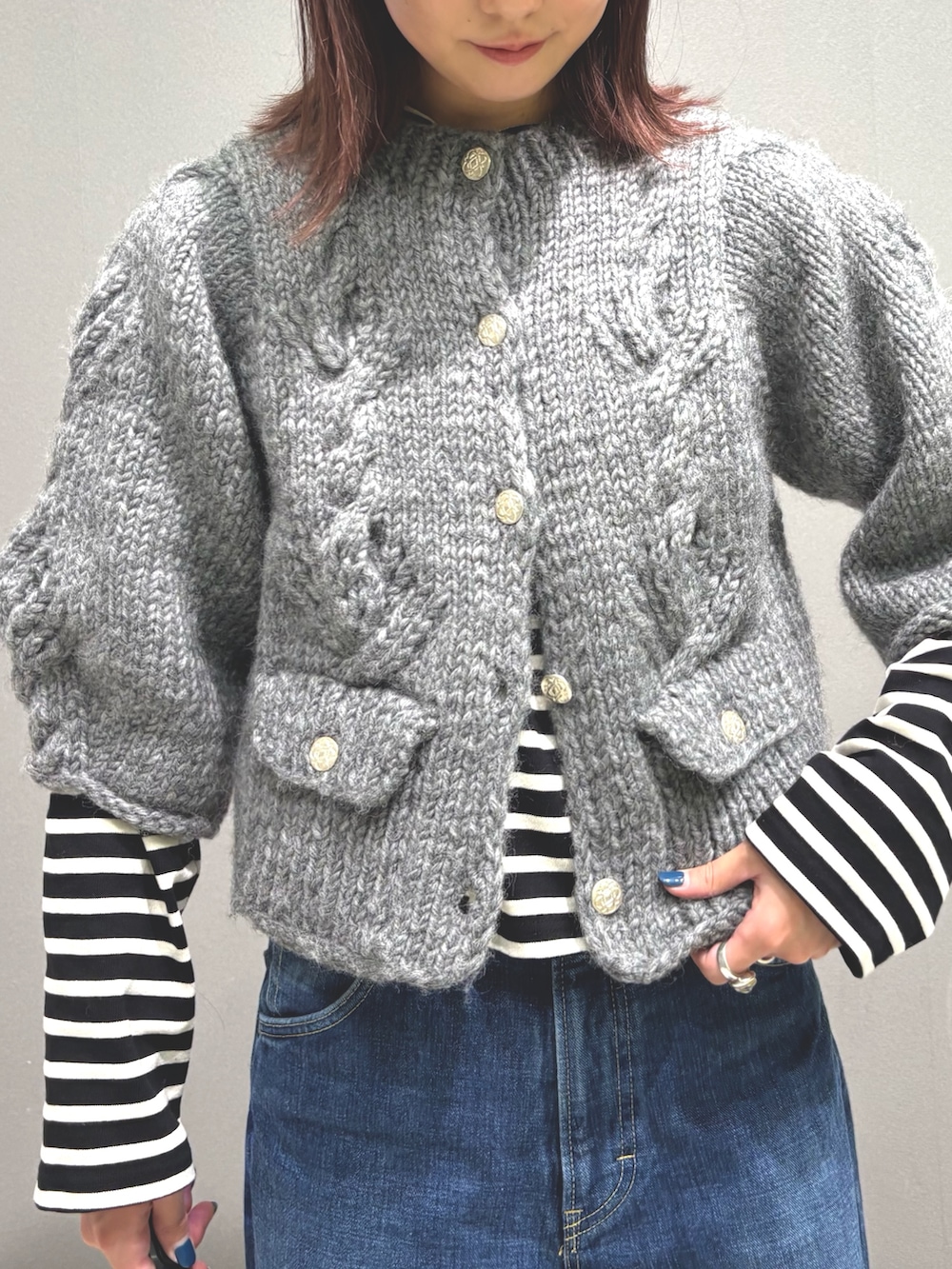 シルバーのボタンがアクセントになっており、ジャケットのような上品さもあるカーディガン◎