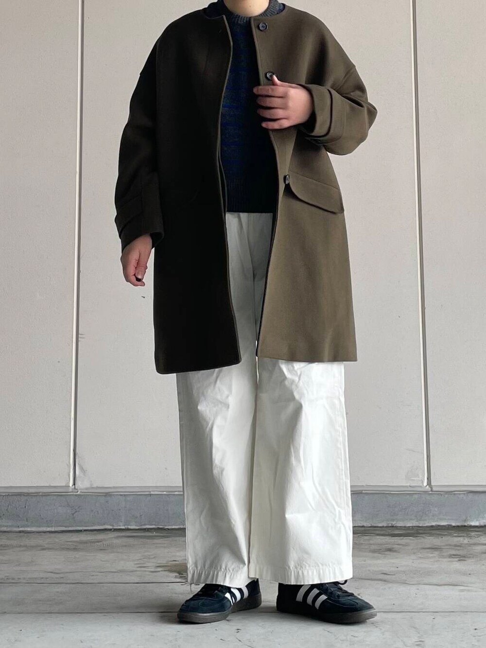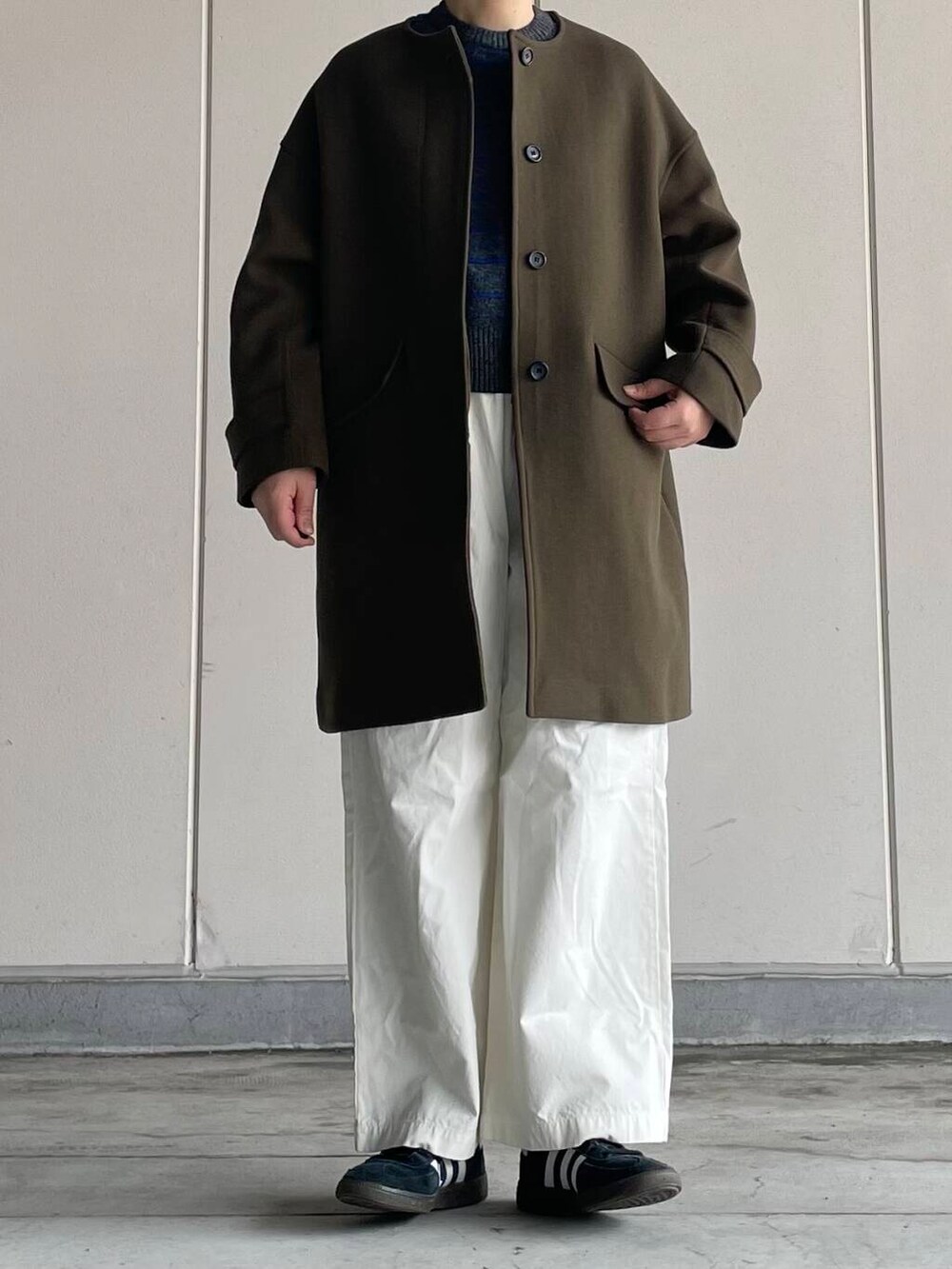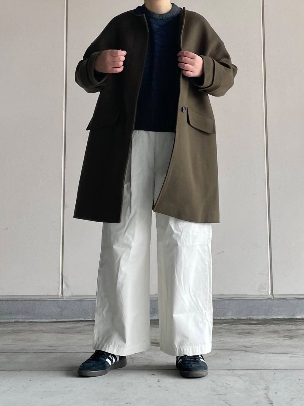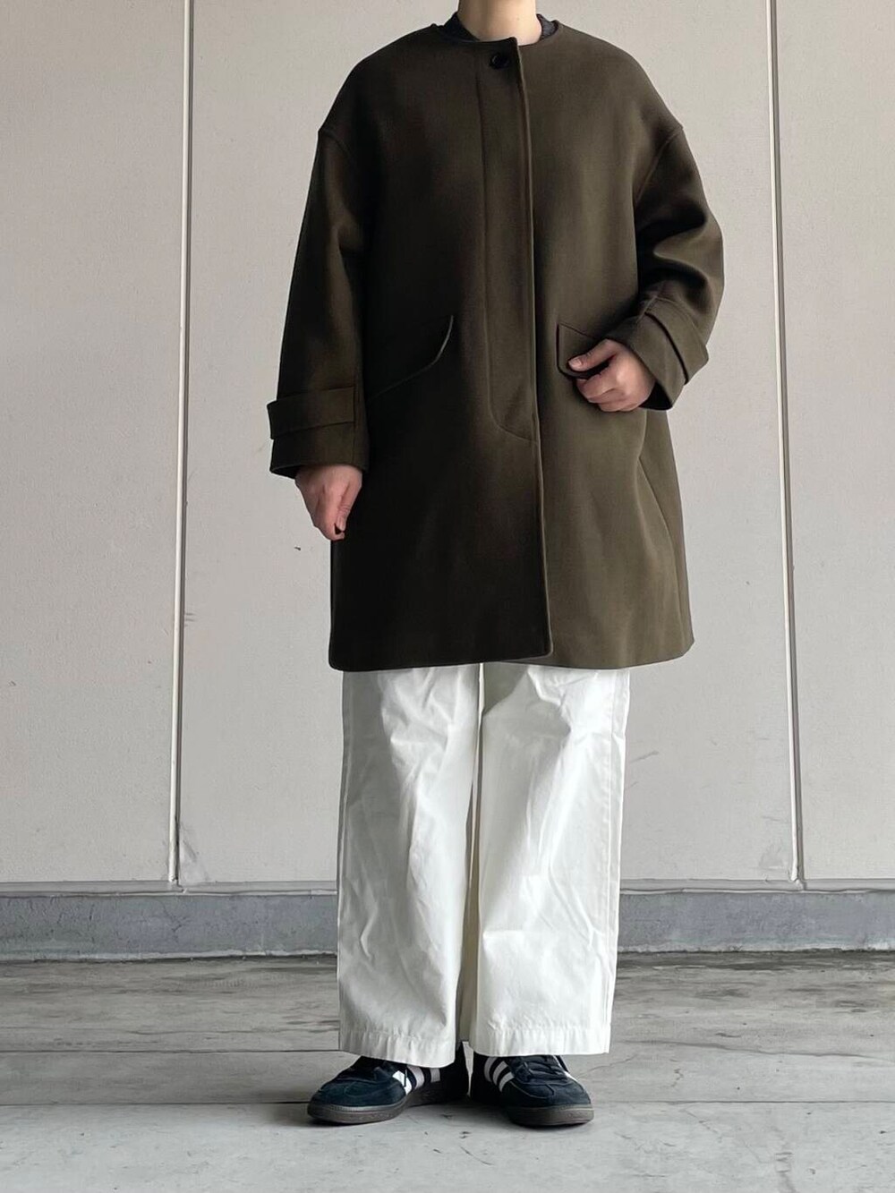 ウールのノーカラーは上品な印象で、大人の雰囲気に。