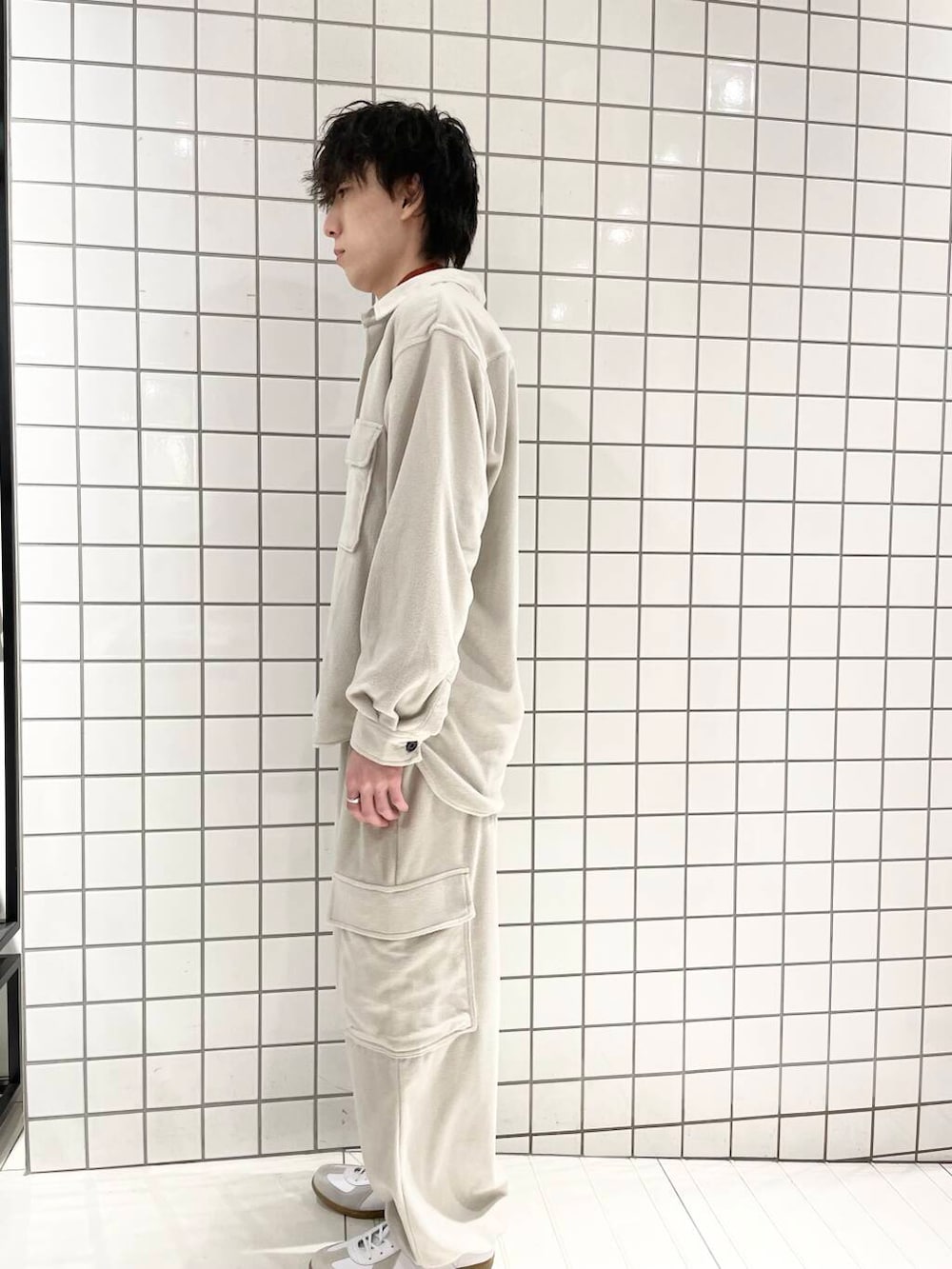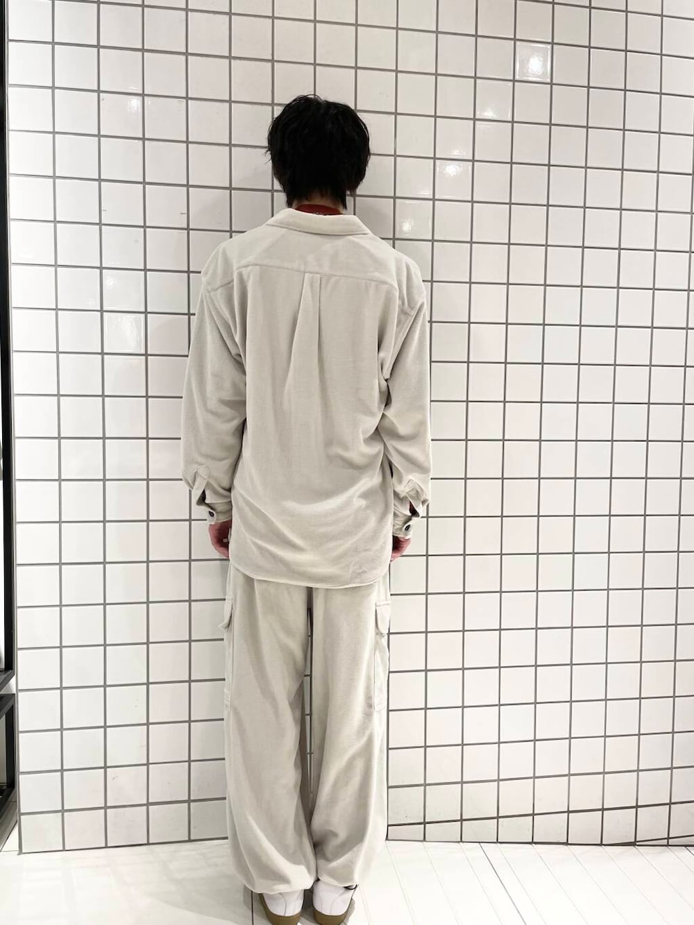 フリースのセットアップを使ったラフなホワイトコーディネートになります。