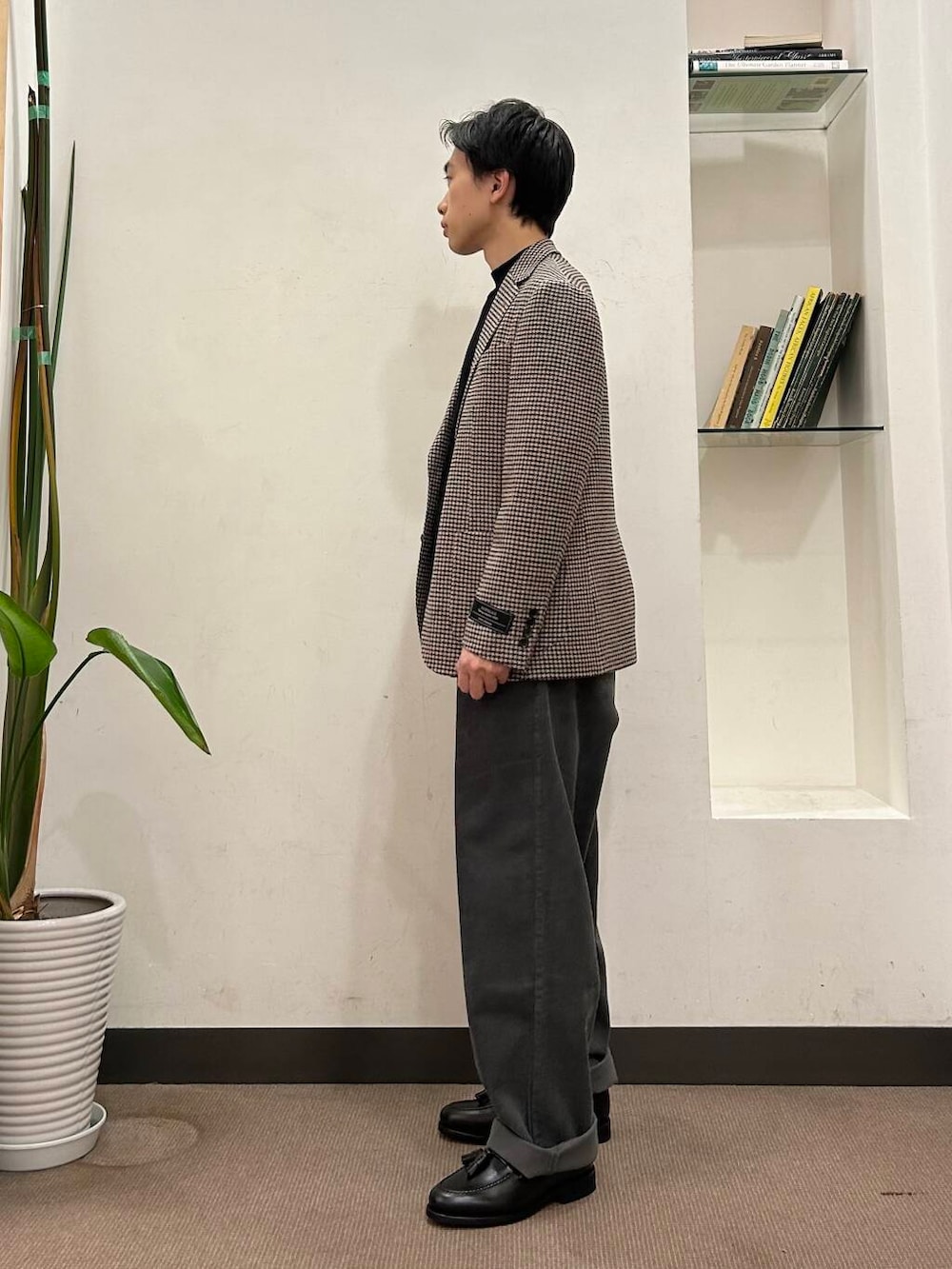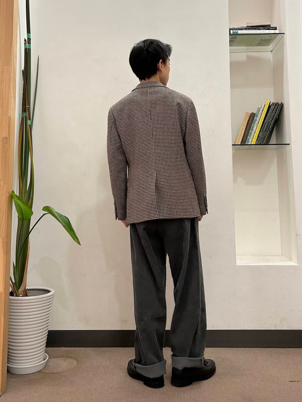 粗野感がある生地と、やわらかいブラウンの千鳥格子が、クラシックな印象はありつつ、程よく抜け感を出してくれるジャケットです。